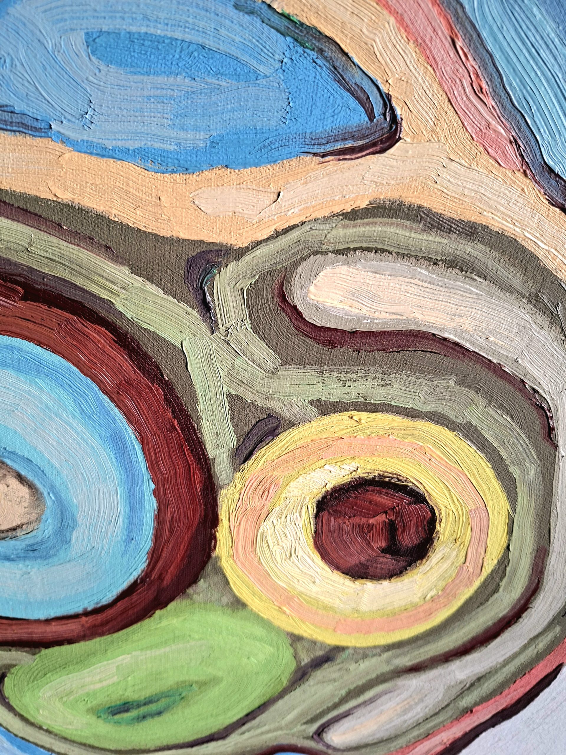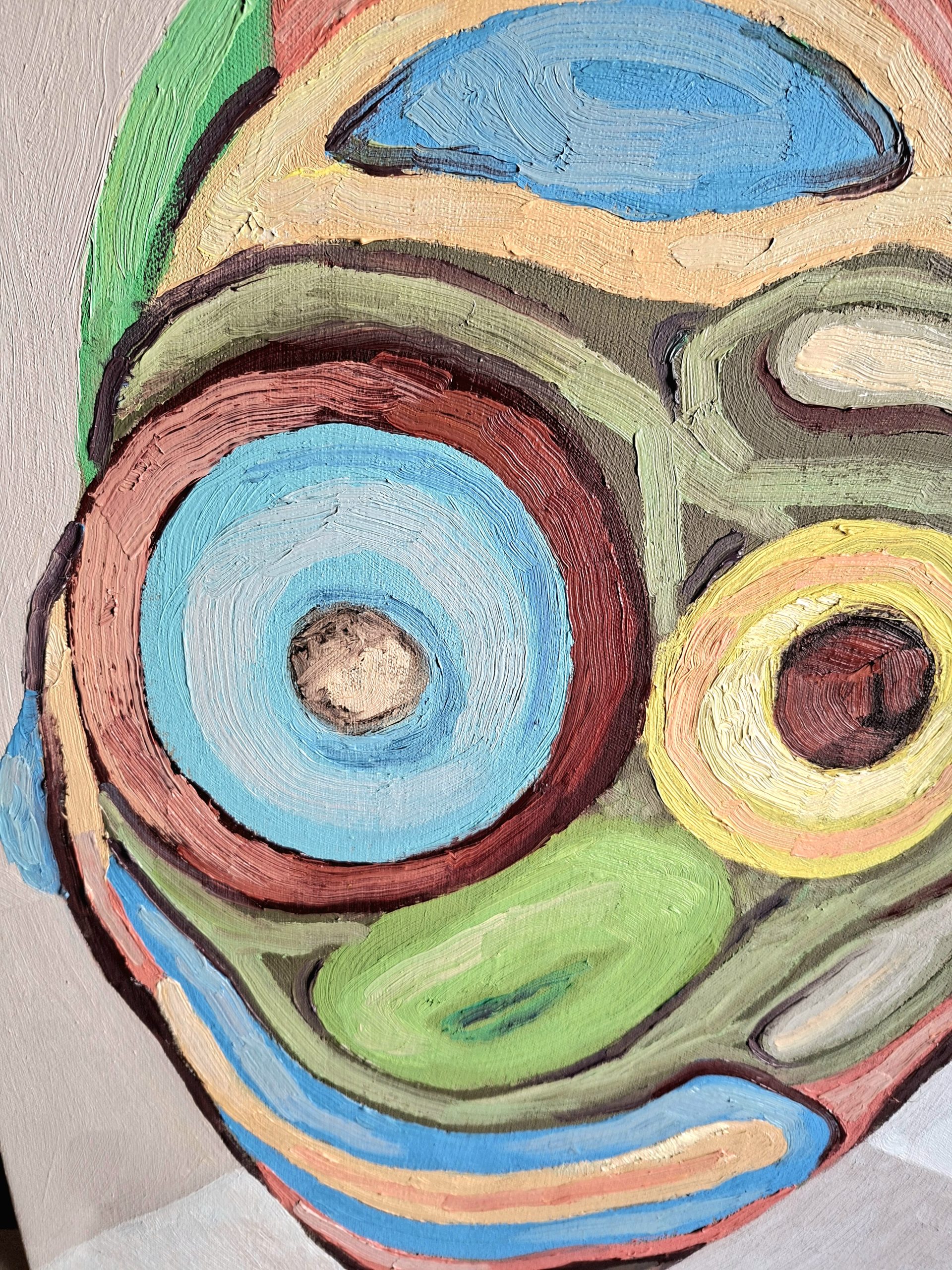 In this piece, I’ve translated the concept of a persona into a visceral arrangement of concentric circles and rhythmic textures. The composition uses a bold palette of emerald green, deep crimson, and electric blue to create a sense of depth and movement within the facial structure.