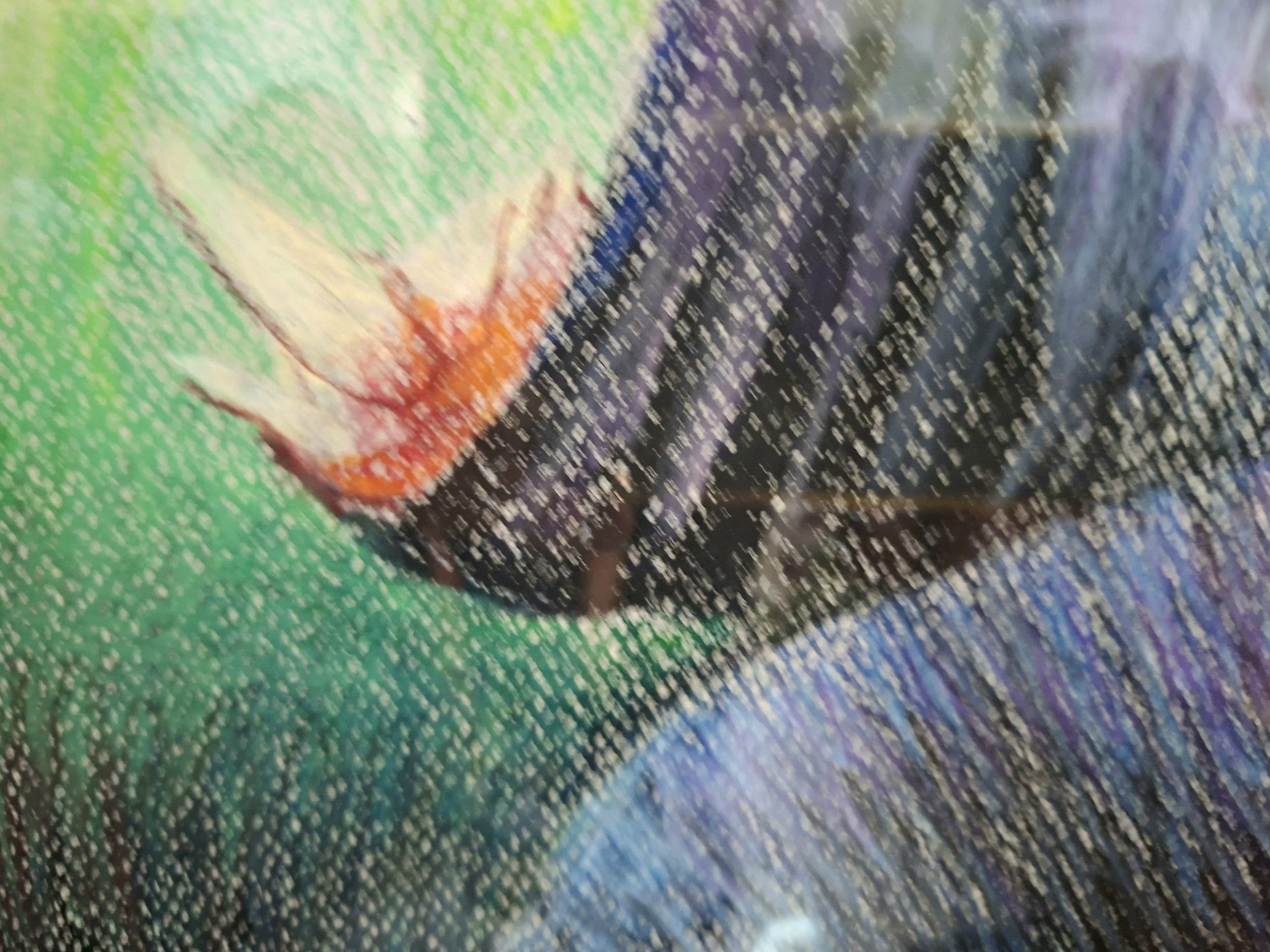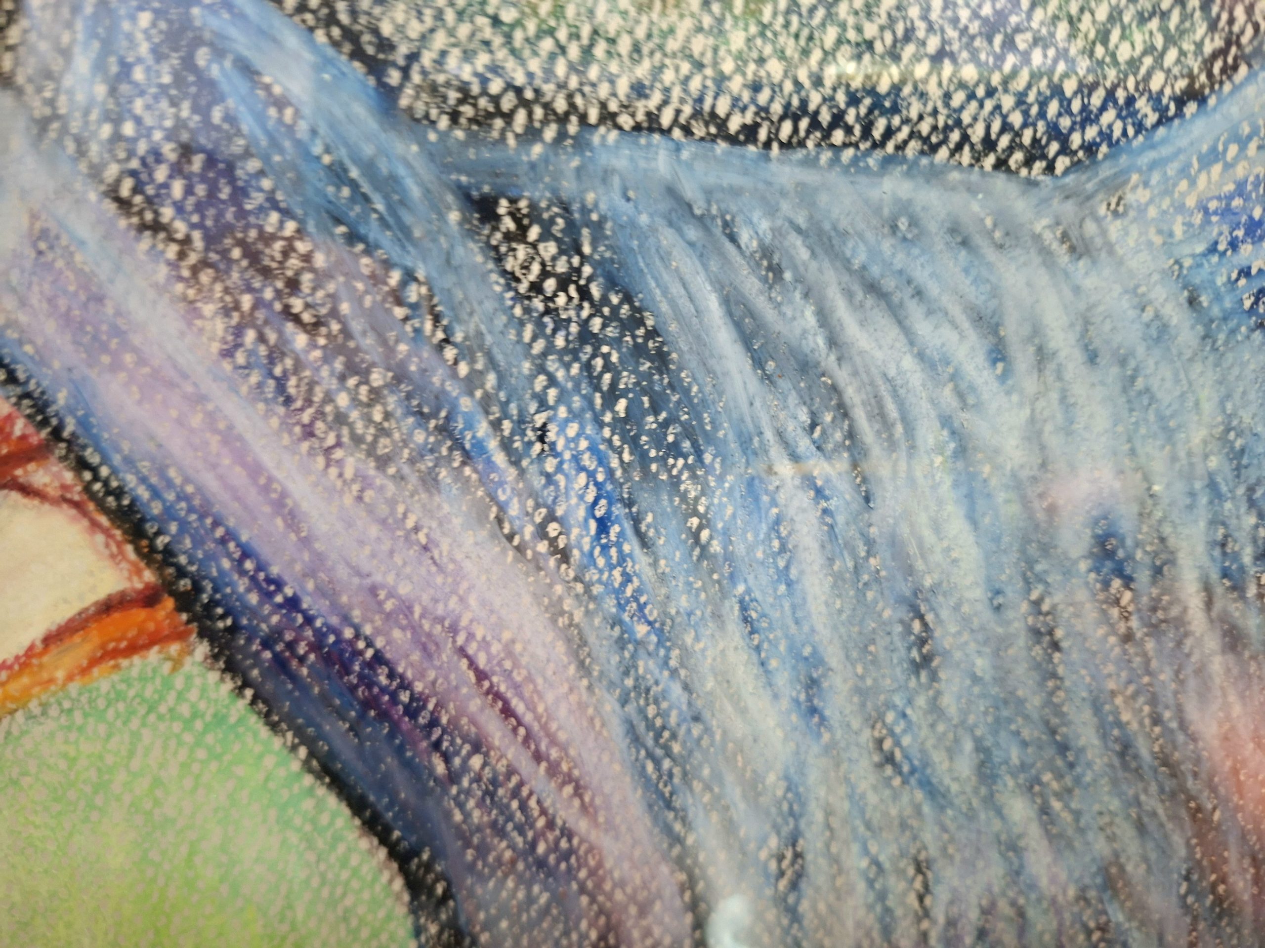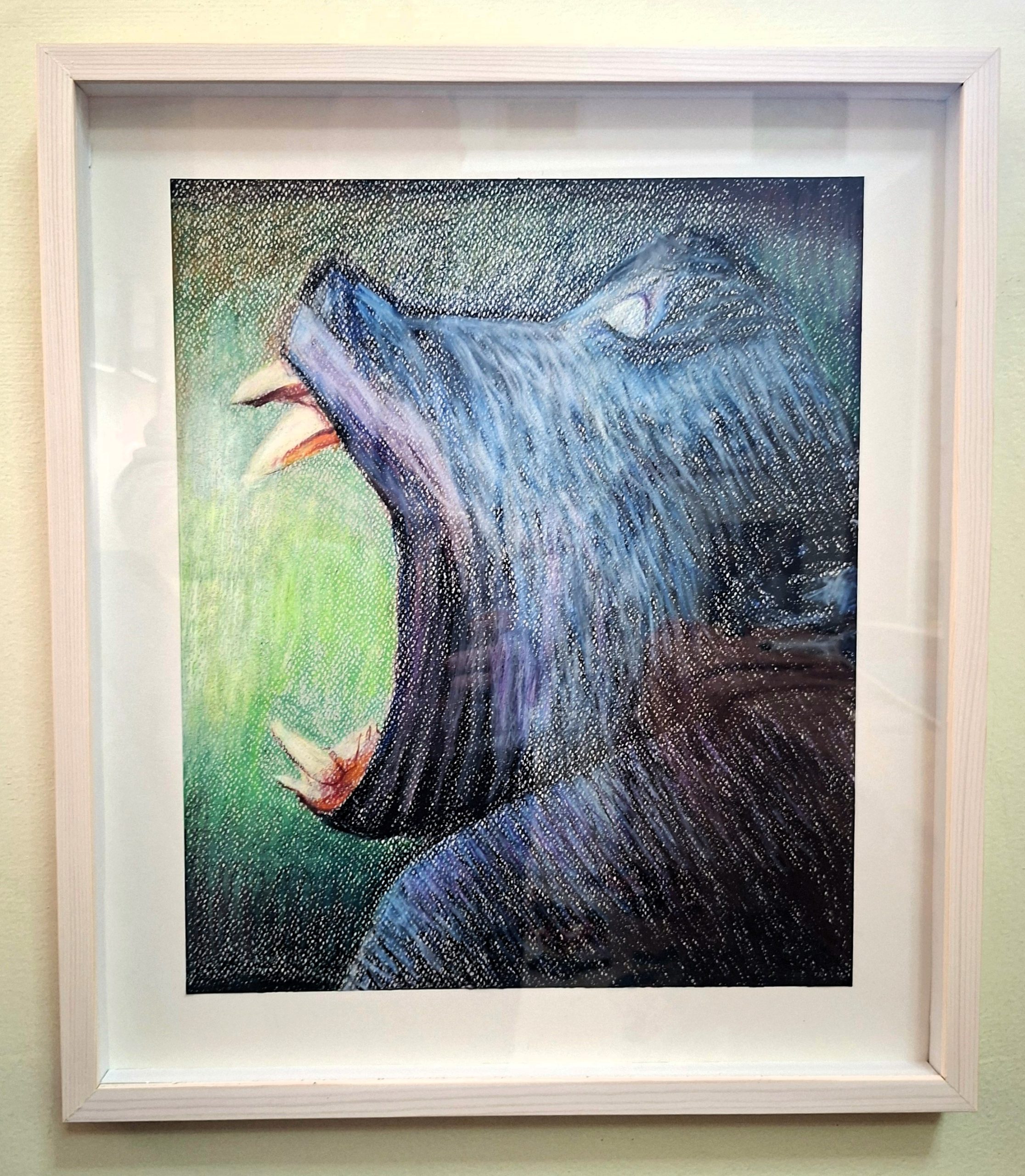 In “Baboon Roar,” Roi Pajursky pushes the boundaries of oil pastels, layering deep blues, purples, and earthy greens to build a sense of physical weight and volume. The focus on the animal’s open jaw serves as a study of both anatomy and expression, where the vibrant colors contrast with the dark, moody background. This piece is a signature example of Pajursky’s ability to blend expressive energy with fine-art precision.