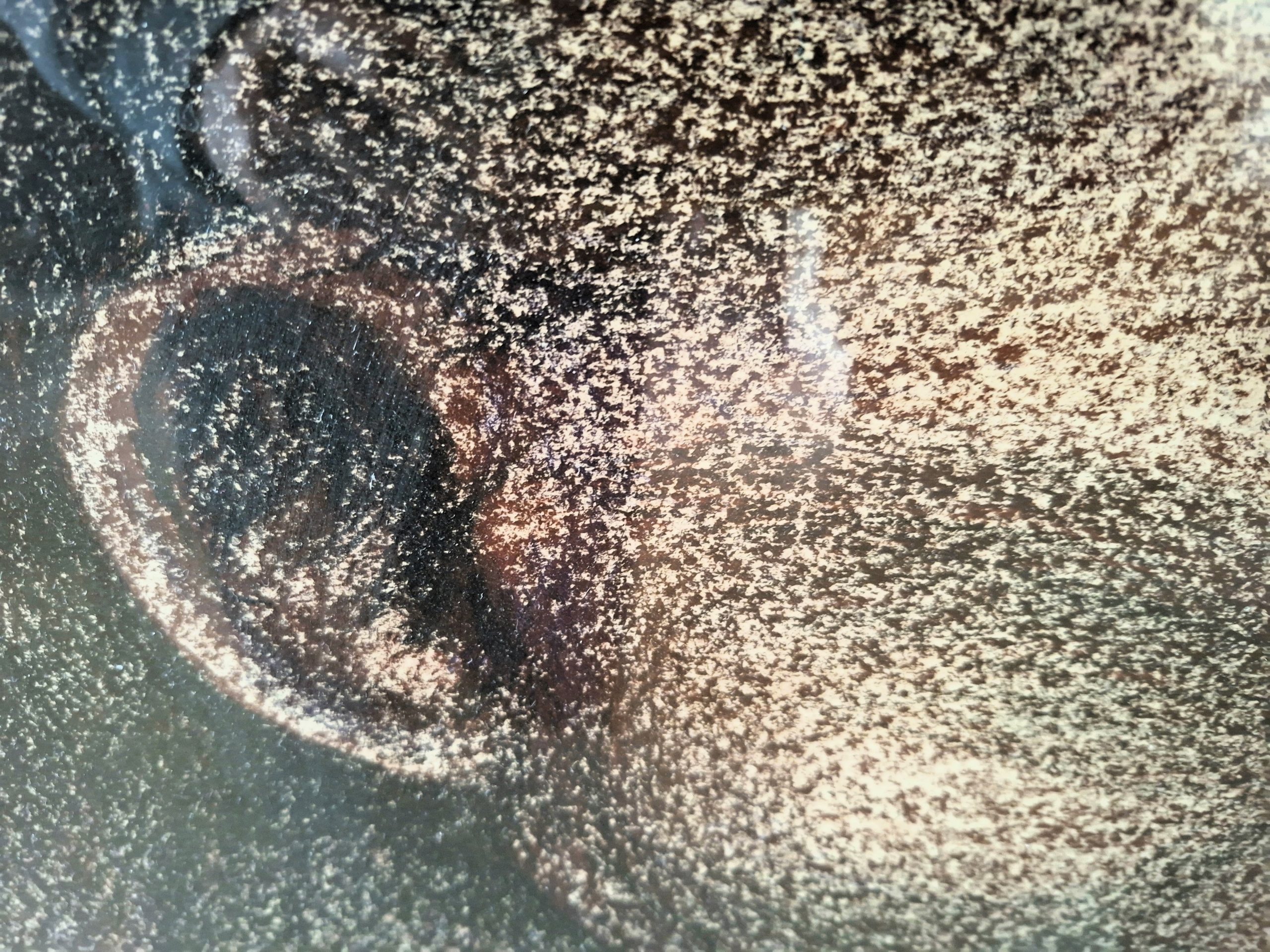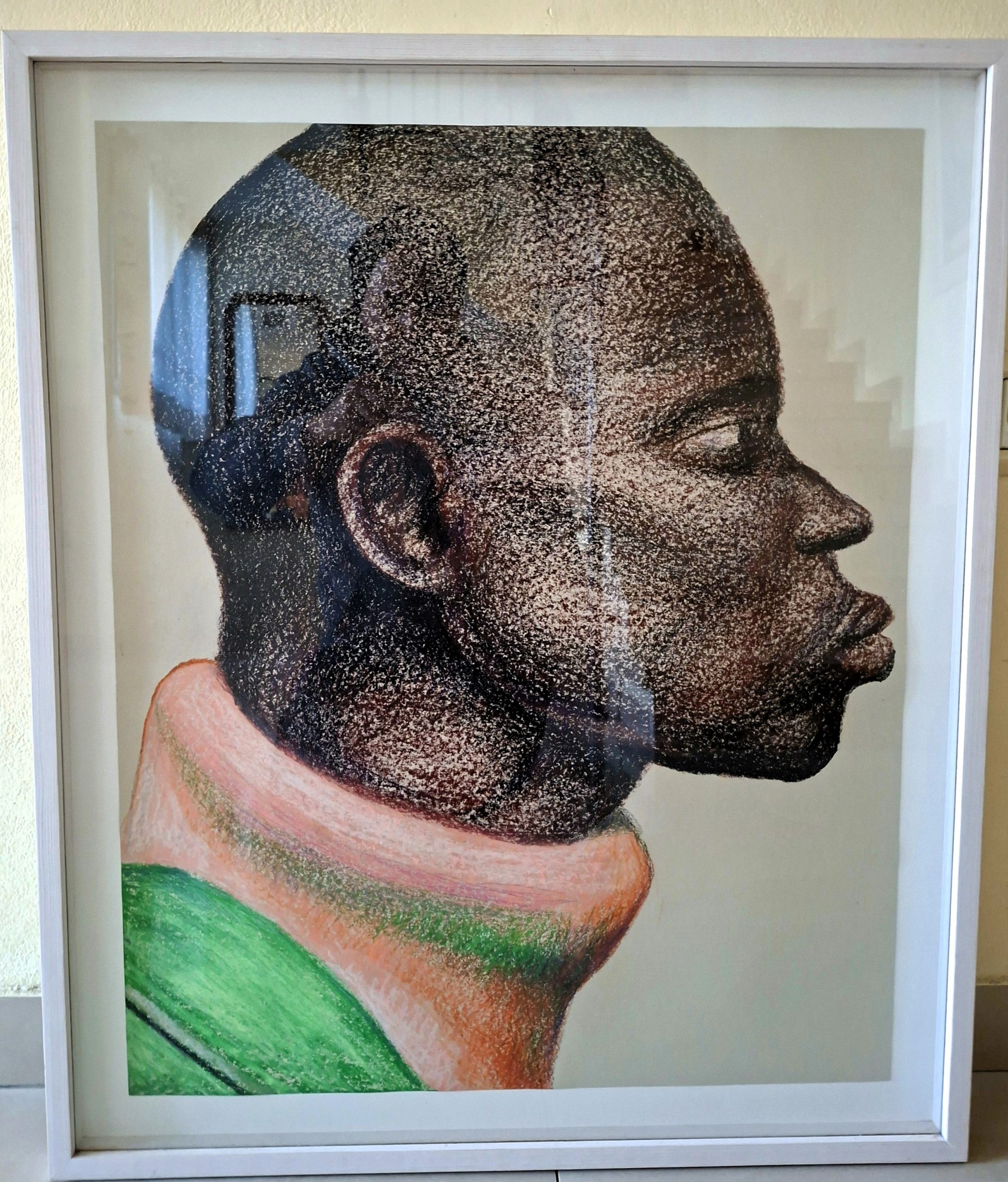 An original pastel painting on paper titled “Dignified Profile.” Featuring rich stippled textures and a commanding presence. This unique portrait comes professionally framed in a modern white frame, ready to hang and add sophisticated elegance to your wall decor.