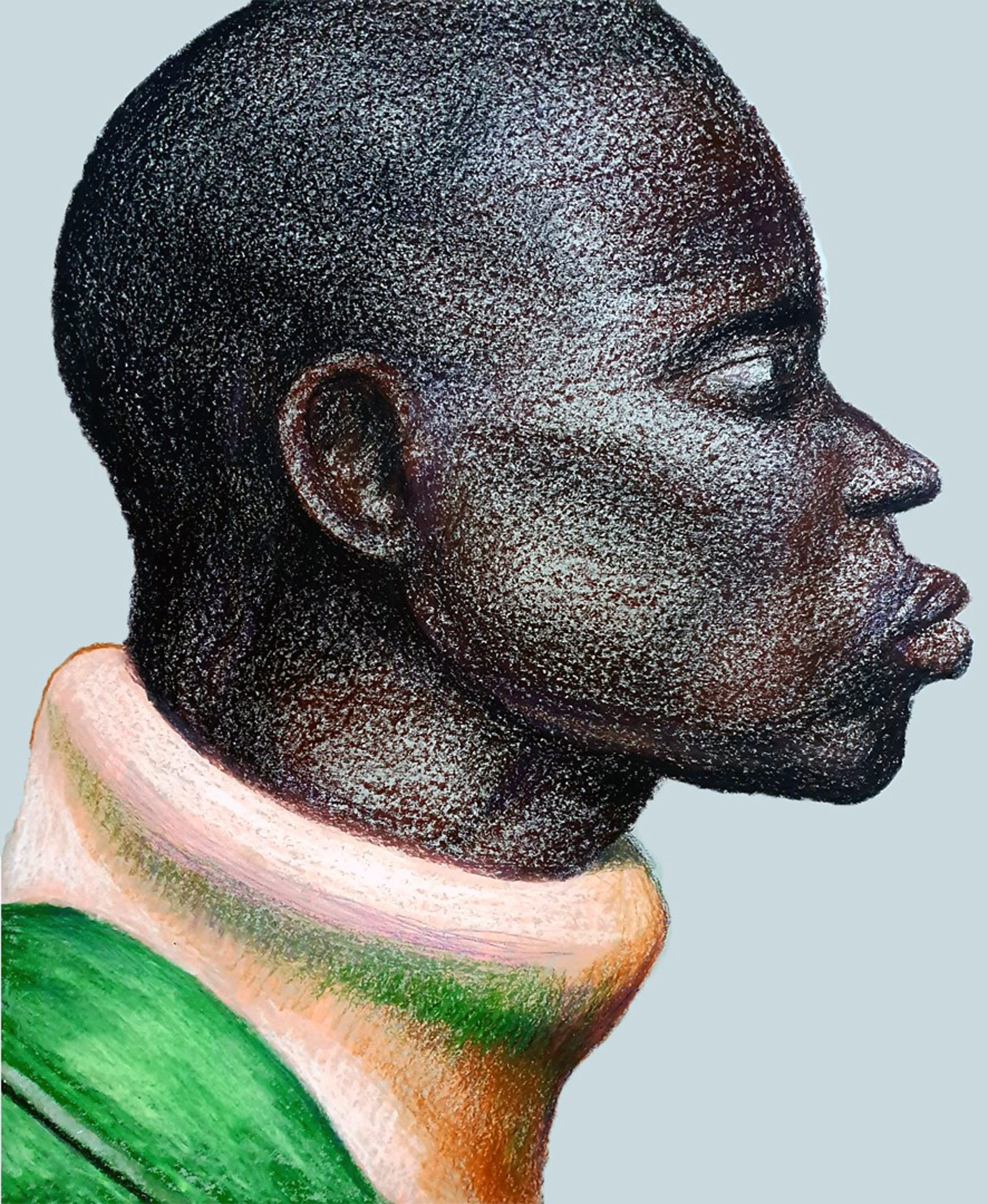 This captivating artwork captures a male subject in a refined, side profile pose, rendered with masterful stippling and blending techniques that highlight the rich texture and tone of the skin. The subtle use of color—from the pale neck collar to the vibrant green and warm orange garment—creates a harmonious contrast against the cool grey background.