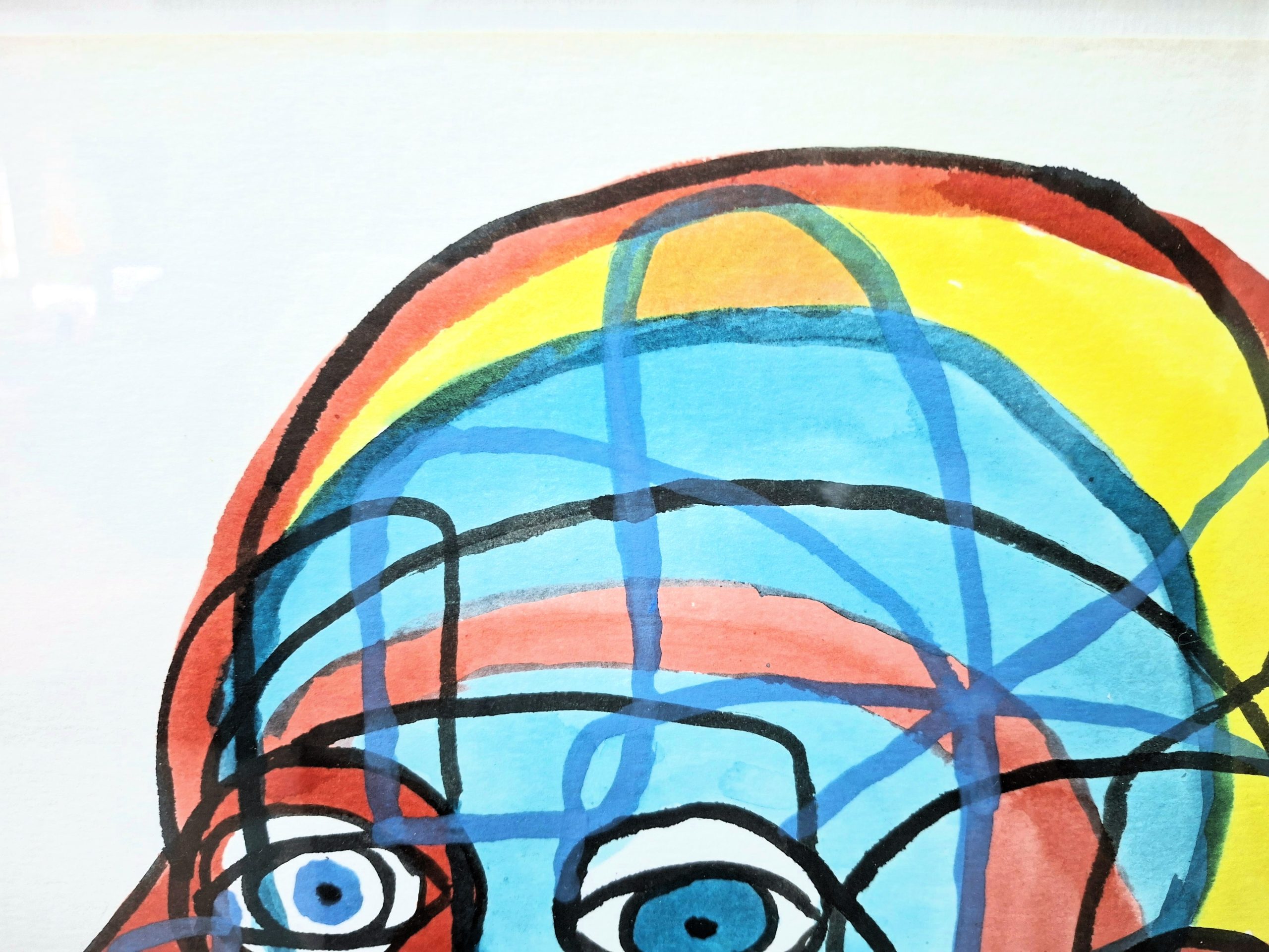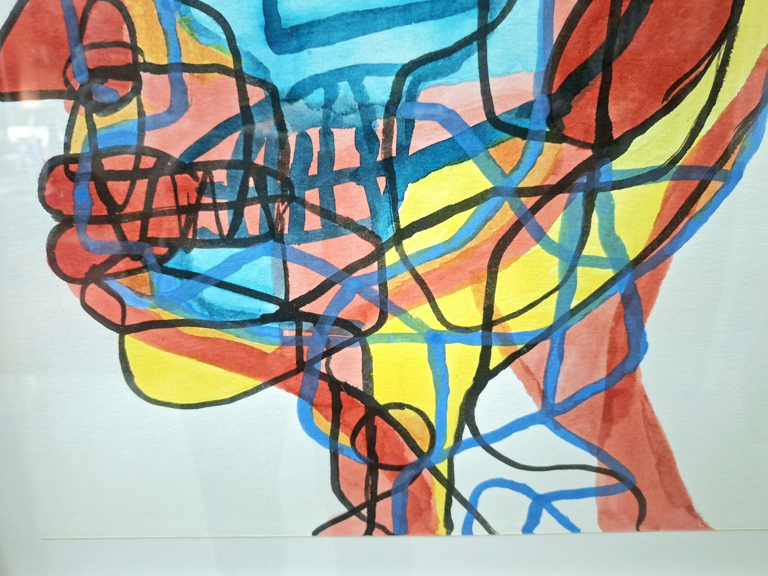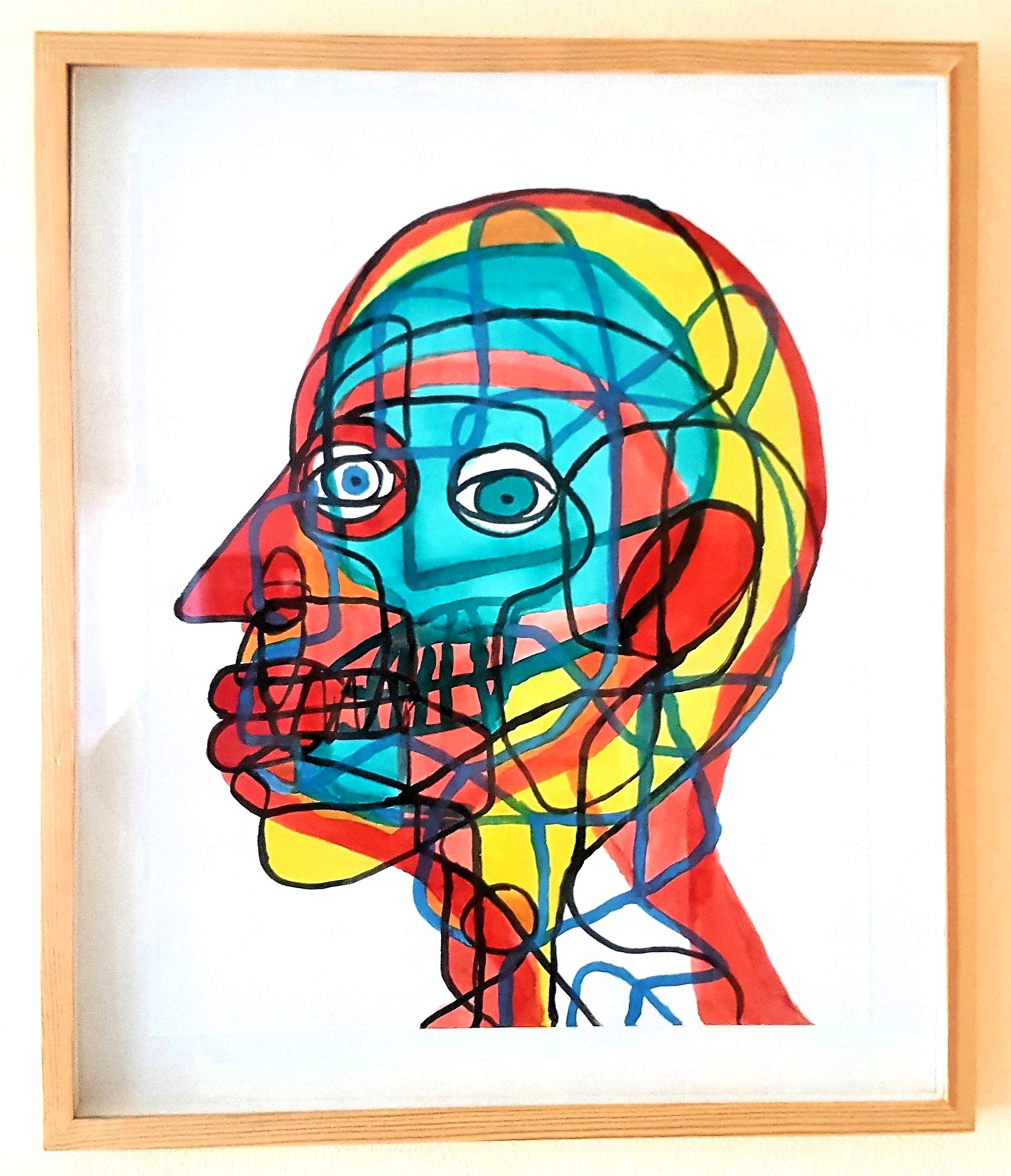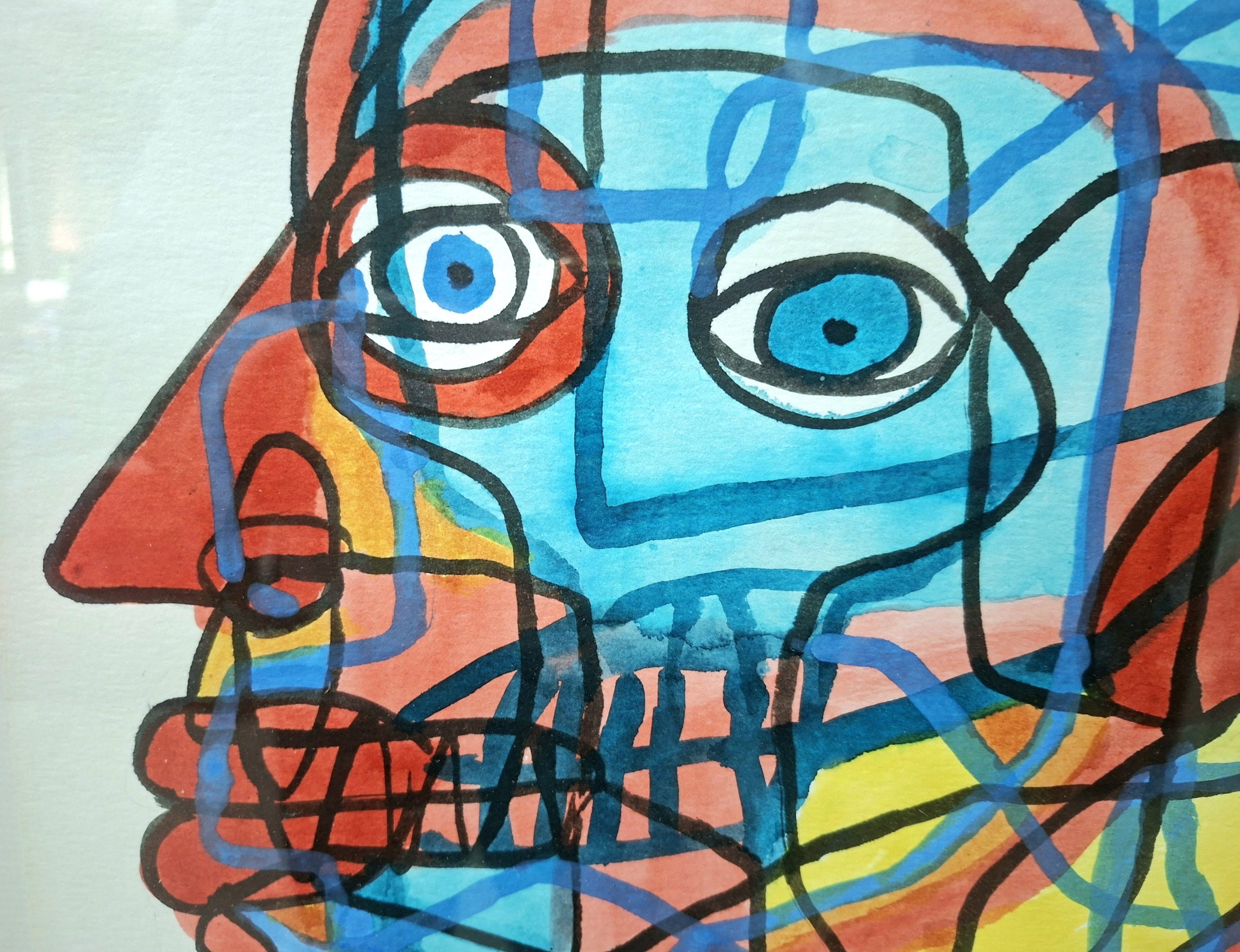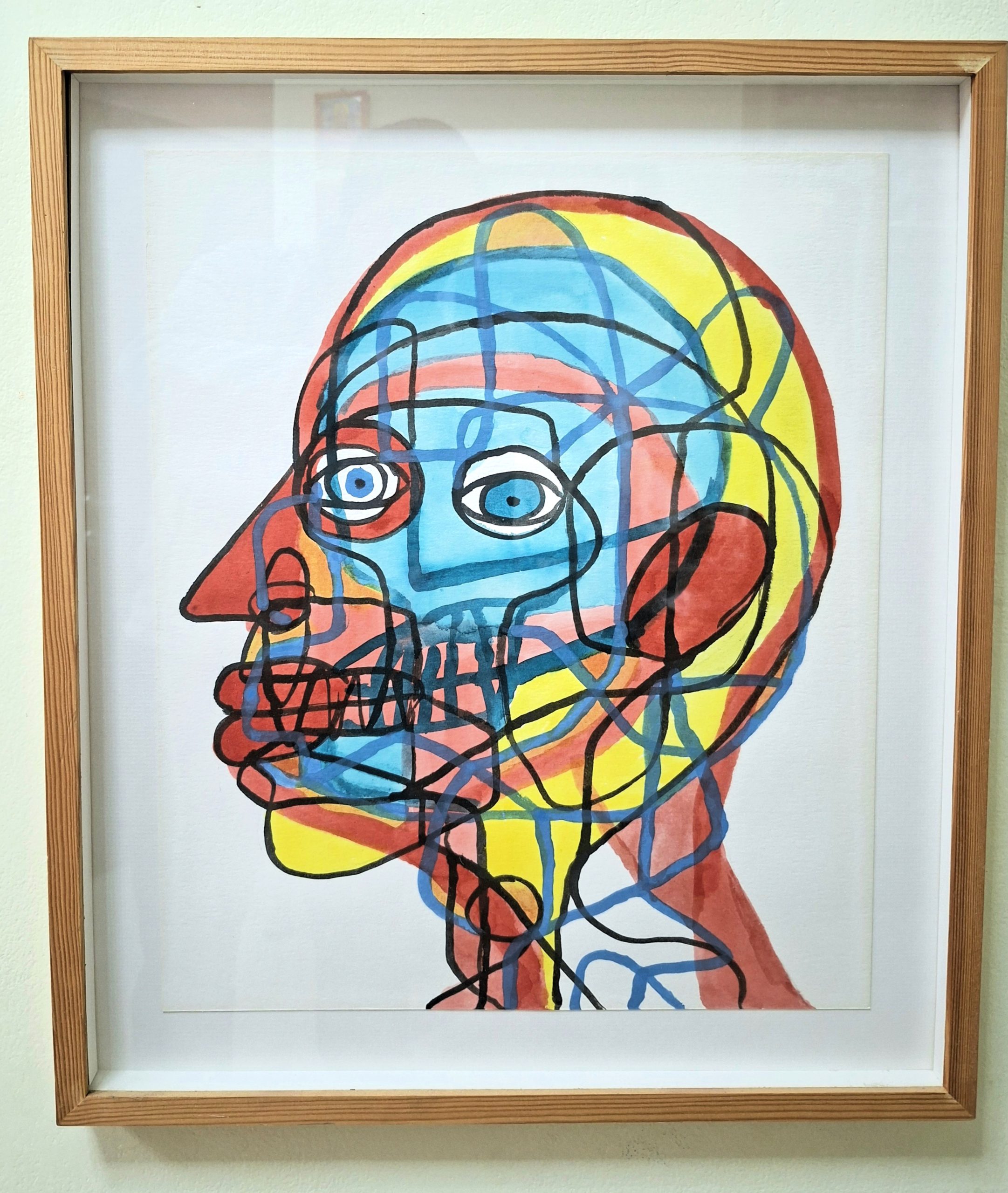 A striking original ink drawing by Roi Pajursky, featuring a vibrant, multi-layered geometric face. This modern masterpiece combines sharp precision with explosive colors, framed and ready to bring a contemporary edge to any space.