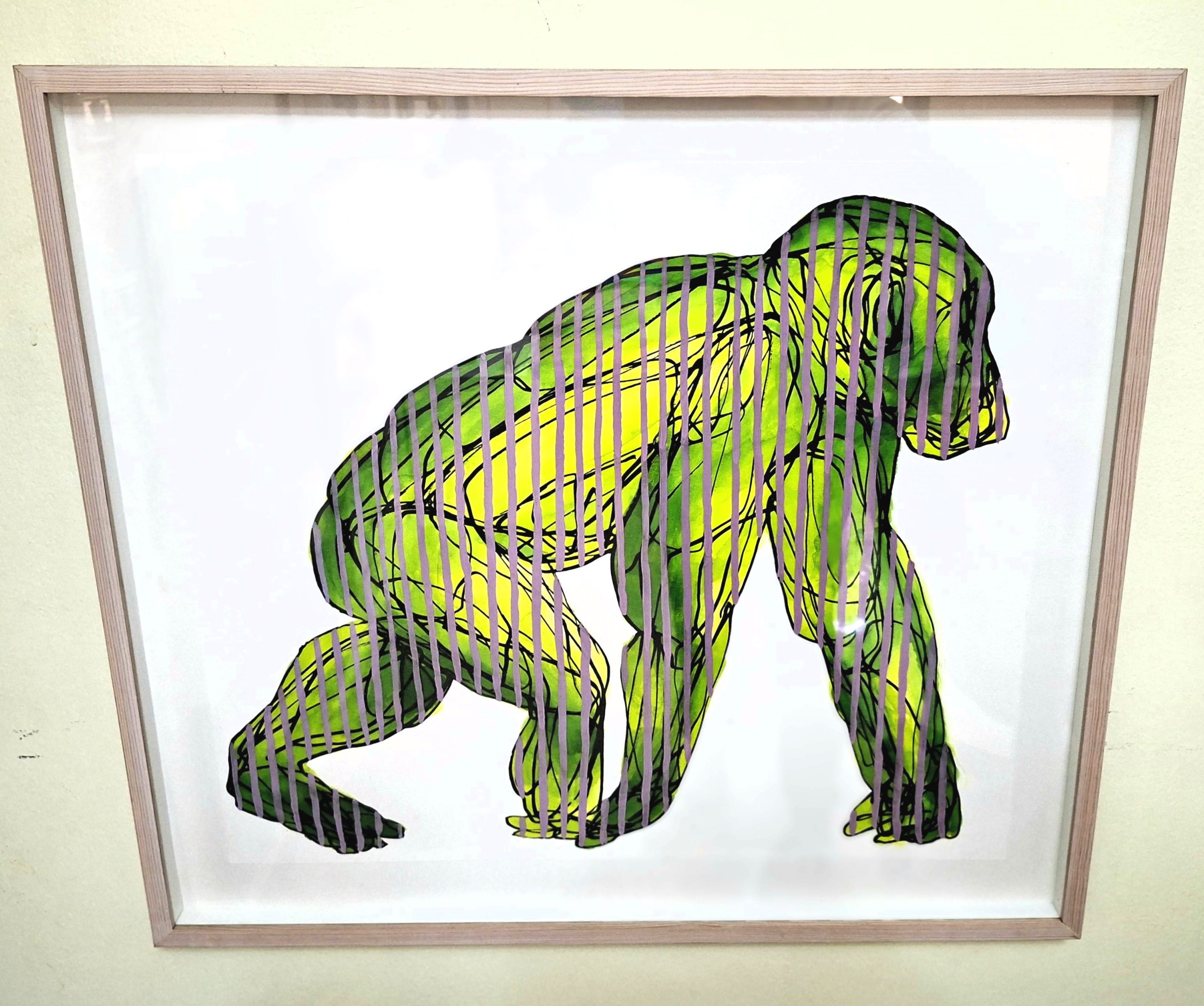 This captivating surrealist piece features a powerful ape silhouette, filled with a vibrant, energetic green and yellow wash and overlaid with bold, vertical purple stripes and intricate black line work.