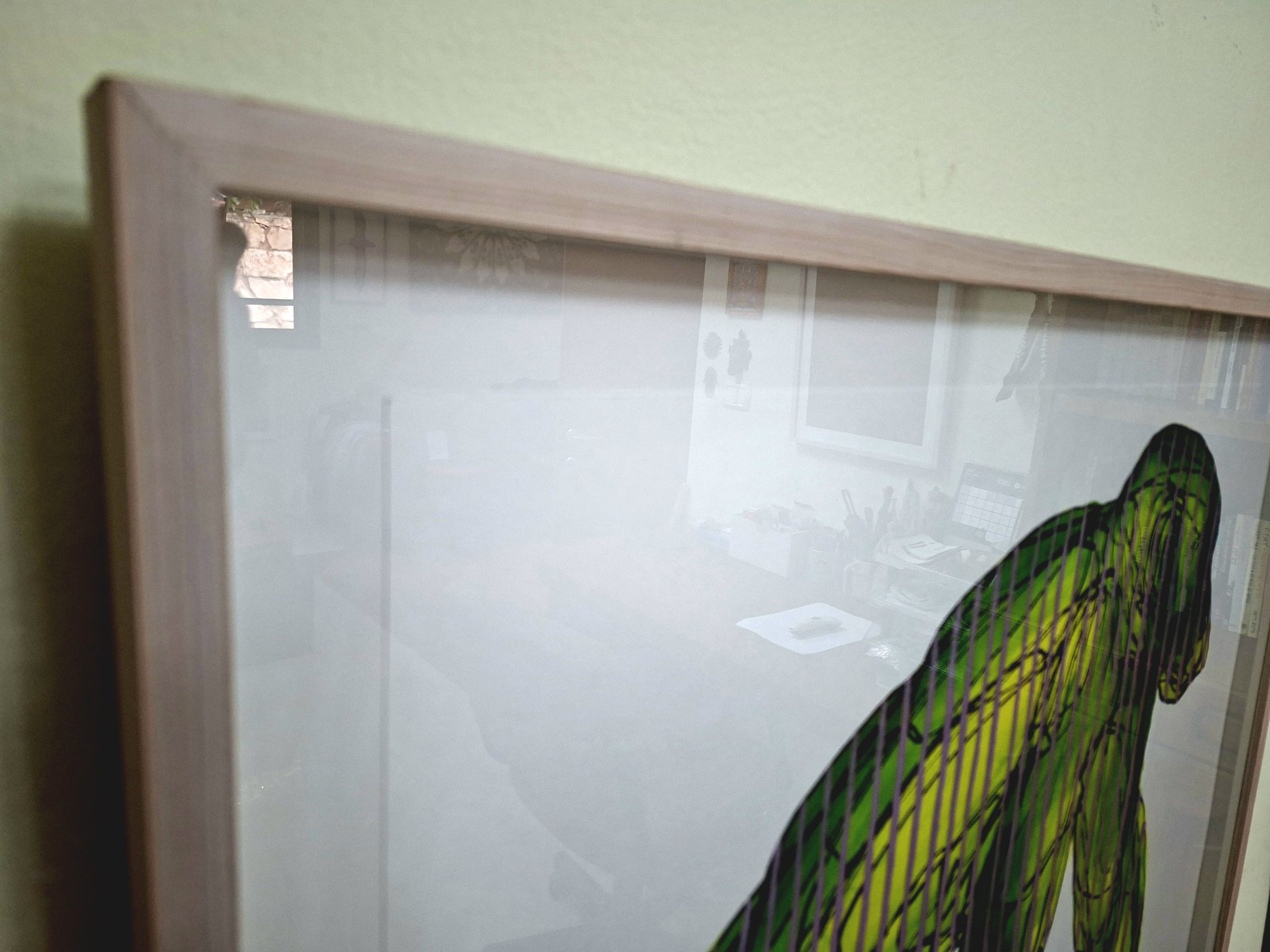 An original surrealist ink painting titled “Green Striped Monkey”. Featuring vibrant green tones, rhythmic purple stripes, and intricate line work. This unique piece comes professionally framed and ready to add a bold, modern edge to your wall decor.