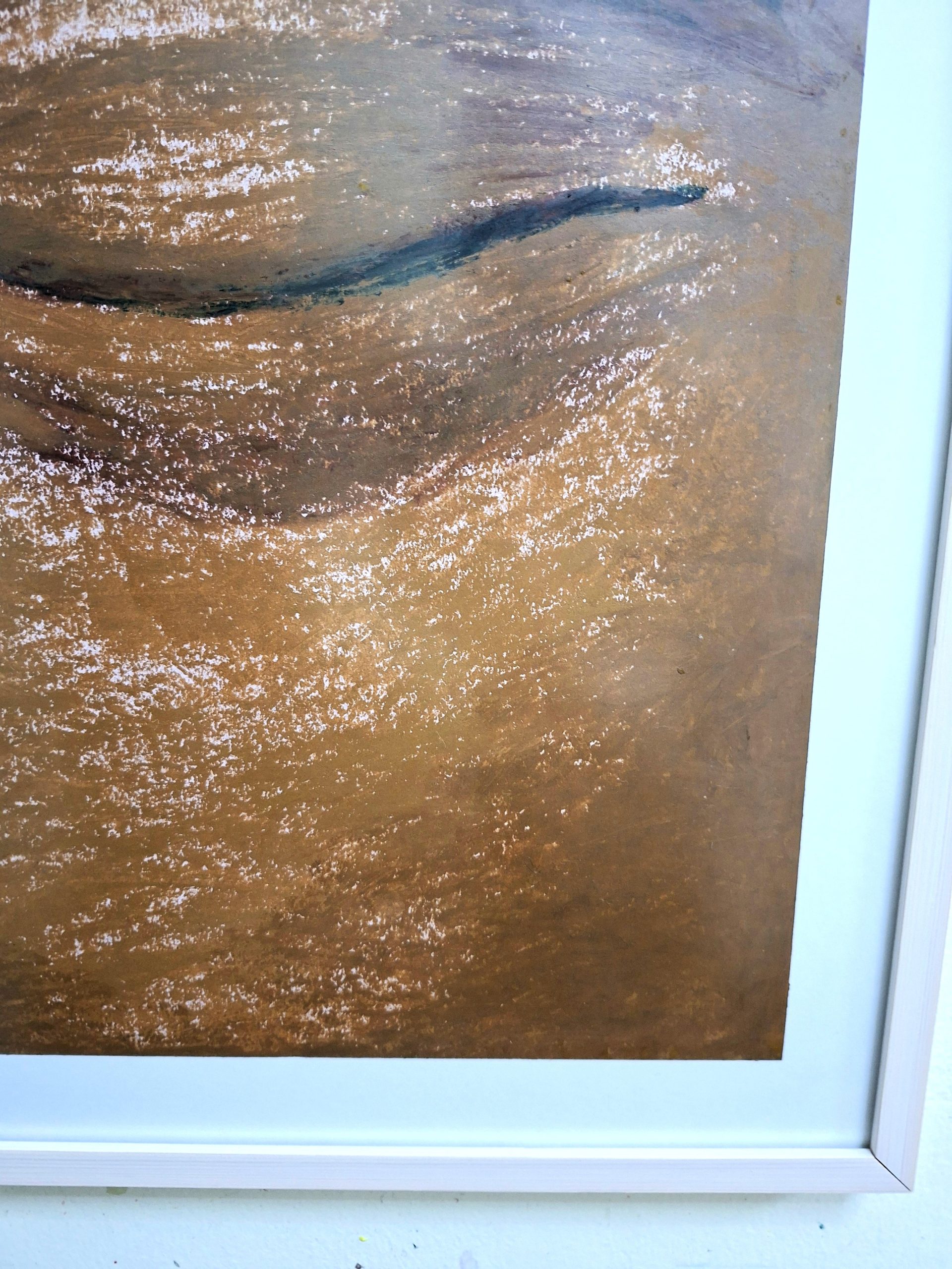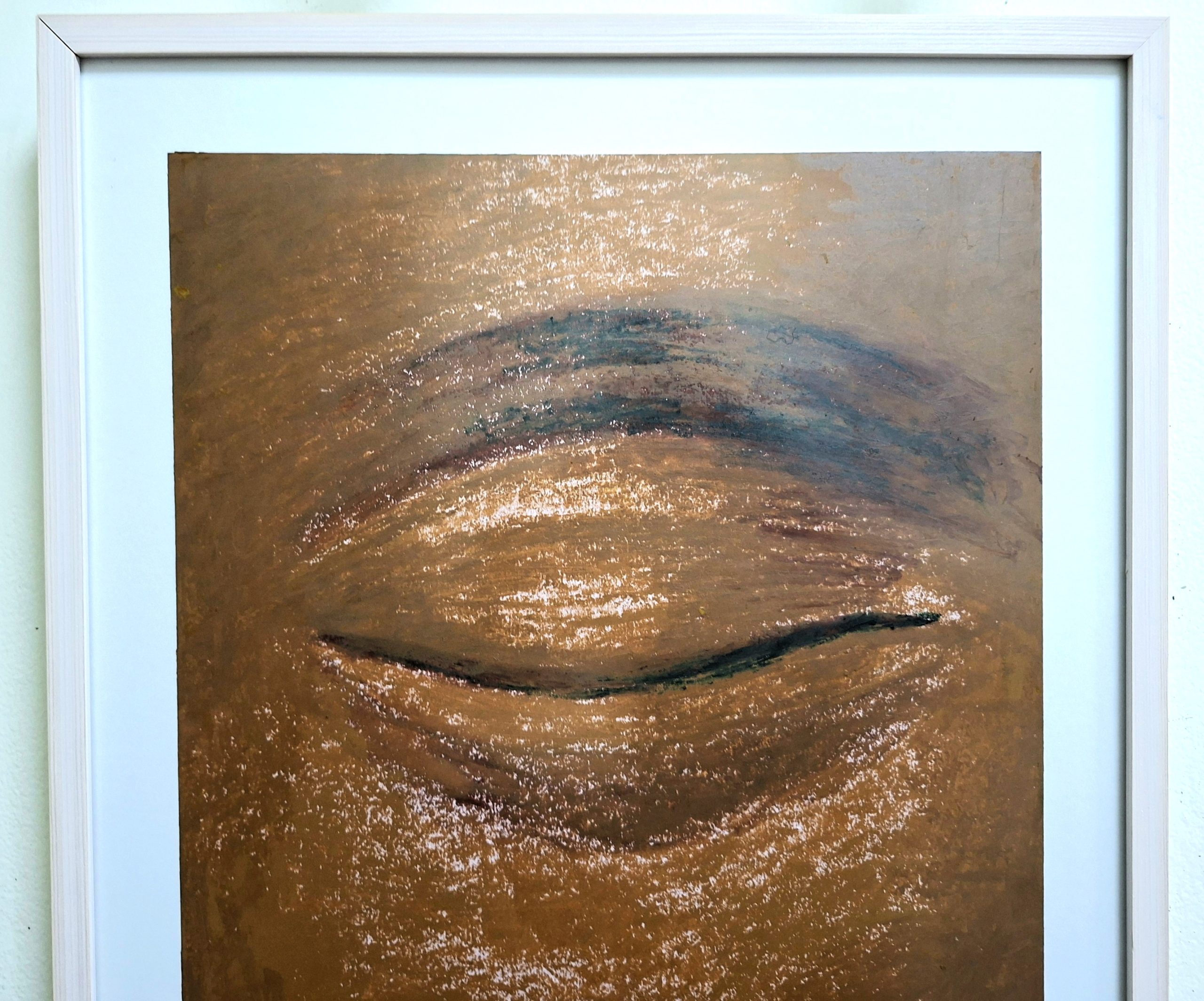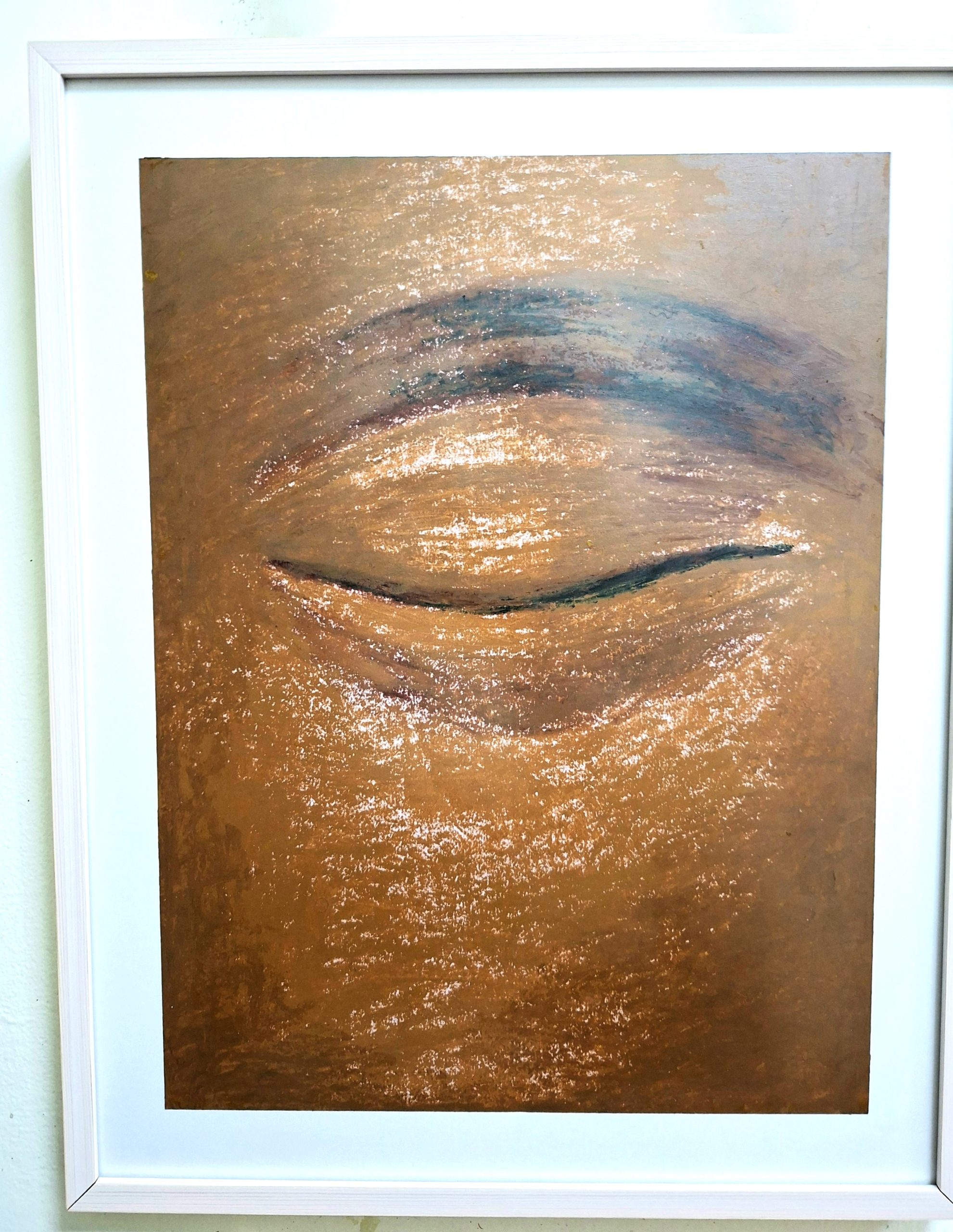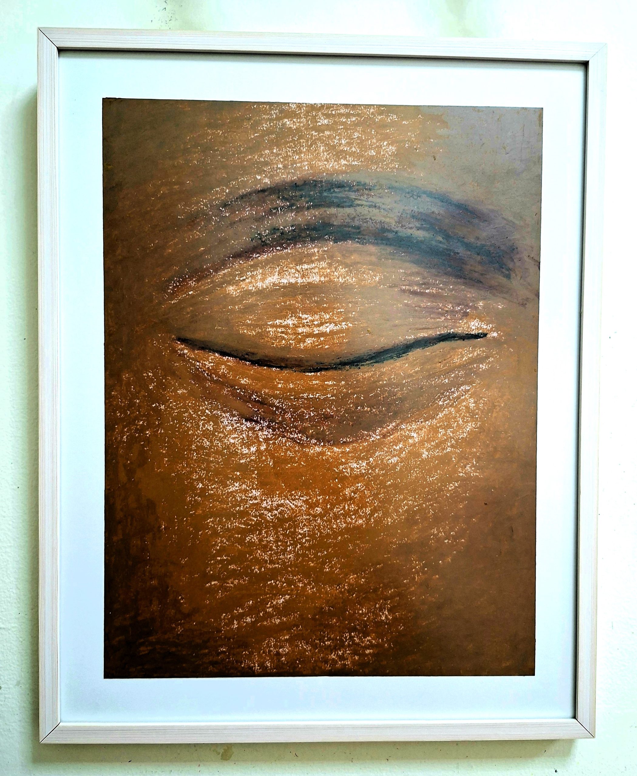 A powerful original oil pastel painting titled “Inner Vision.” Featuring rich textures and deep earthy tones in a minimalist study of a closed eye. This unique piece is professionally framed in a sleek white frame (46 x 59 x 3 cm), ready to bring a sense of serenity to your home or office.