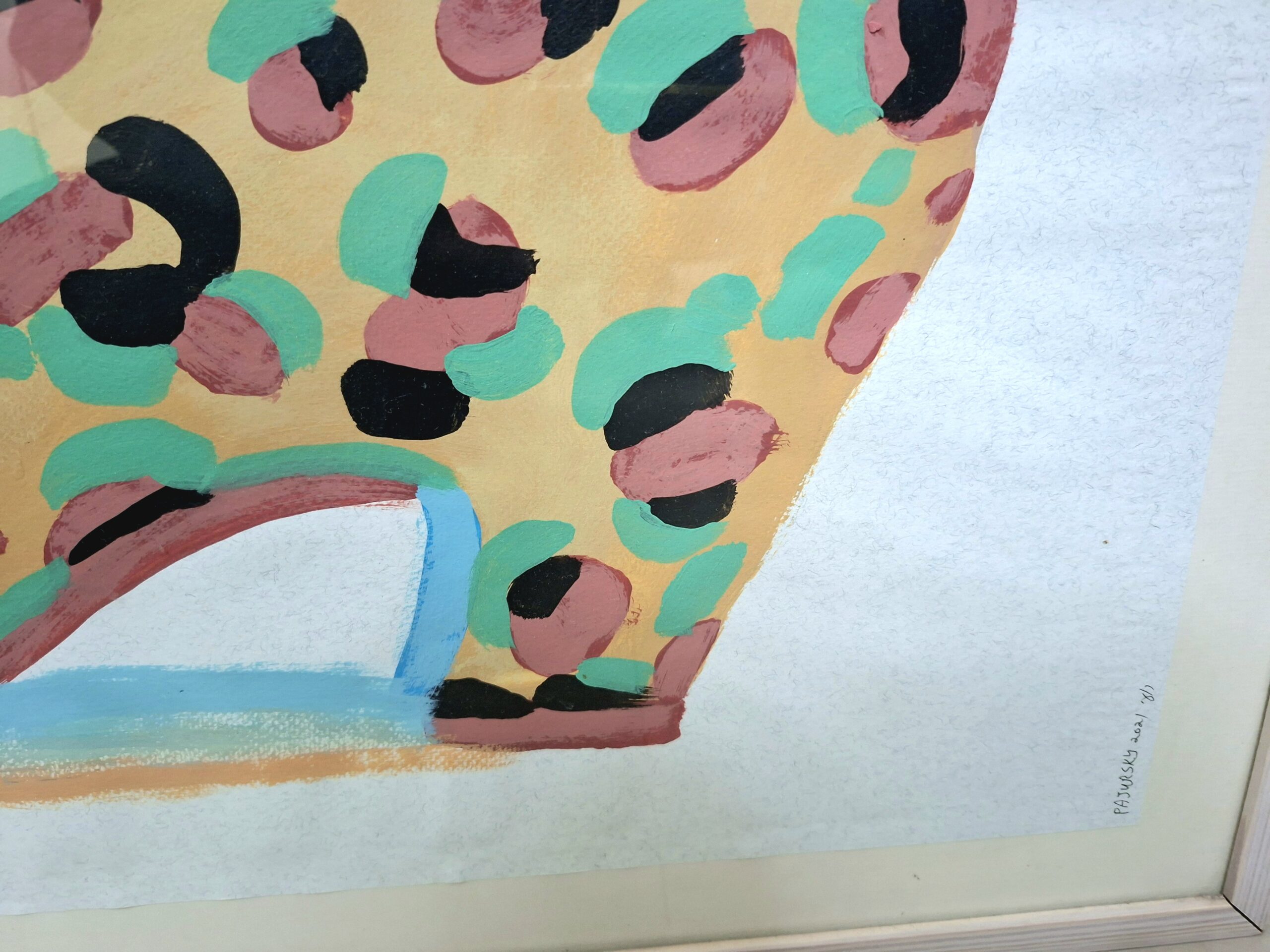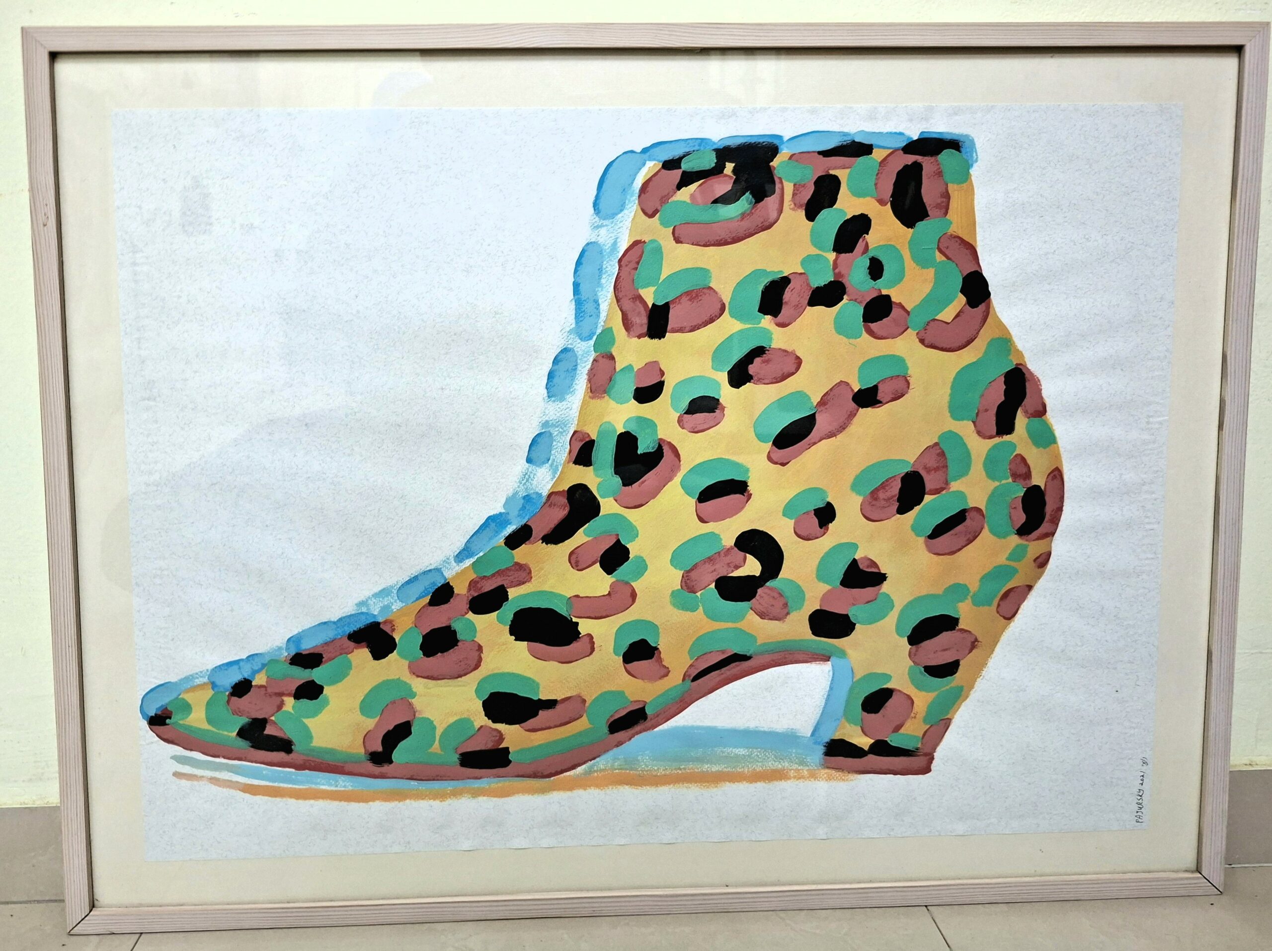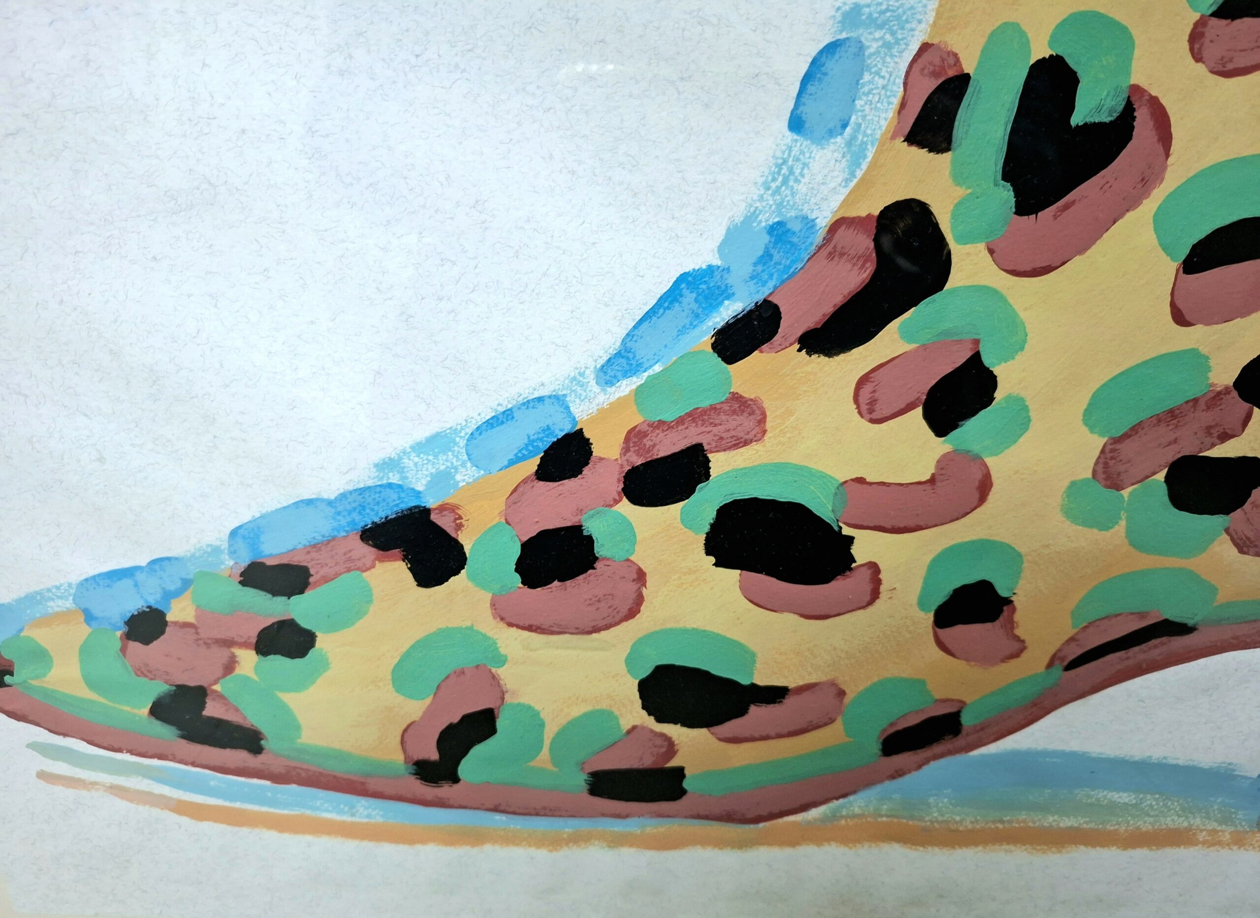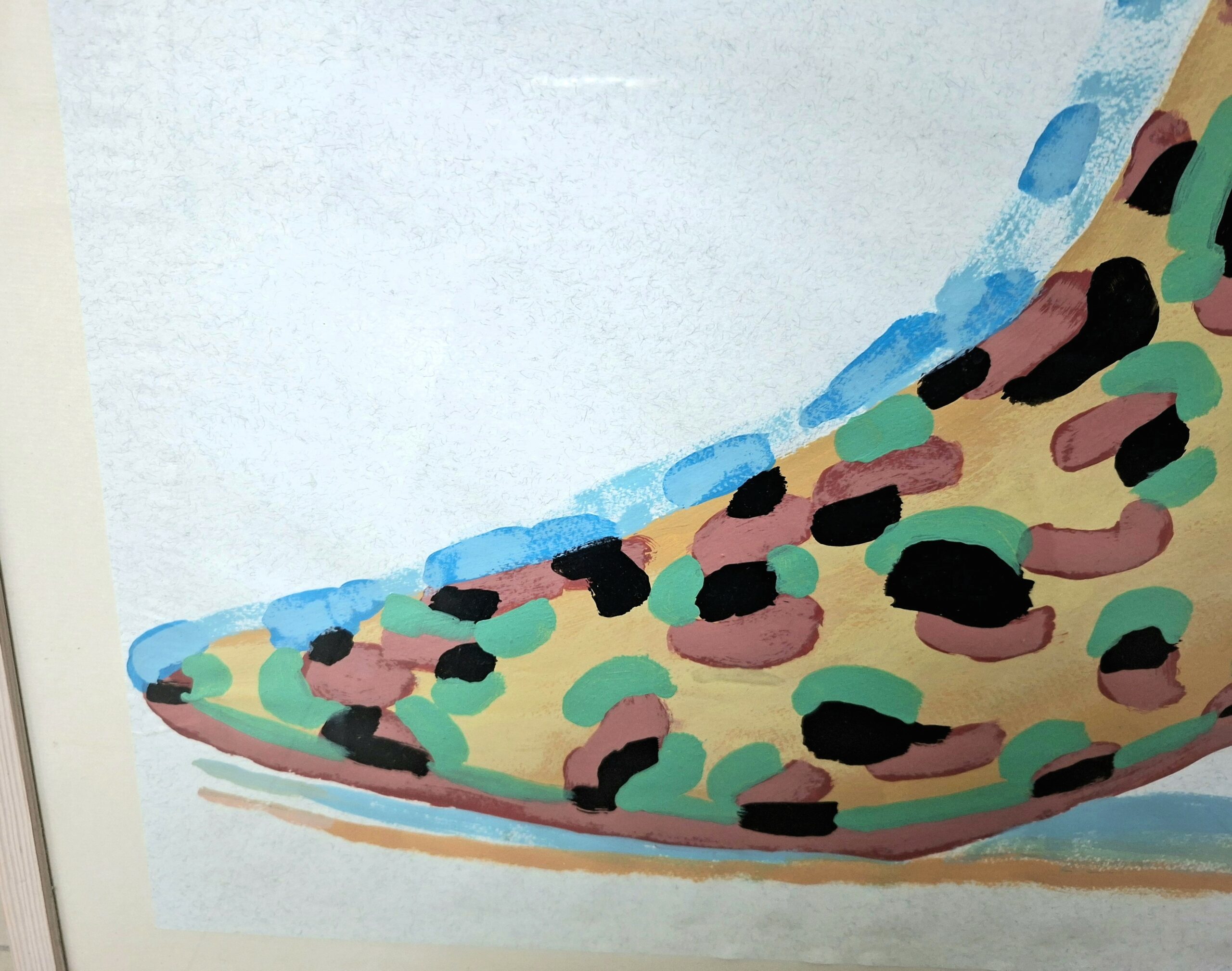 A bold and vibrant contemporary statement piece. This original acrylic painting (60H x 74.5W x 3D cm) on paper features a stylized leopard print boot, blending high-energy Pop Art aesthetics with intricate textures and a dynamic color palette.
