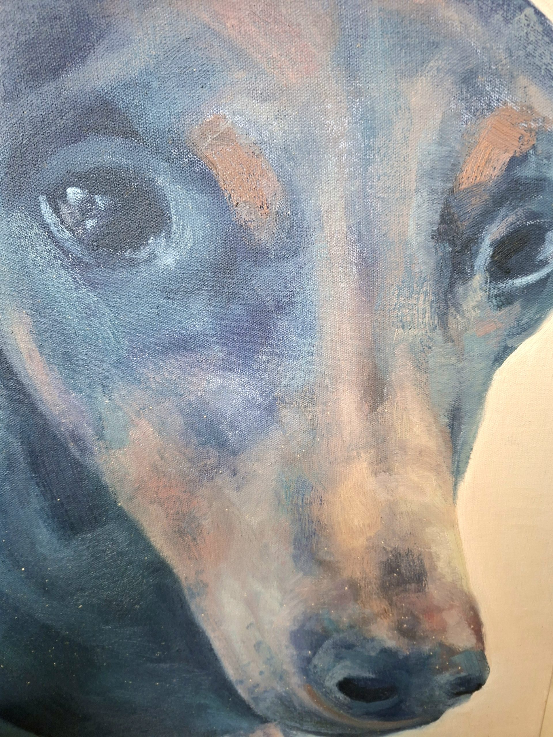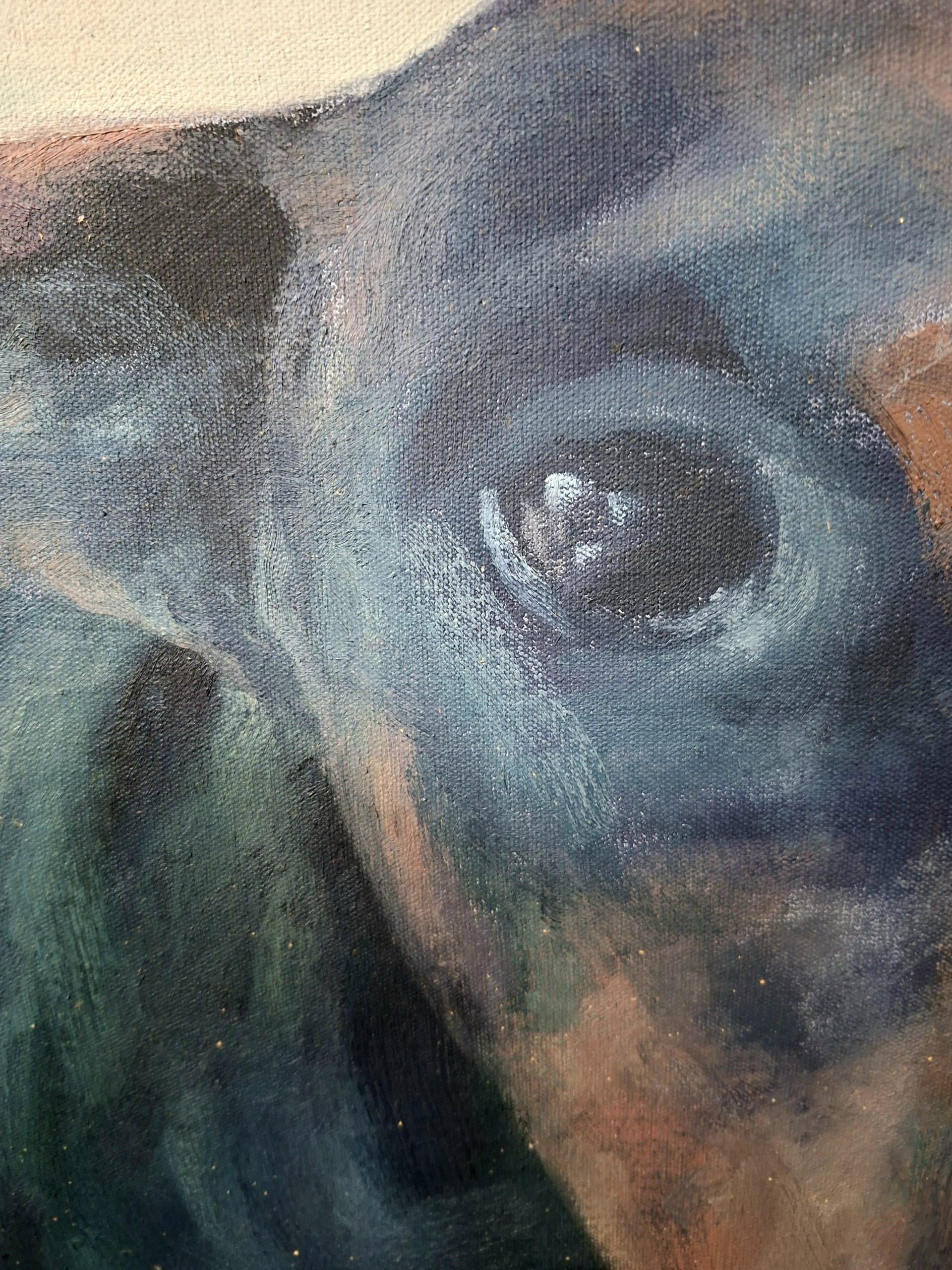 A soulful and expressive original oil painting (50.5×50.5×2.5 cm) capturing an intimate canine portrait. Rendered in a deep, atmospheric palette of midnight blues, charcoal, and warm earth tones, this square canvas balances rich texture with a hauntingly beautiful presence.