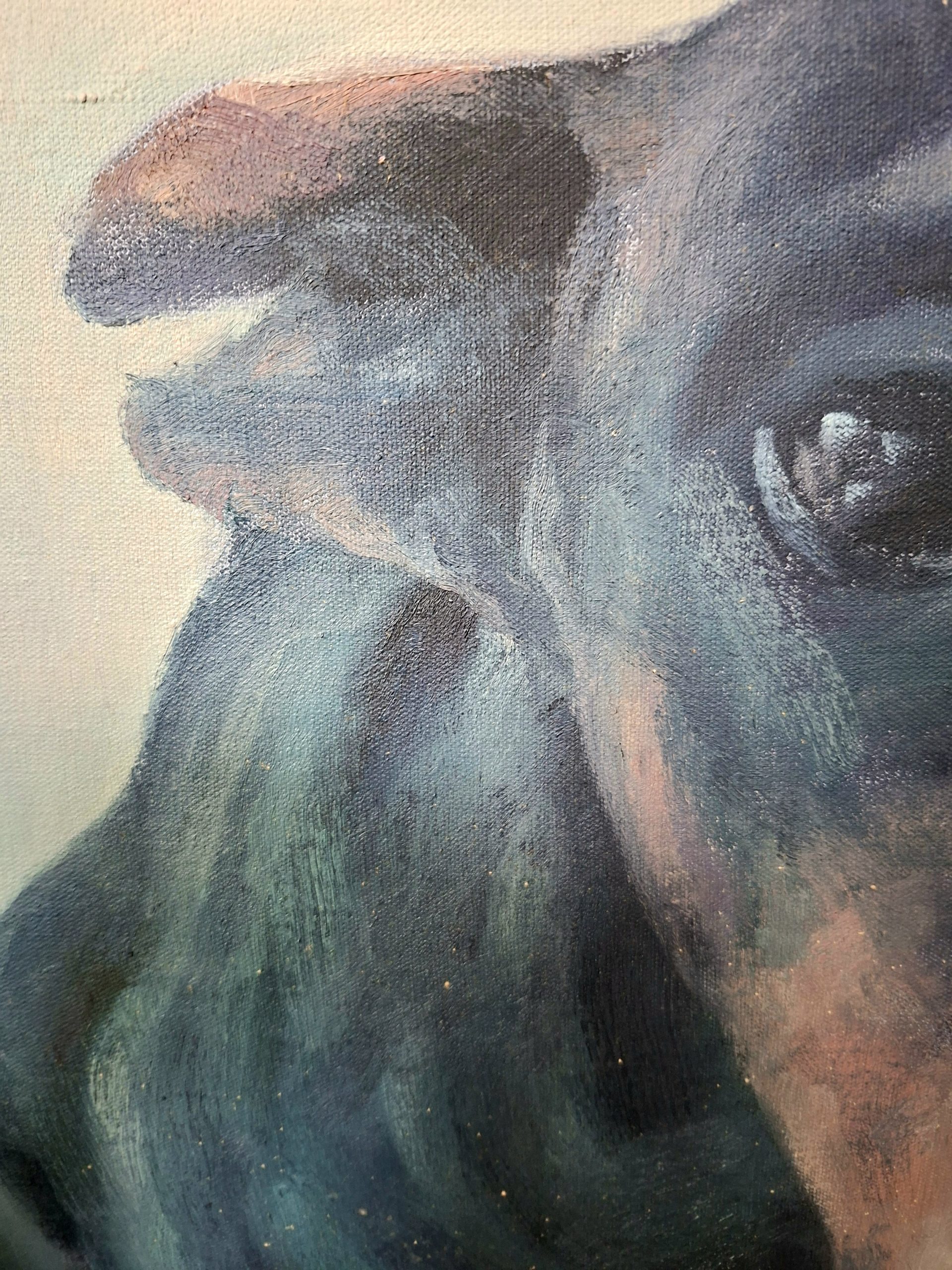 The work is characterized by its soft yet deliberate brushwork, particularly in the transition from the dark fur to the warm, luminous highlights on the snout and ears. Set against a split-tone background of muted teal and soft peach, the subject emerges with a quiet intensity. This original piece brings a sense of contemporary soulfulness to classic figurative art, making it a perfect addition to a collection that values mood and character.