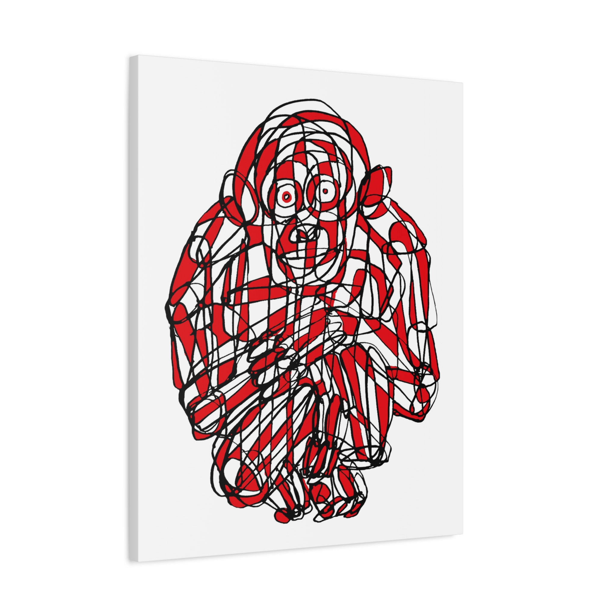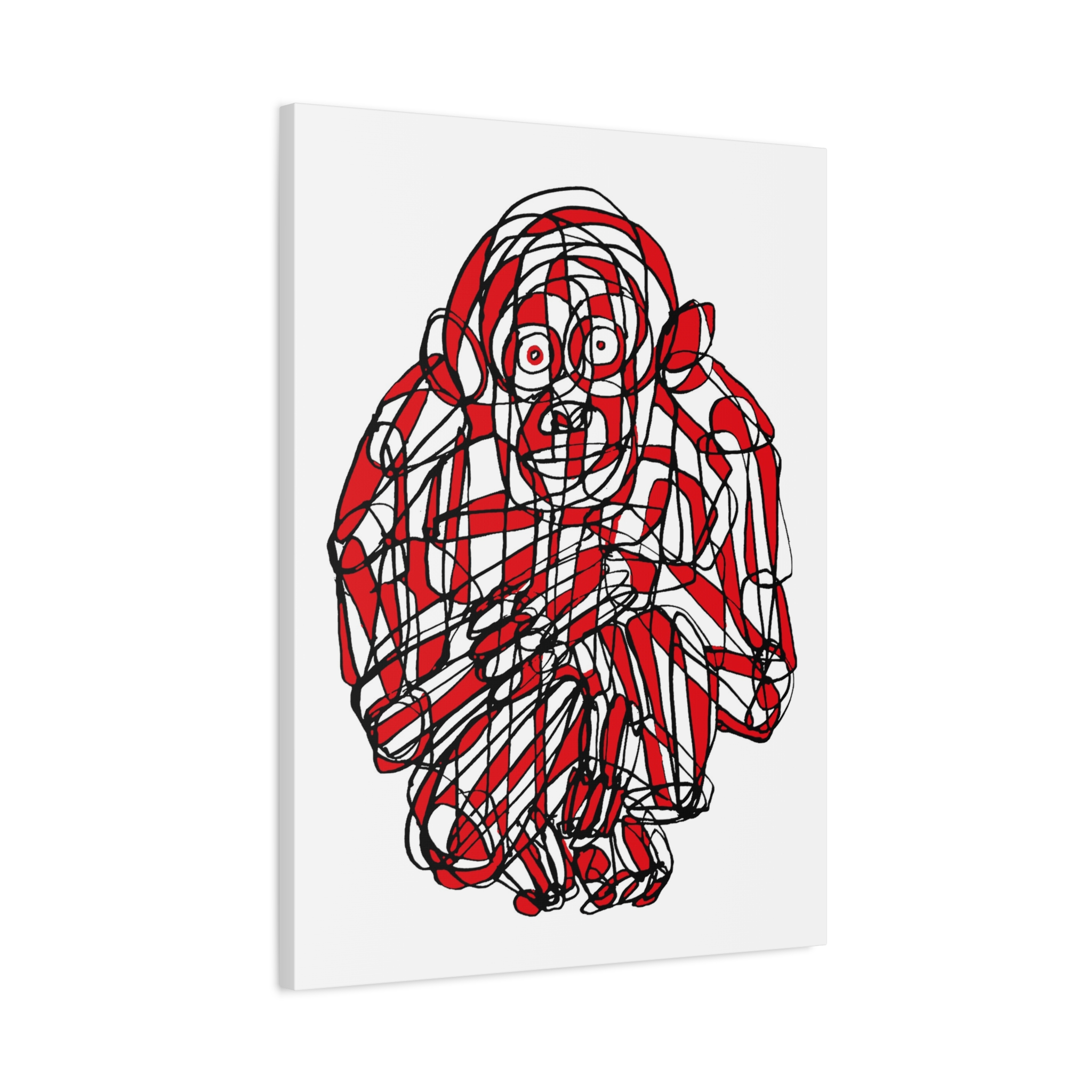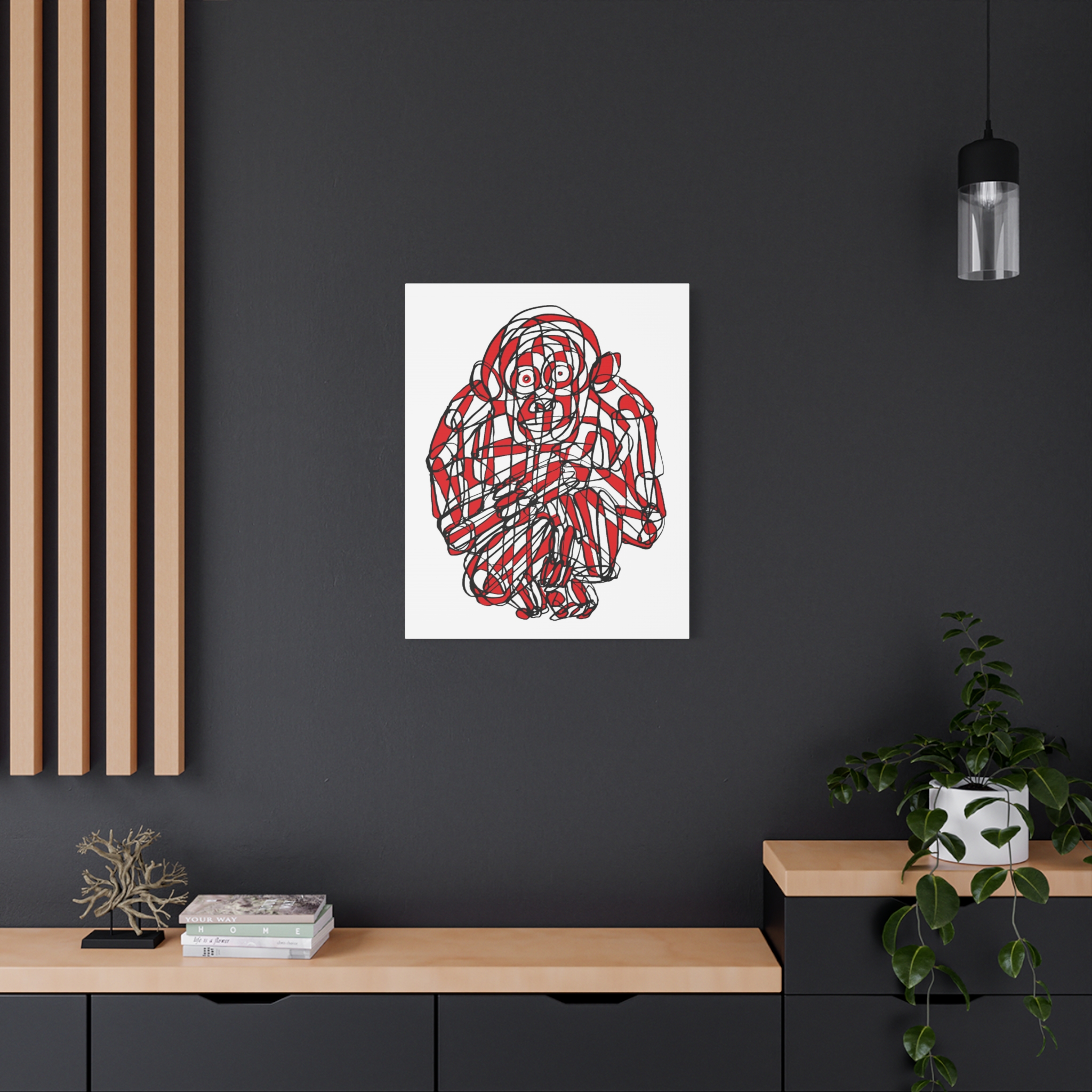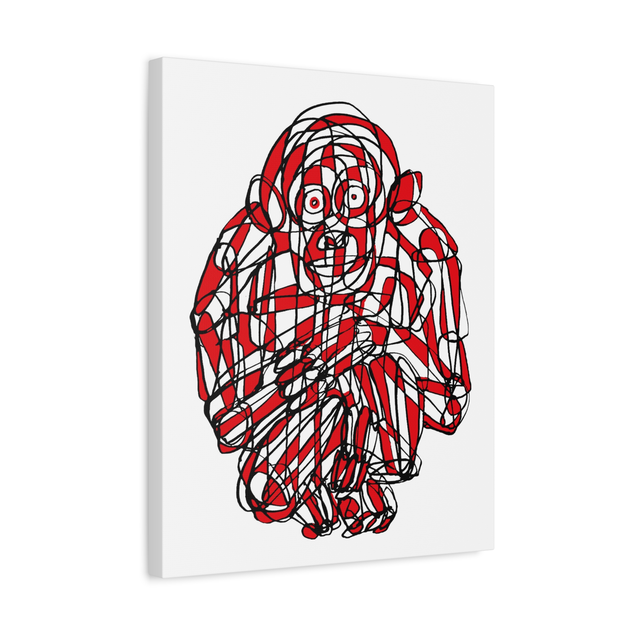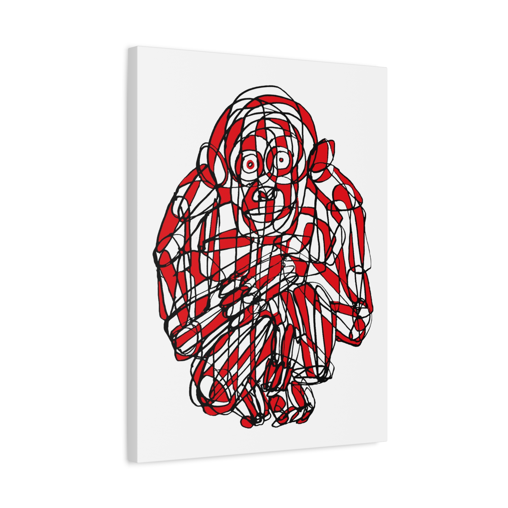 This premium stretched matte canvas showcases the “Monkey Red Black Art Line”—a captivating masterpiece by contemporary artist Roi Pajursky. Featuring a raw, spontaneous energy, this modern abstract illustration uses a sophisticated web of graphic red and black lines to create a bold, expressive primate portrait.