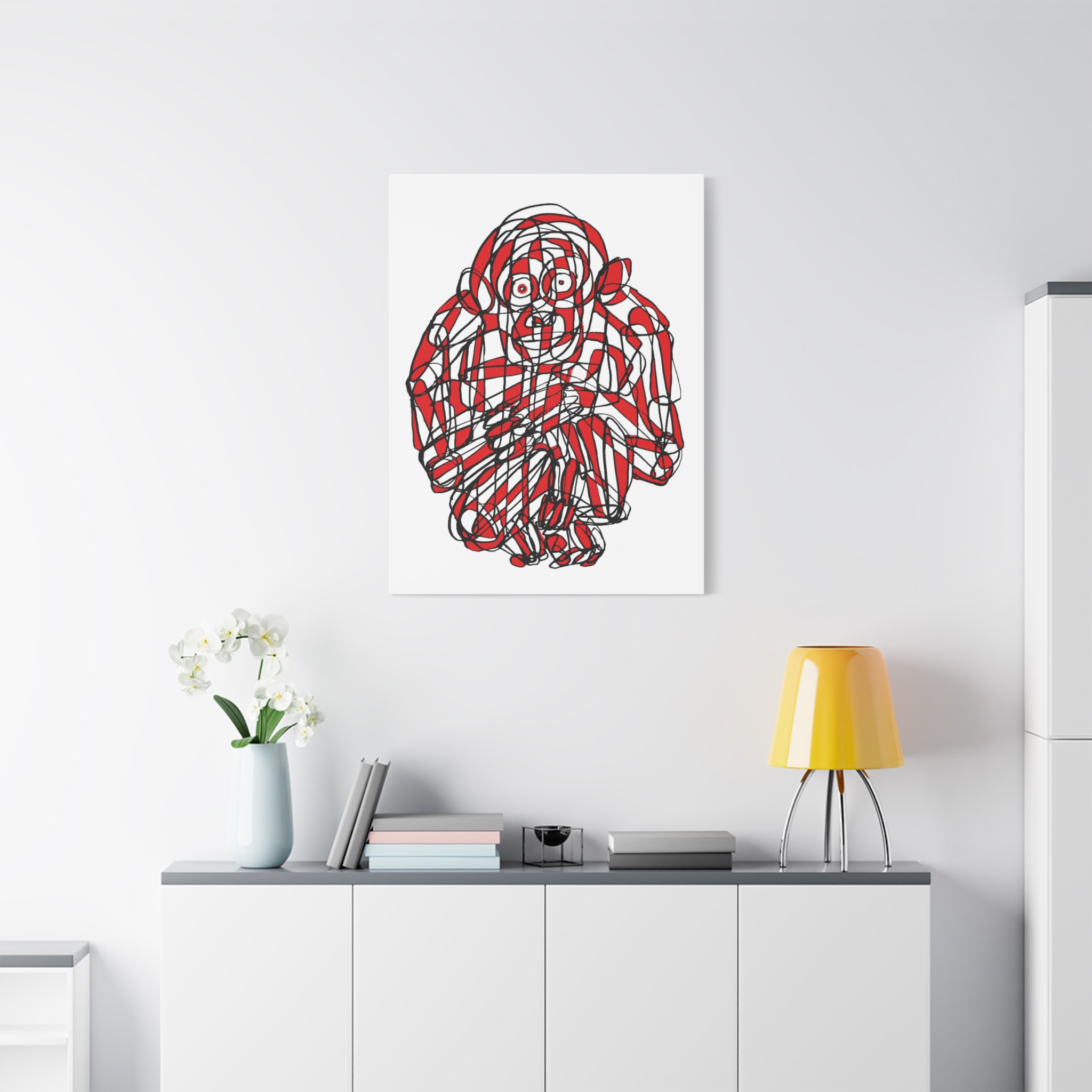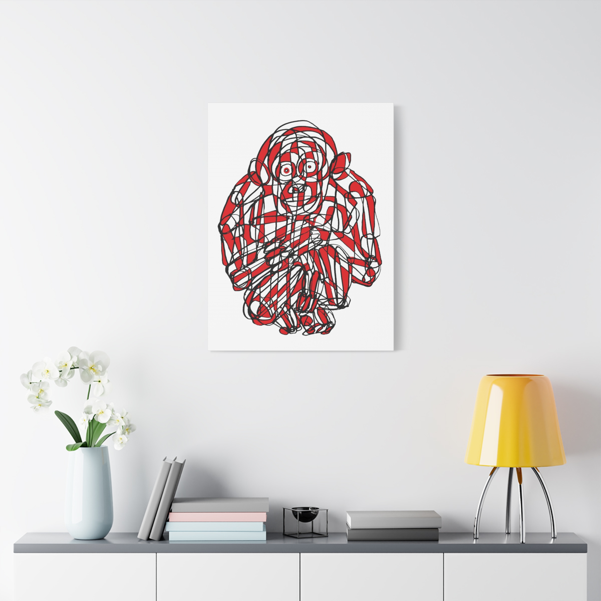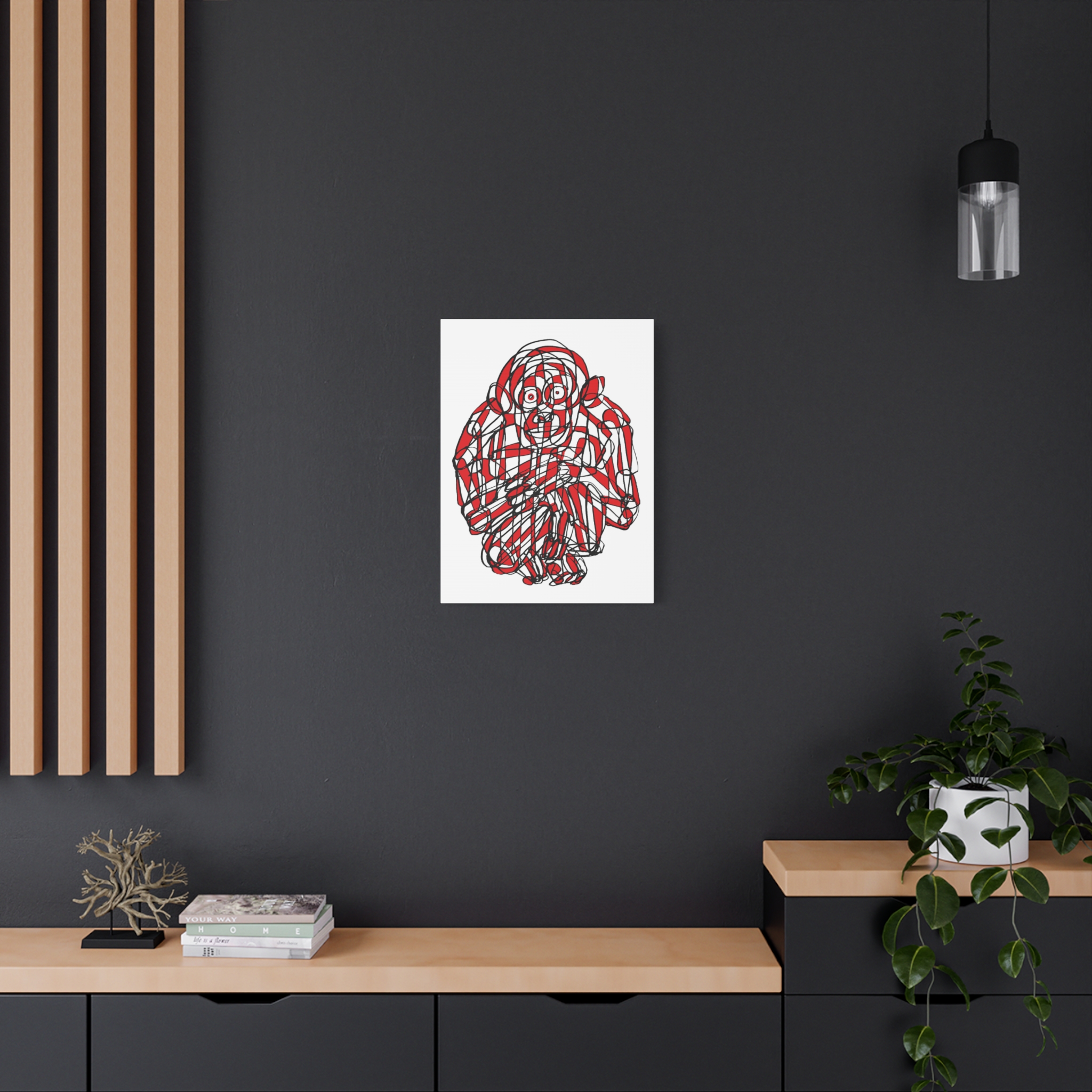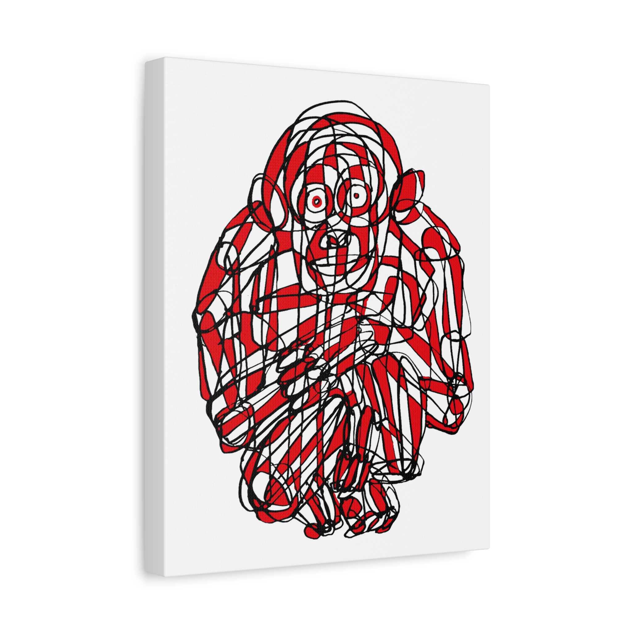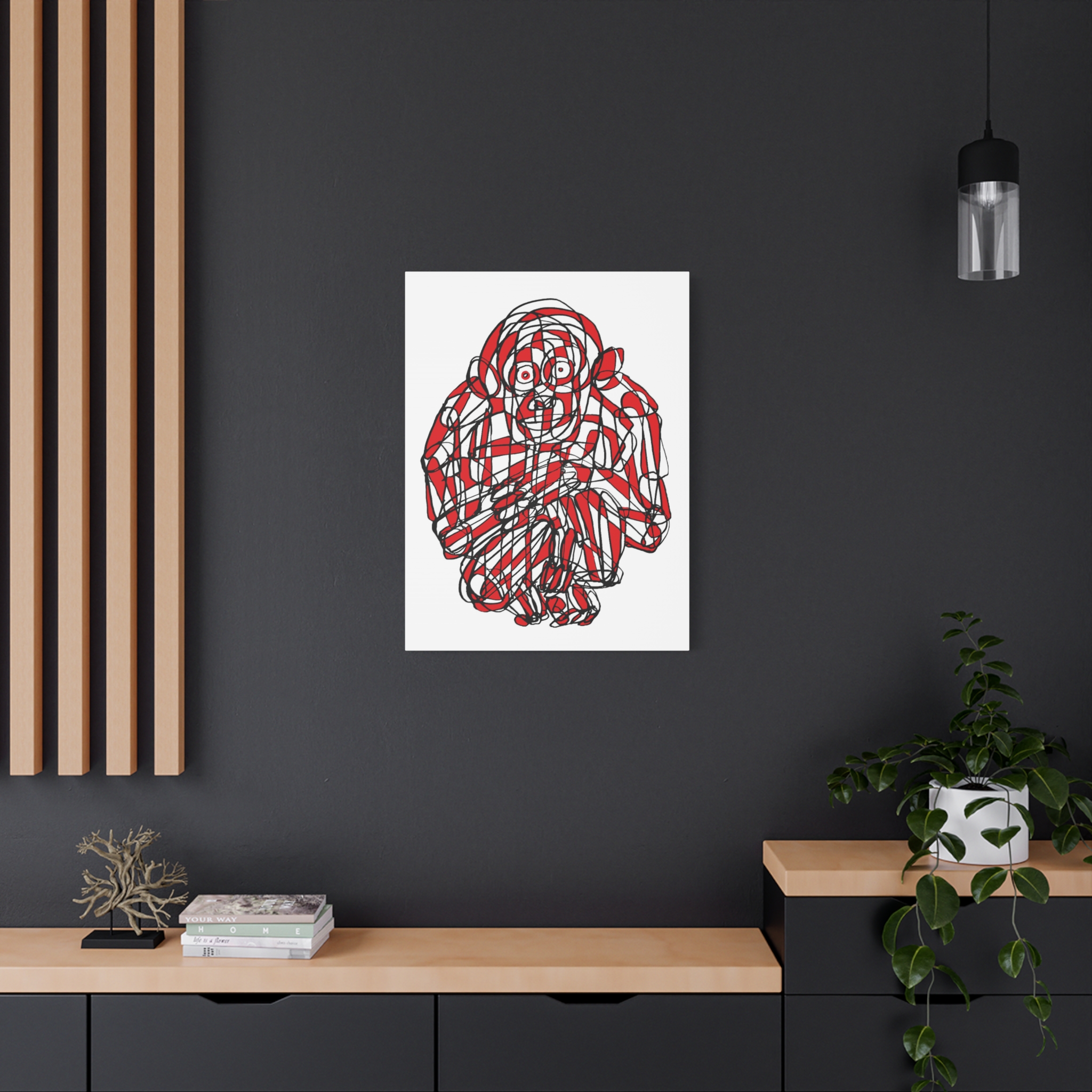 This premium stretched matte canvas showcases the “Monkey Red Black Art Line”—a captivating masterpiece by contemporary artist Roi Pajursky. Featuring a raw, spontaneous energy, this modern abstract illustration uses a sophisticated web of graphic red and black lines to create a bold, expressive primate portrait.