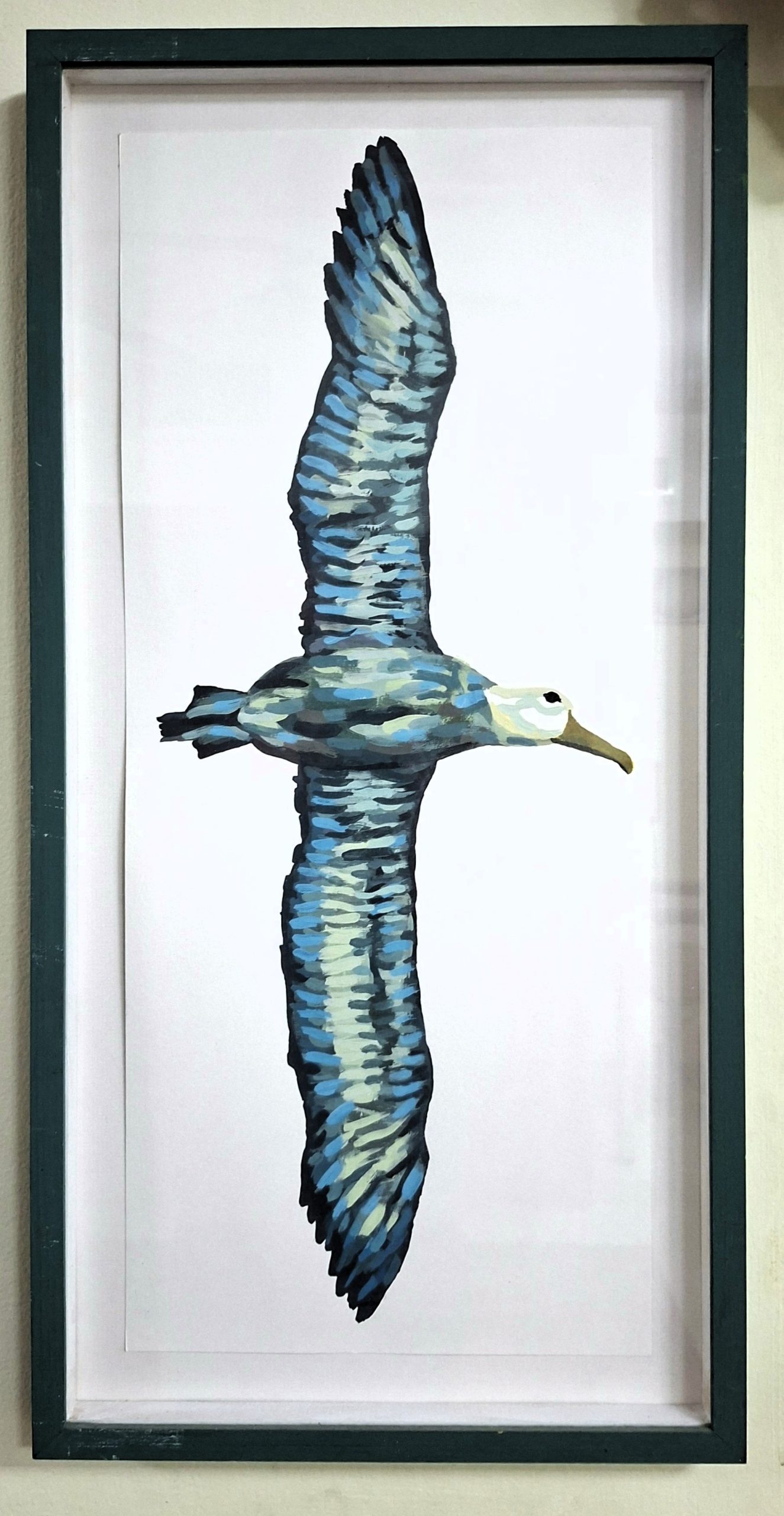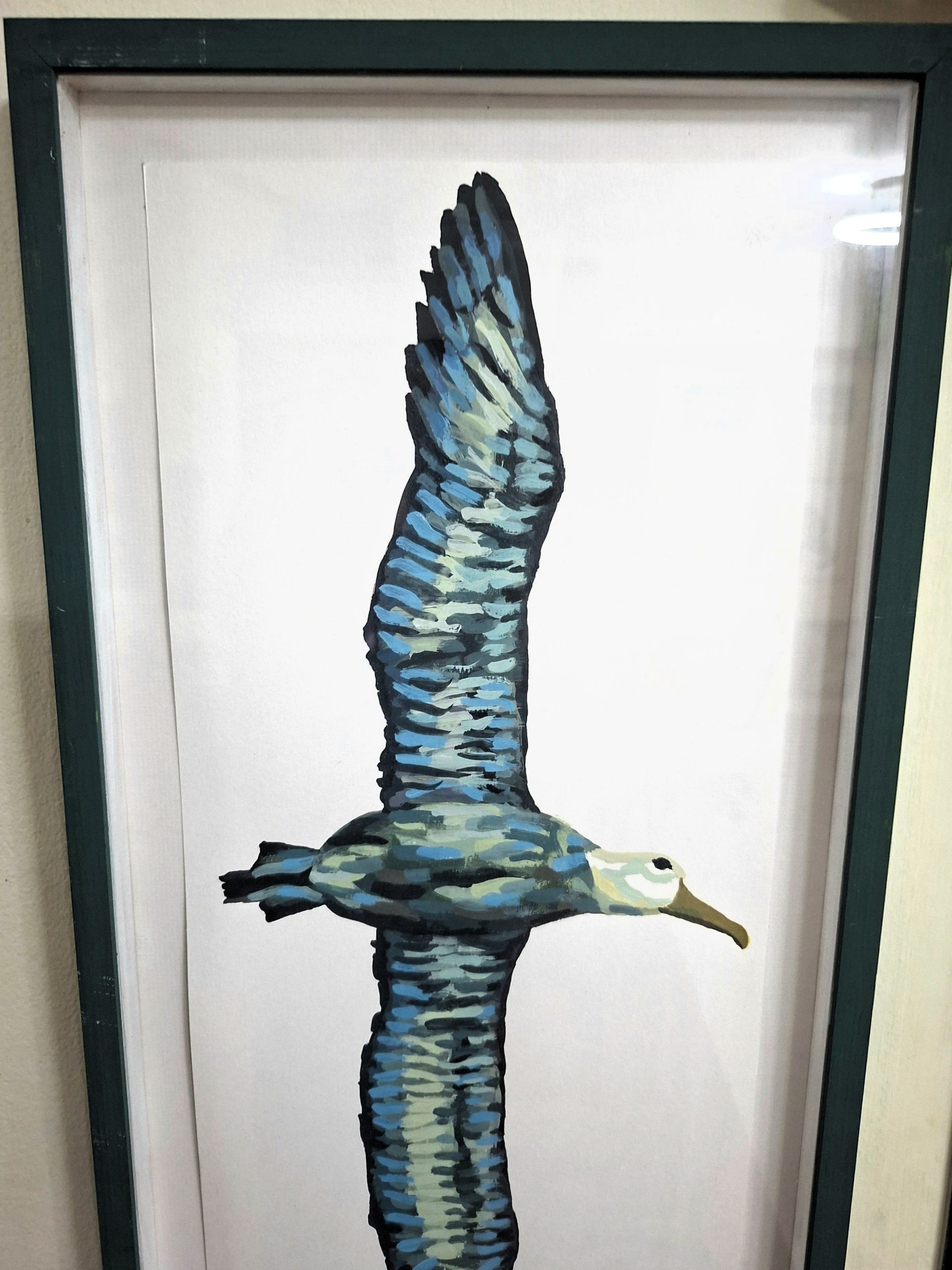 A dynamic and vibrant original watercolor painting (67.5×32.5×3 cm) capturing an Albatross in full flight. Rendered on high-quality paper with rhythmic brushstrokes of teal, emerald, and deep blue, this vertical piece is professionally framed in a deep turquoise frame that perfectly complements its aquatic palette.