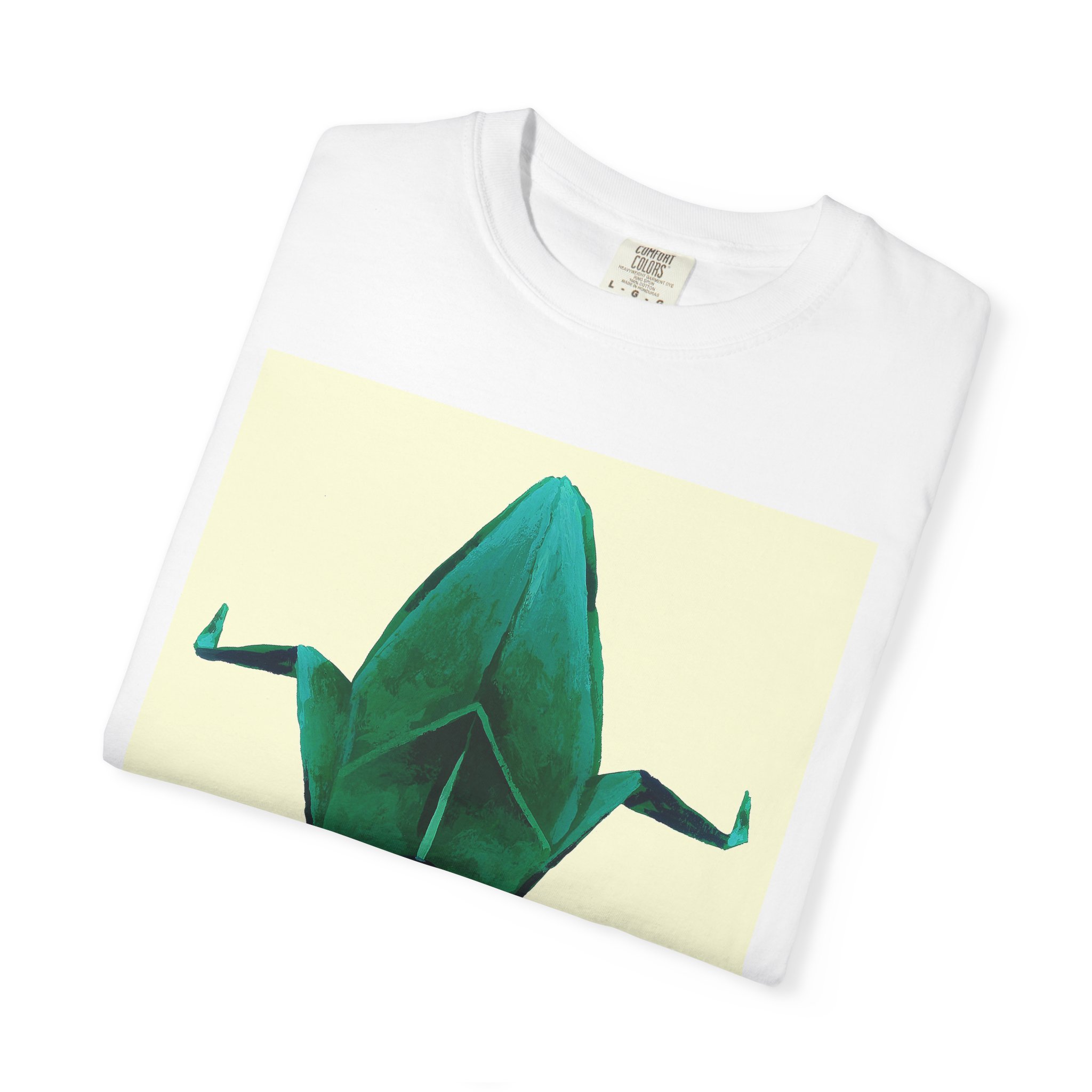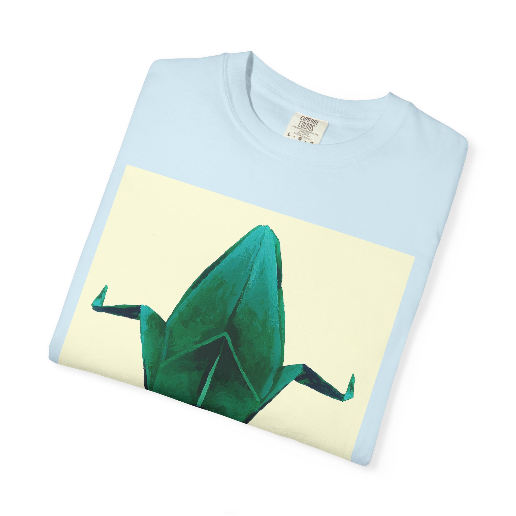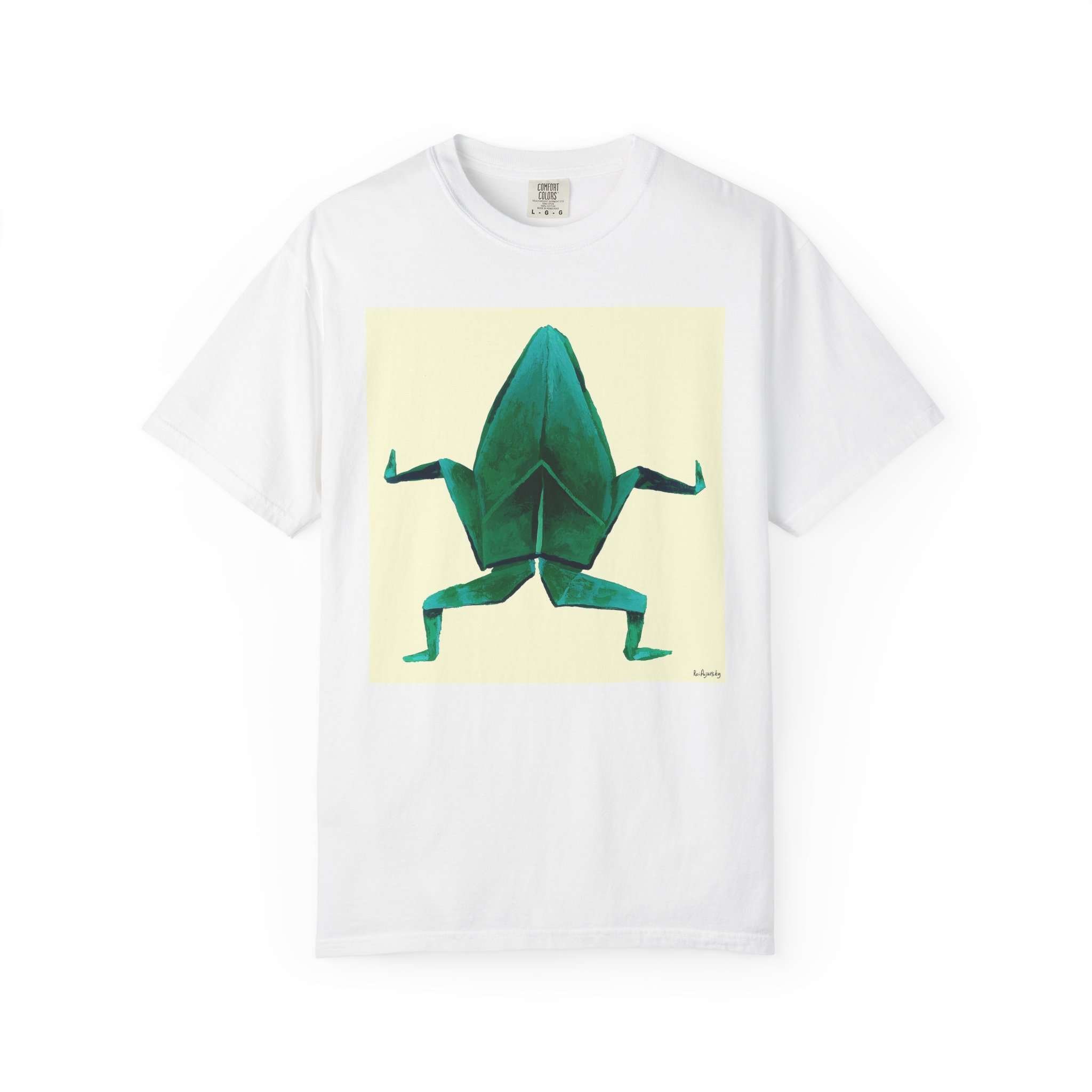 A relaxed, garment-dyed tee printed with a bold, painterly green origami frog centered on a soft, warm-cream square. The heavyweight cotton drapes with a lived-in softness from the post-construction dye, so the shirt feels like an instant favorite. Wear it on mornings when you want a little whimsy — the frog’s squat, confident pose reads playful and quietly proud. It pairs easily with worn denim, a canvas tote, or layered under an open flannel for strolls through markets, gallery hops, or low-key meetups with friends. The clean, graphic placement keeps the design modern while the textured dyeing gives every piece its own subtle variation, so each shirt carries a bit of unique character.