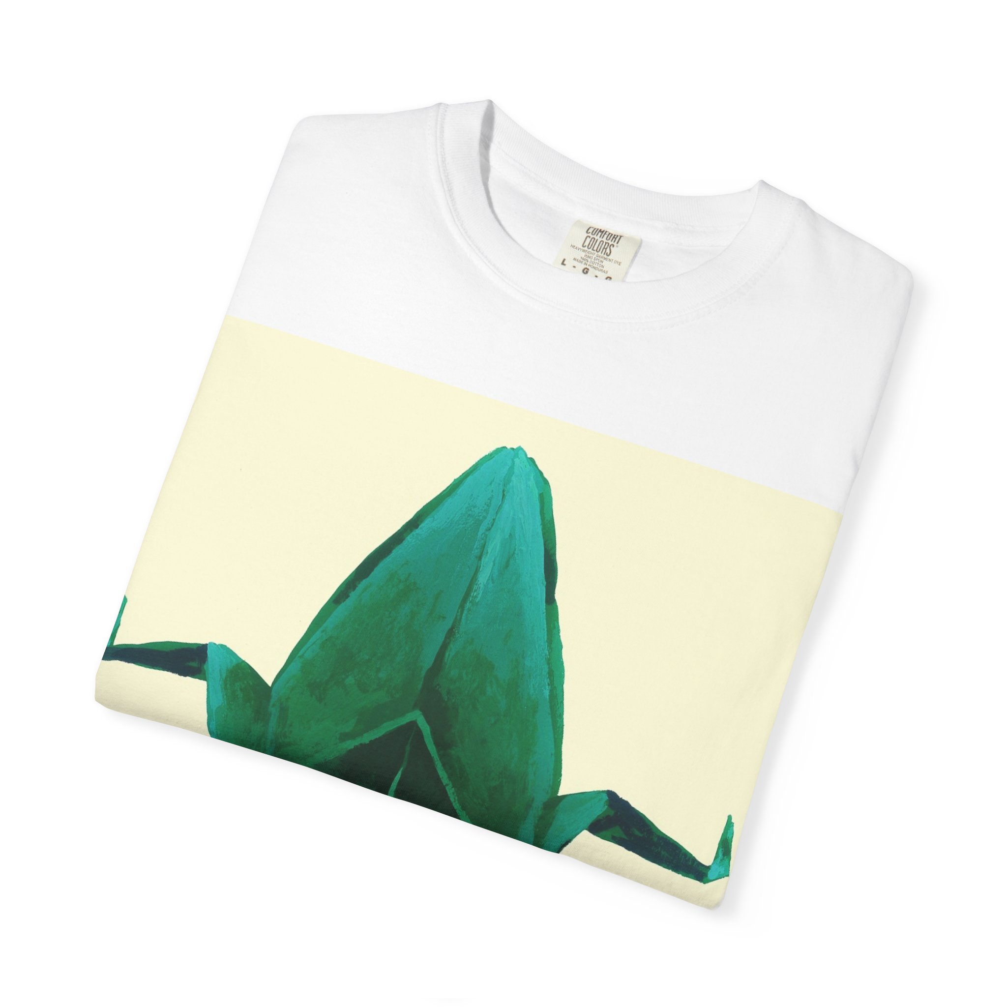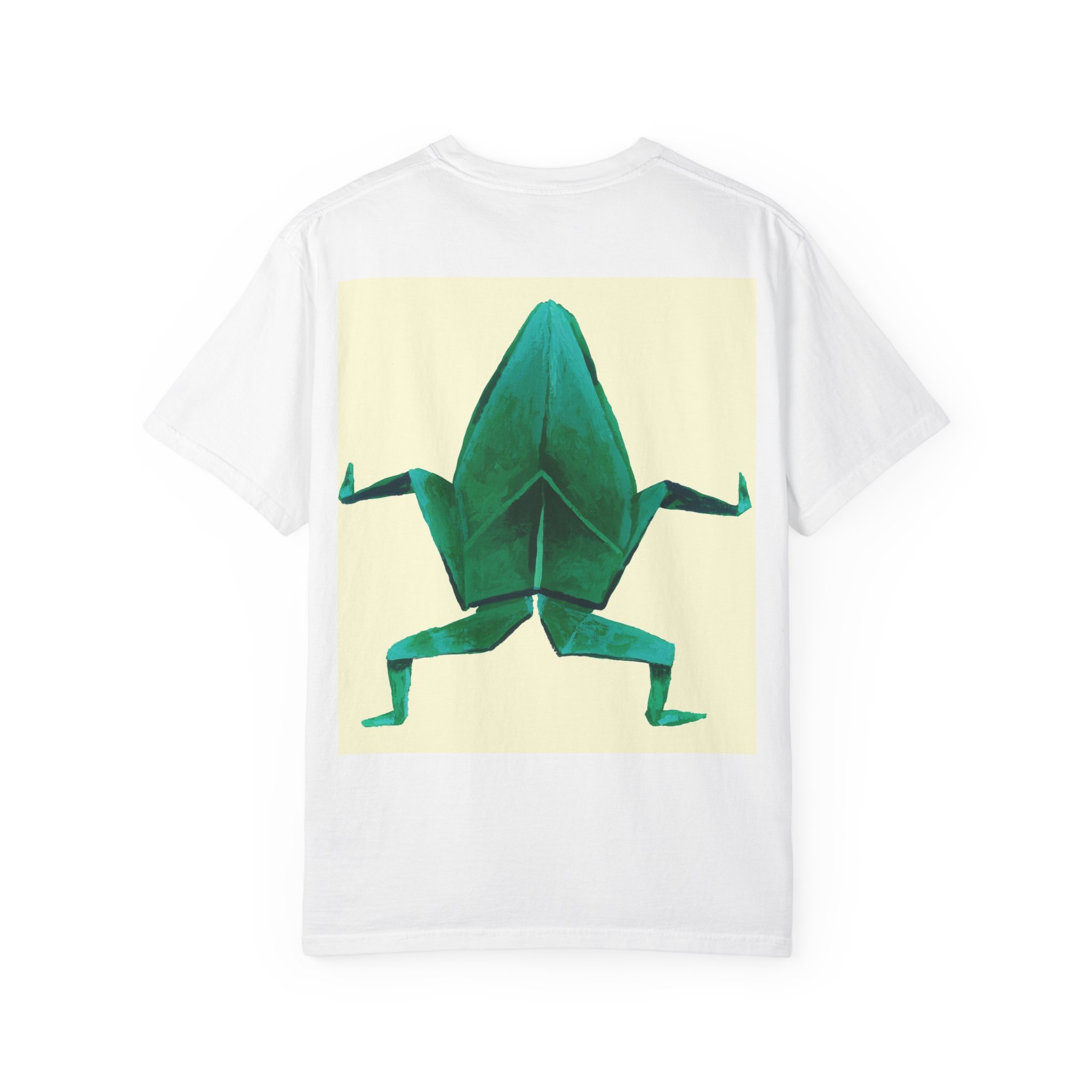 A relaxed, garment-dyed tee printed with a bold, painterly green origami frog centered on a soft, warm-cream square. The heavyweight cotton drapes with a lived-in softness from the post-construction dye, so the shirt feels like an instant favorite. Wear it on mornings when you want a little whimsy — the frog’s squat, confident pose reads playful and quietly proud. It pairs easily with worn denim, a canvas tote, or layered under an open flannel for strolls through markets, gallery hops, or low-key meetups with friends. The clean, graphic placement keeps the design modern while the textured dyeing gives every piece its own subtle variation, so each shirt carries a bit of unique character.