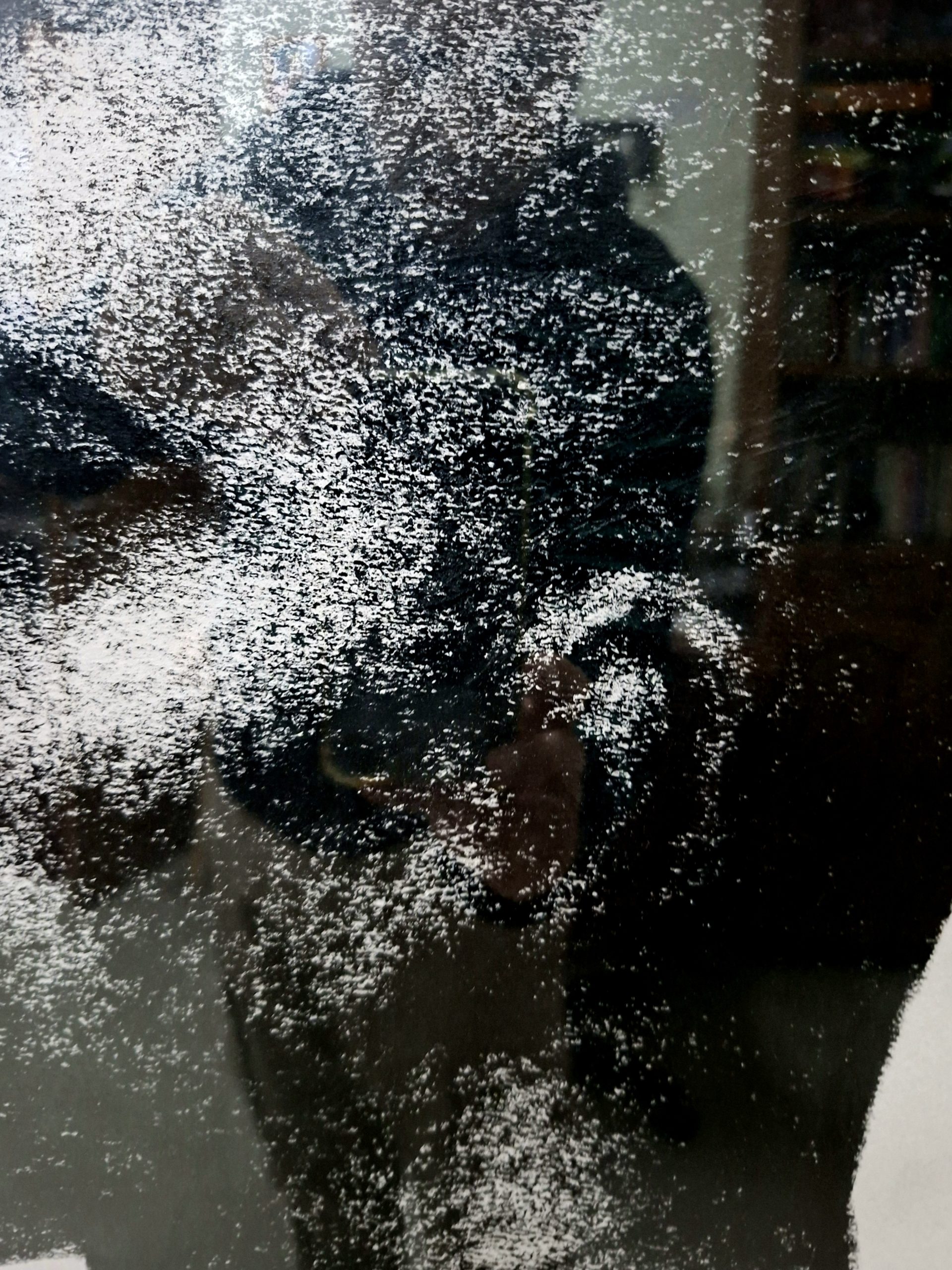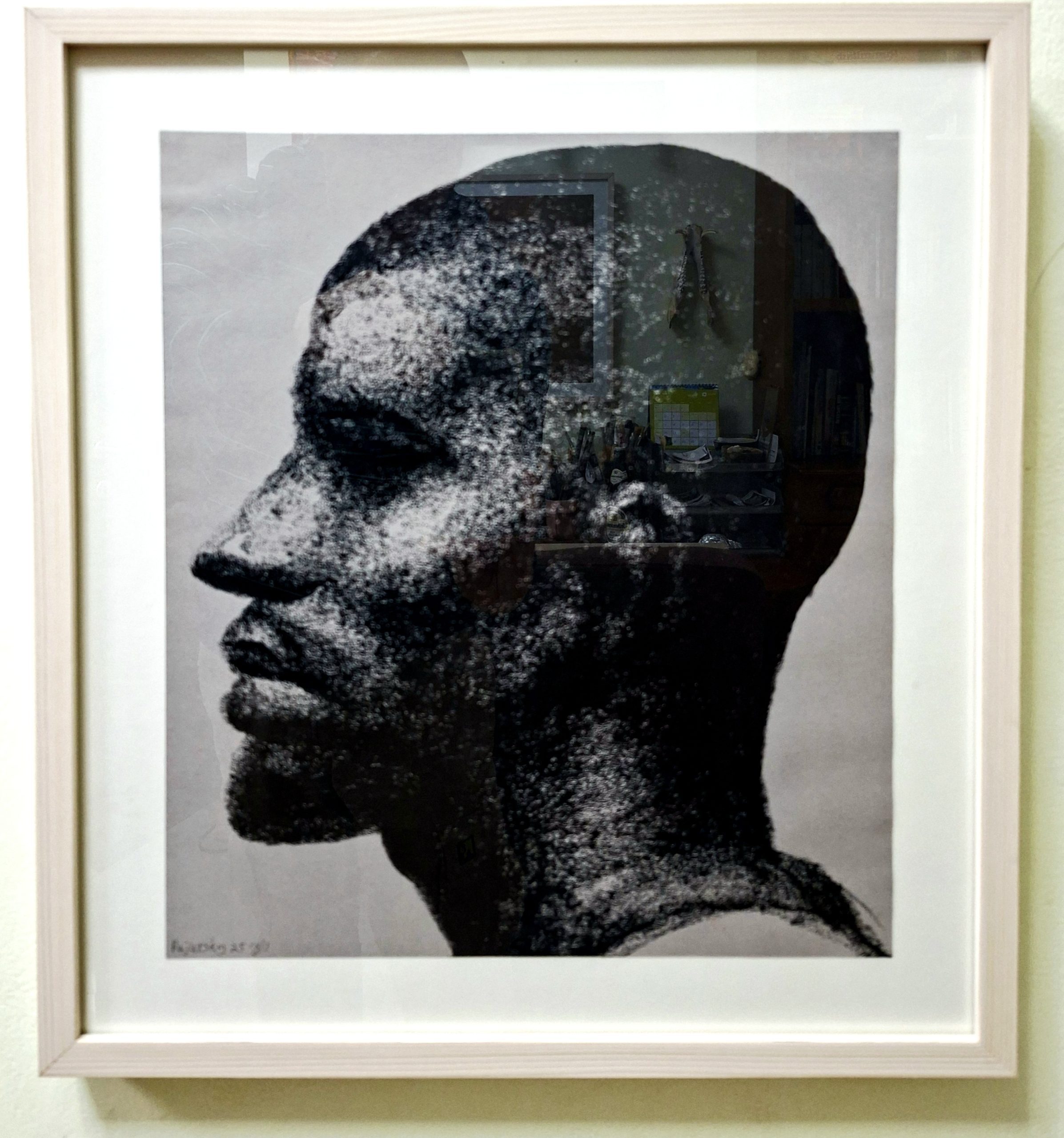 A raw and striking original oil pastel painting (39.5×44.5×3 cm) capturing a male profile with deep expression. Created with textured black oil pastels on paper by Israeli artist Roi Pajursky. This monochrome work focuses on expressionistic form and comes professionally framed in a modern white wooden frame with glass, ready to become a powerful centerpiece in your art collection.