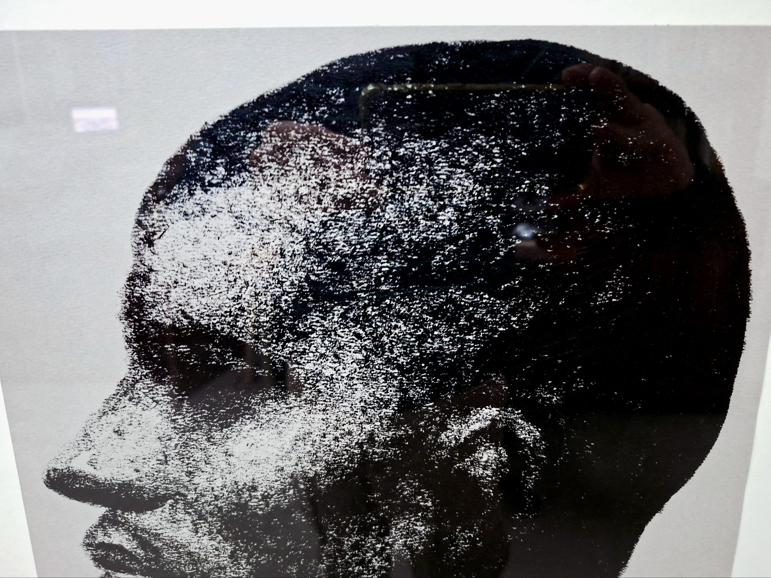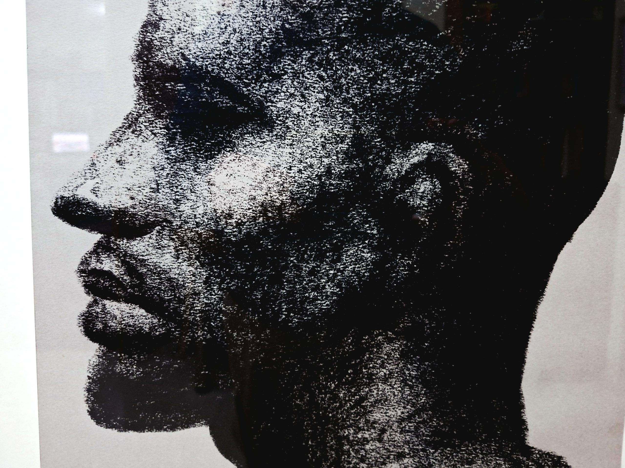 Through the unique, granular quality of black oil pastels on specialized paper, the artist has sculpted a powerful male profile. The intense, cross-hatched and smudged technique gives the piece a tactile depth, emphasizing the rugged contours and raw emotion of the subject against the calm, light gray background.