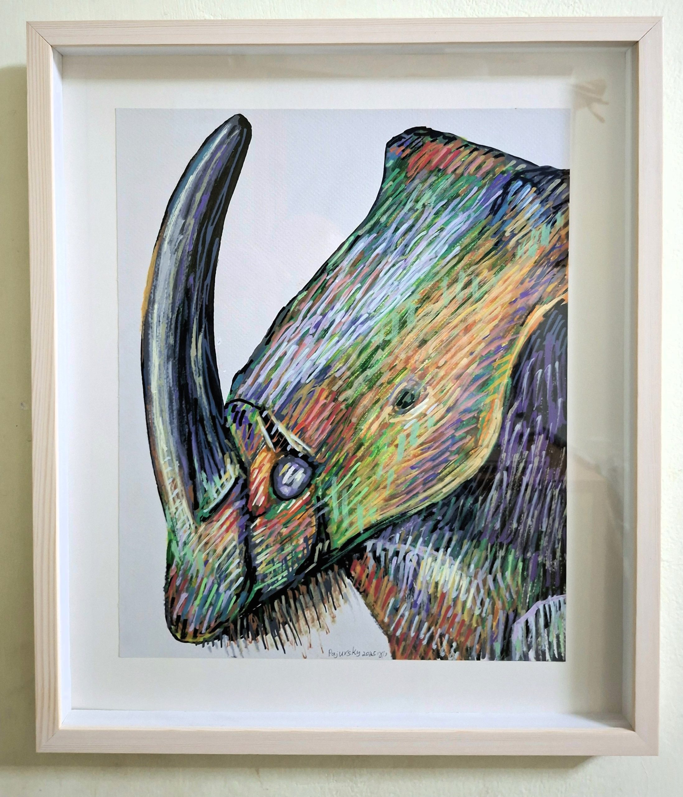 A bold and electric original acrylic markers painting titled “Sapphire Beetle.” Featuring vibrant blue tones and precise graphic detail, this 40×47 cm framed artwork offers a modern take on wildlife illustration.