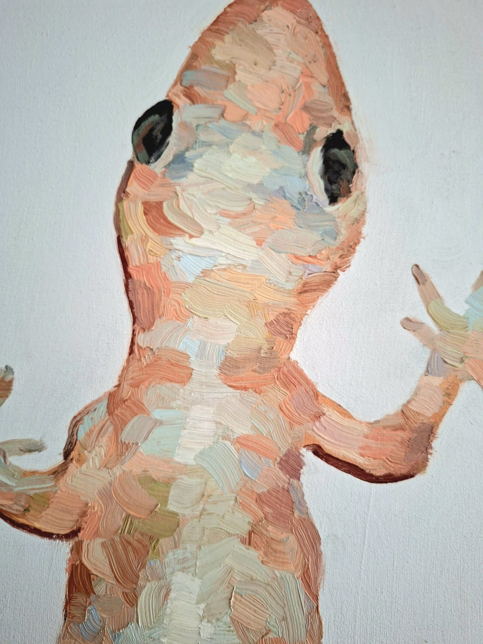 The composition features a slender, vertically oriented gecko, rendered with bold, rhythmic applications of oil paint that create a physical, three-dimensional quality on the canvas.