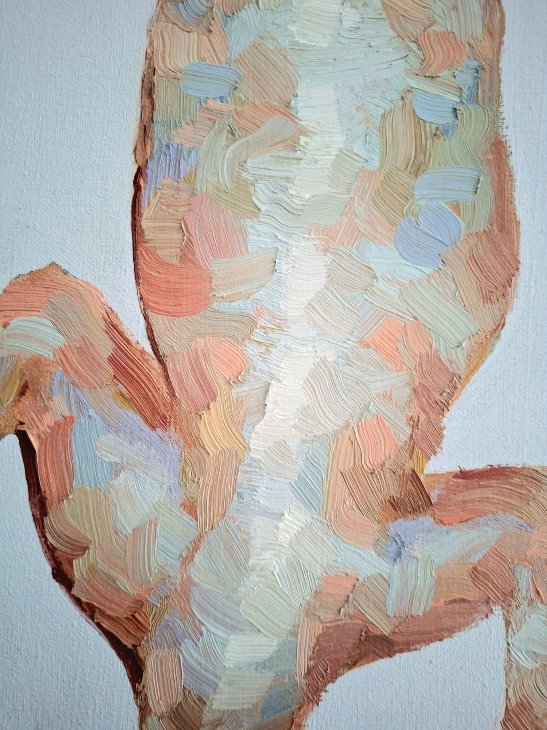 A vibrant and textured original oil painting (104x34x3 cm) capturing the delicate form of a Gecko. This striking vertical piece features rich impasto brushwork in a playful palette of coral, turquoise, and warm earth tones, set against a serene, light-catching background.