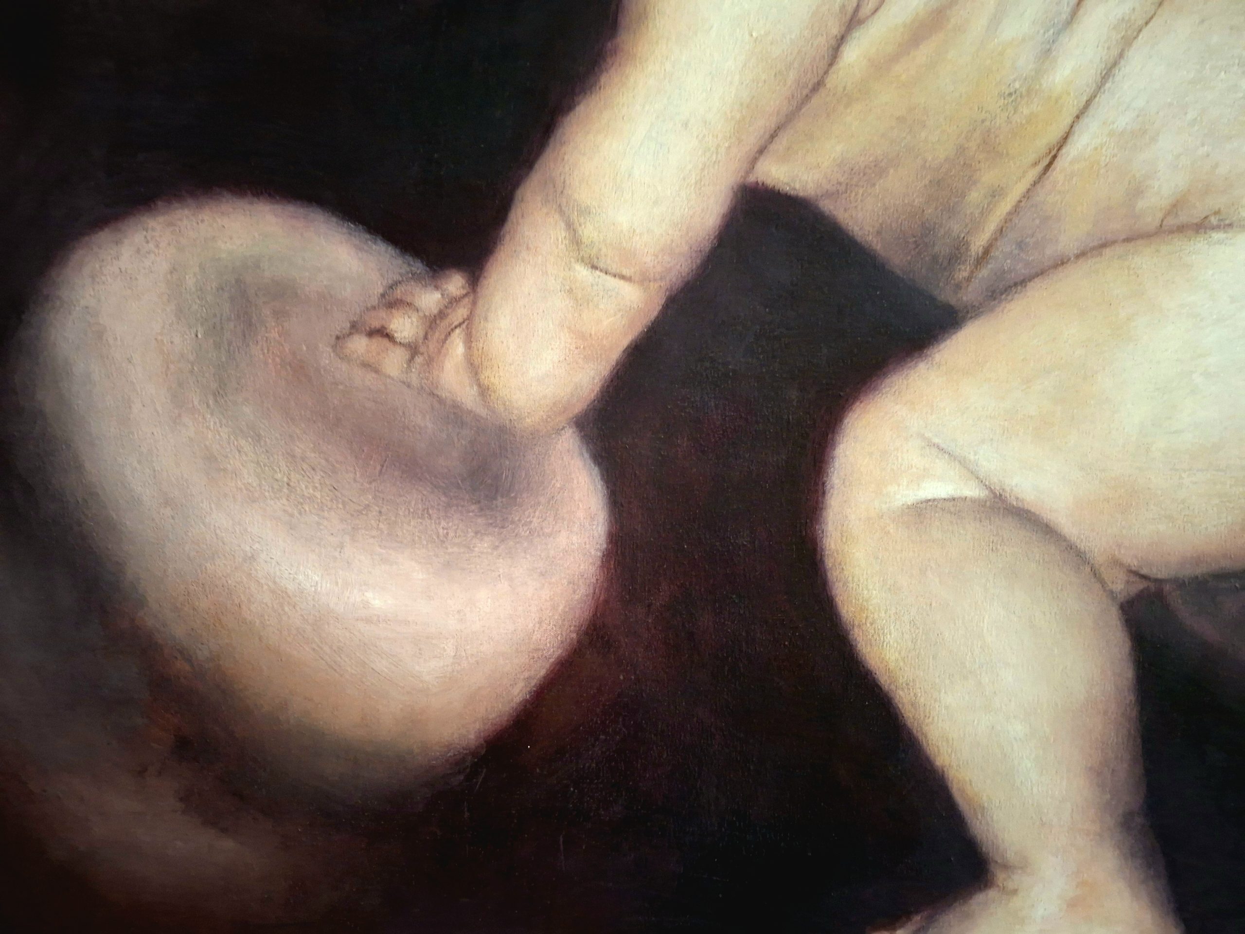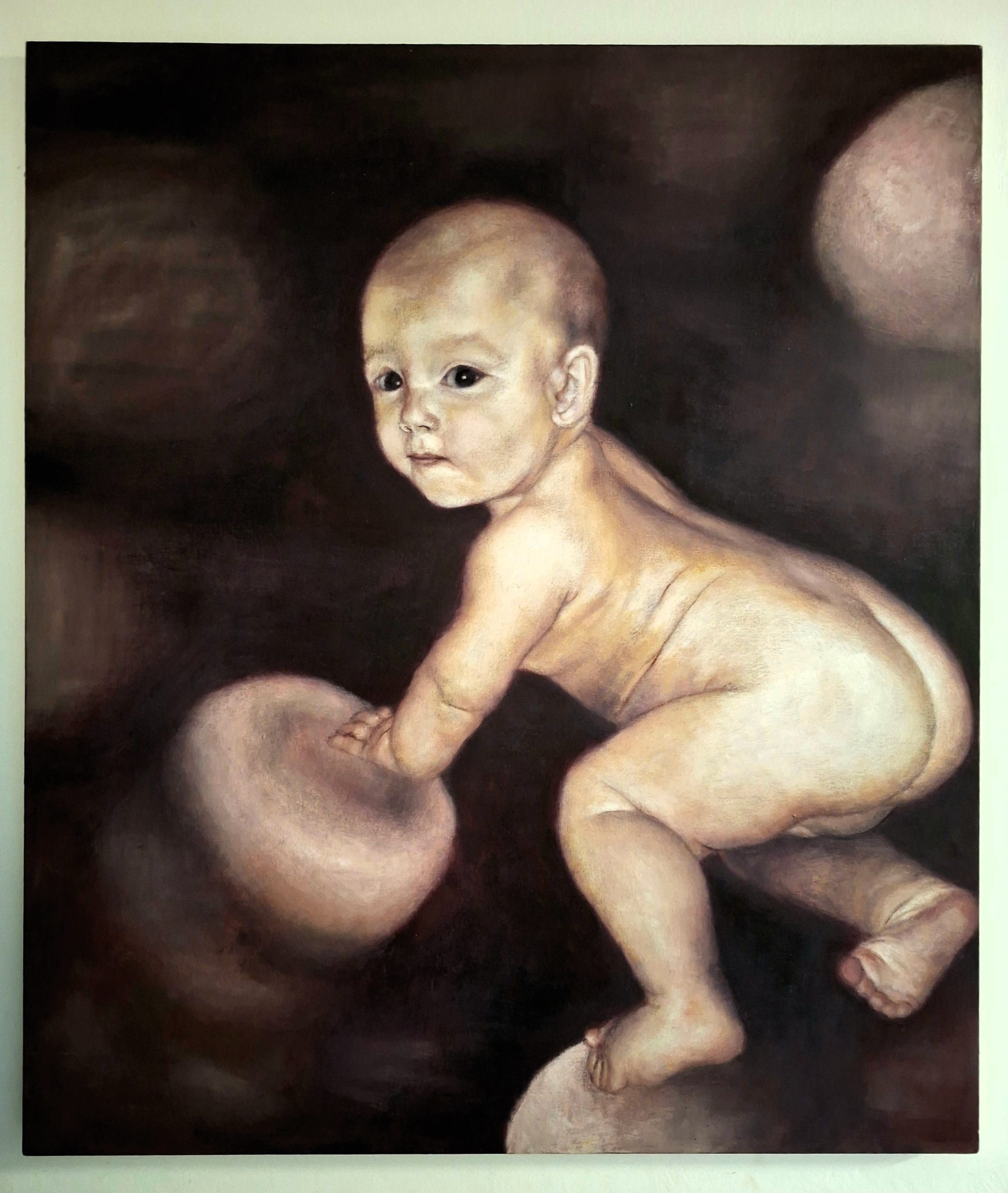 The composition centers on a crawling infant, captured with remarkable anatomical detail and a soft, luminous quality that contrasts beautifully with the dark, mysterious environment.