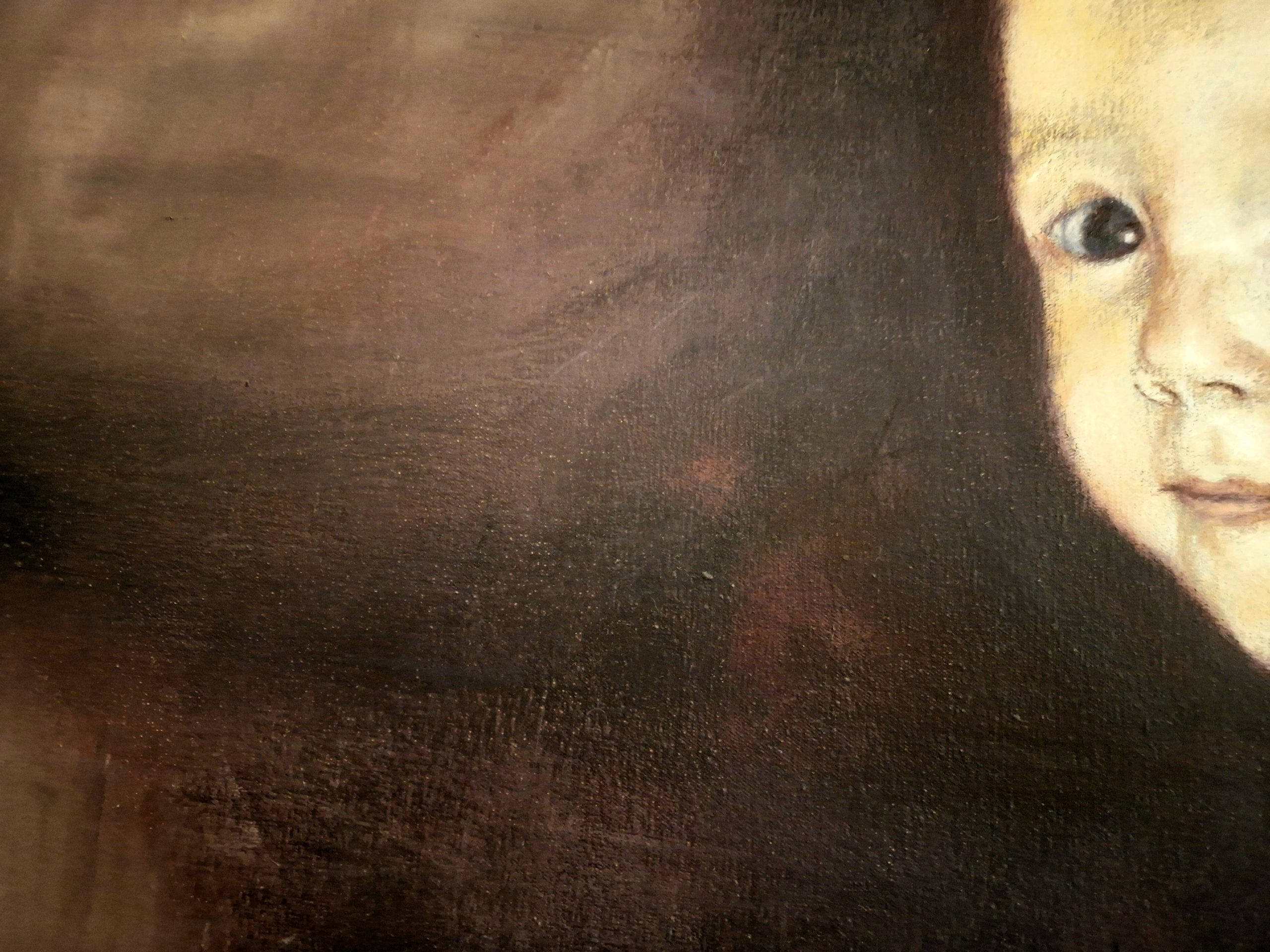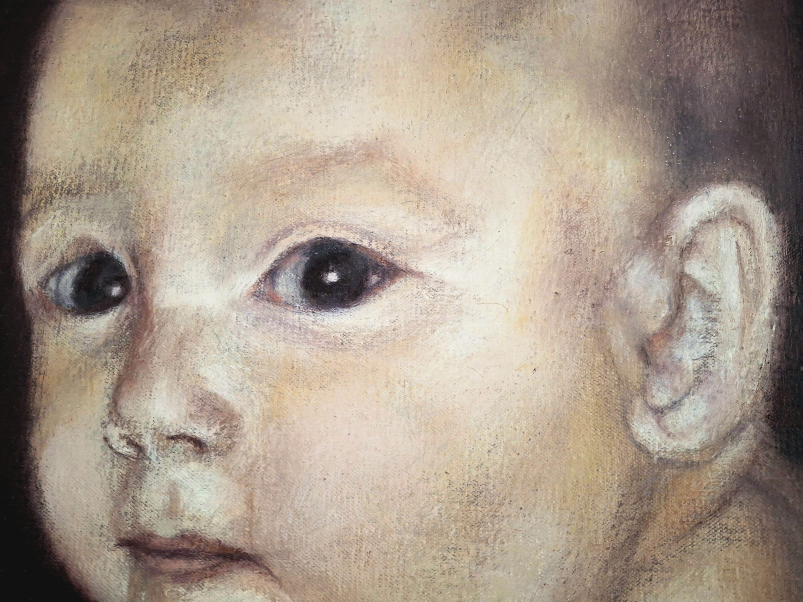 A captivating and surreal original oil painting exploring themes of innocence and beginnings. This large-scale work (136x115x3 cm) features a delicate portrait of a child set against an atmospheric, dreamlike background, rendered with soft textures and a deep, emotive color palette.