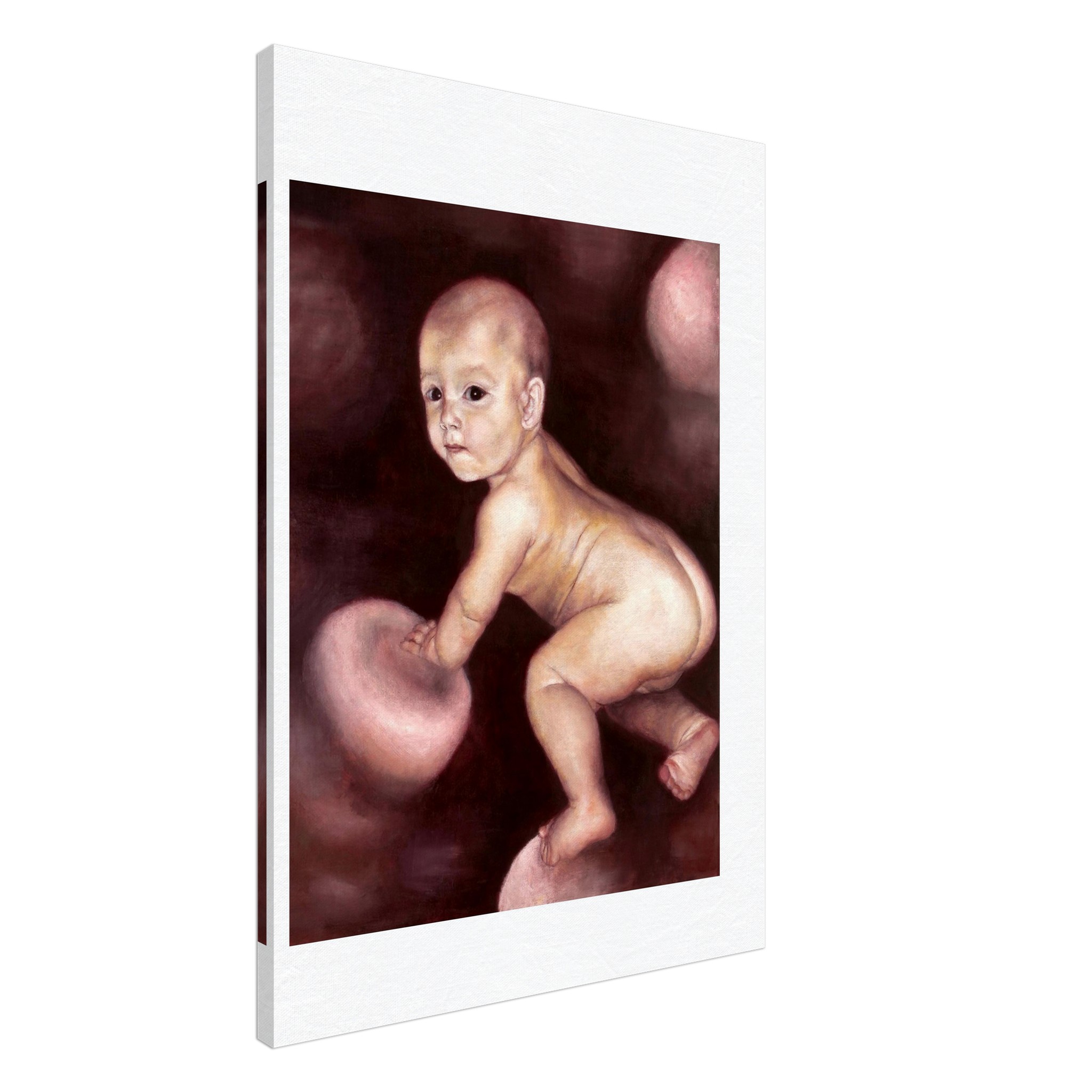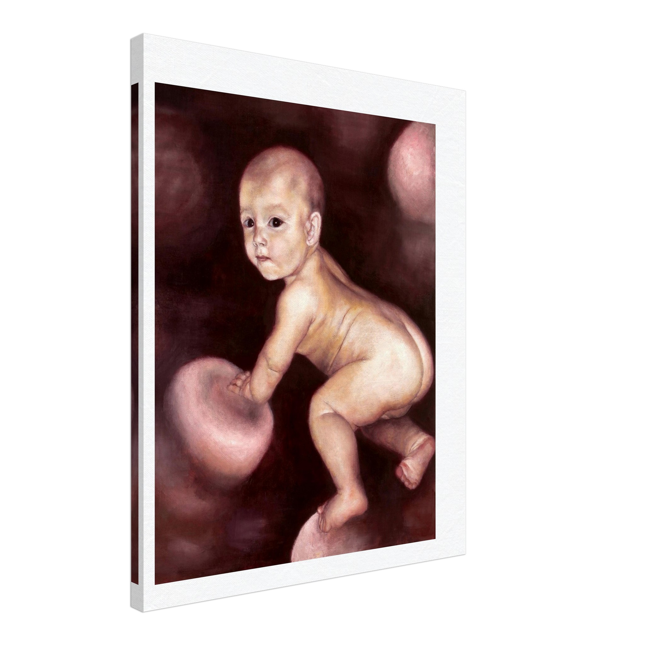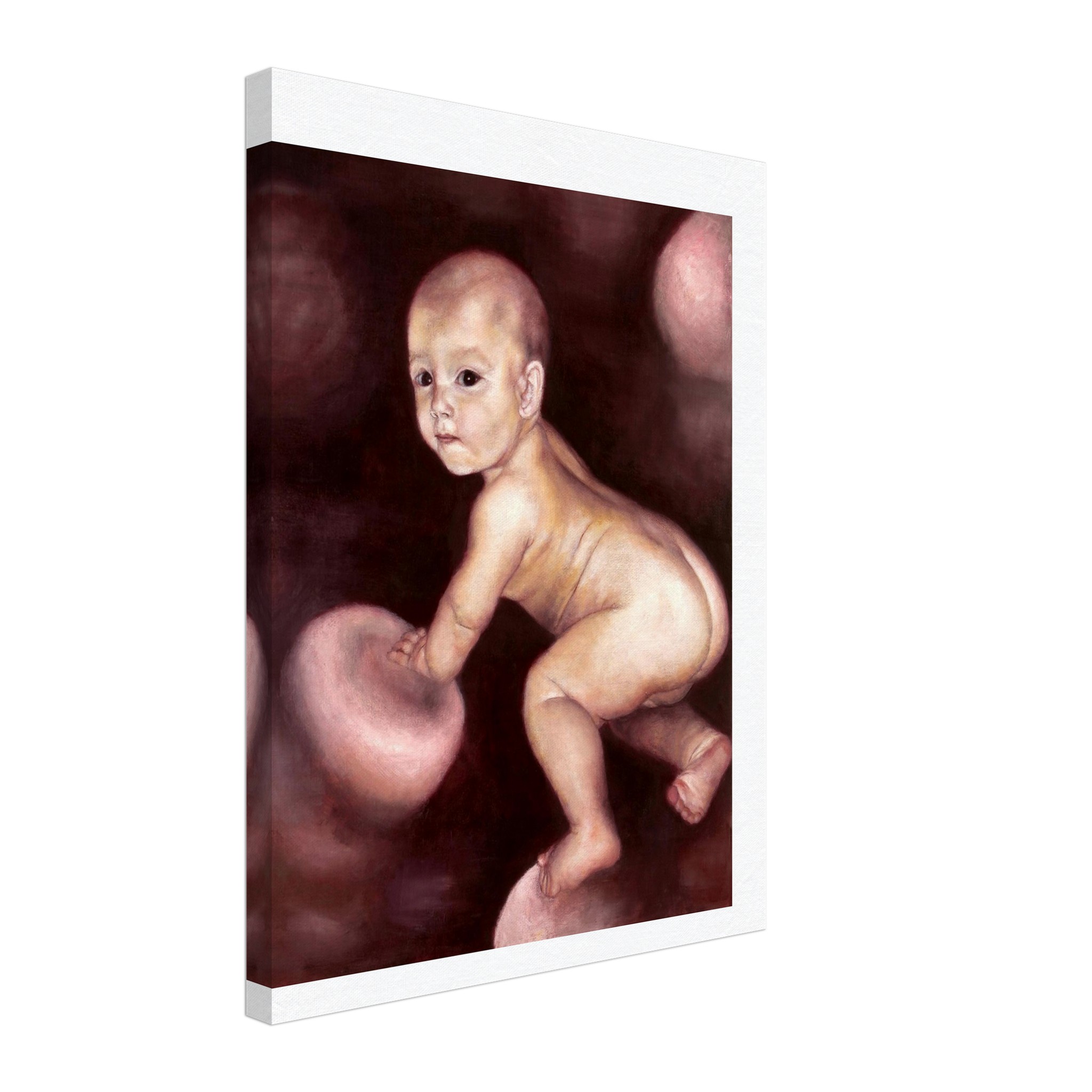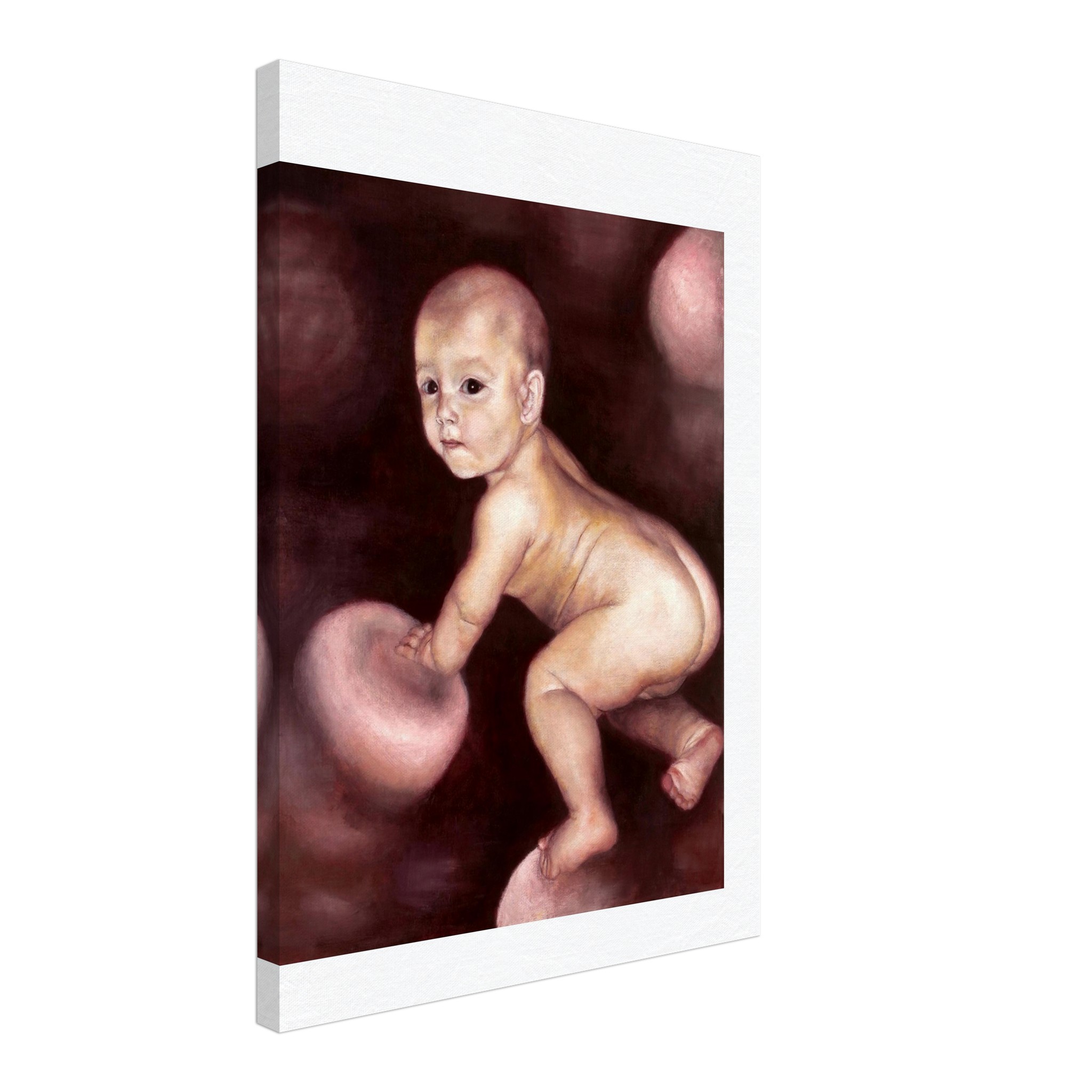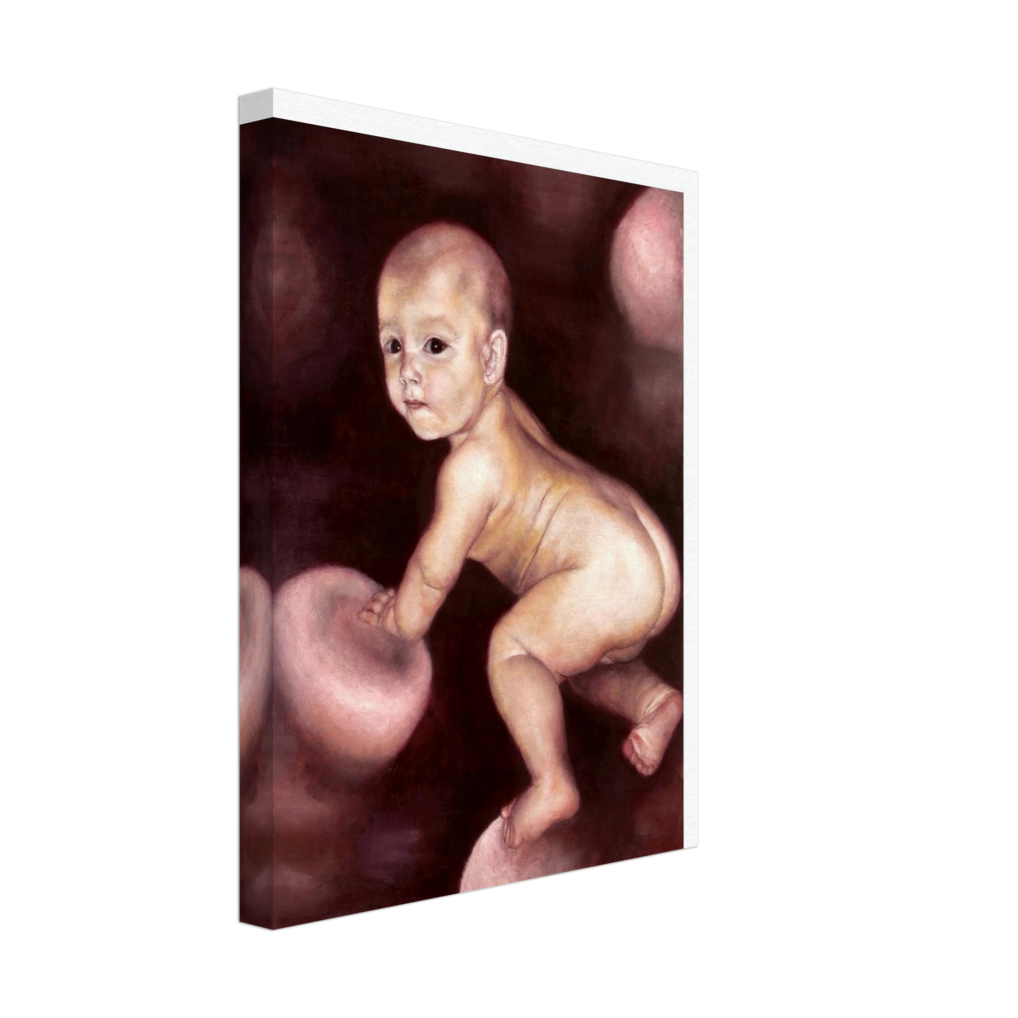 A hauntingly beautiful study of innocence and form. This premium framed canvas print features a surrealist depiction of a newborn, blending classical portraiture techniques with a moody, atmospheric depth. The rich textures and visceral lighting make this a provocative statement piece for collectors of modern figurative art.