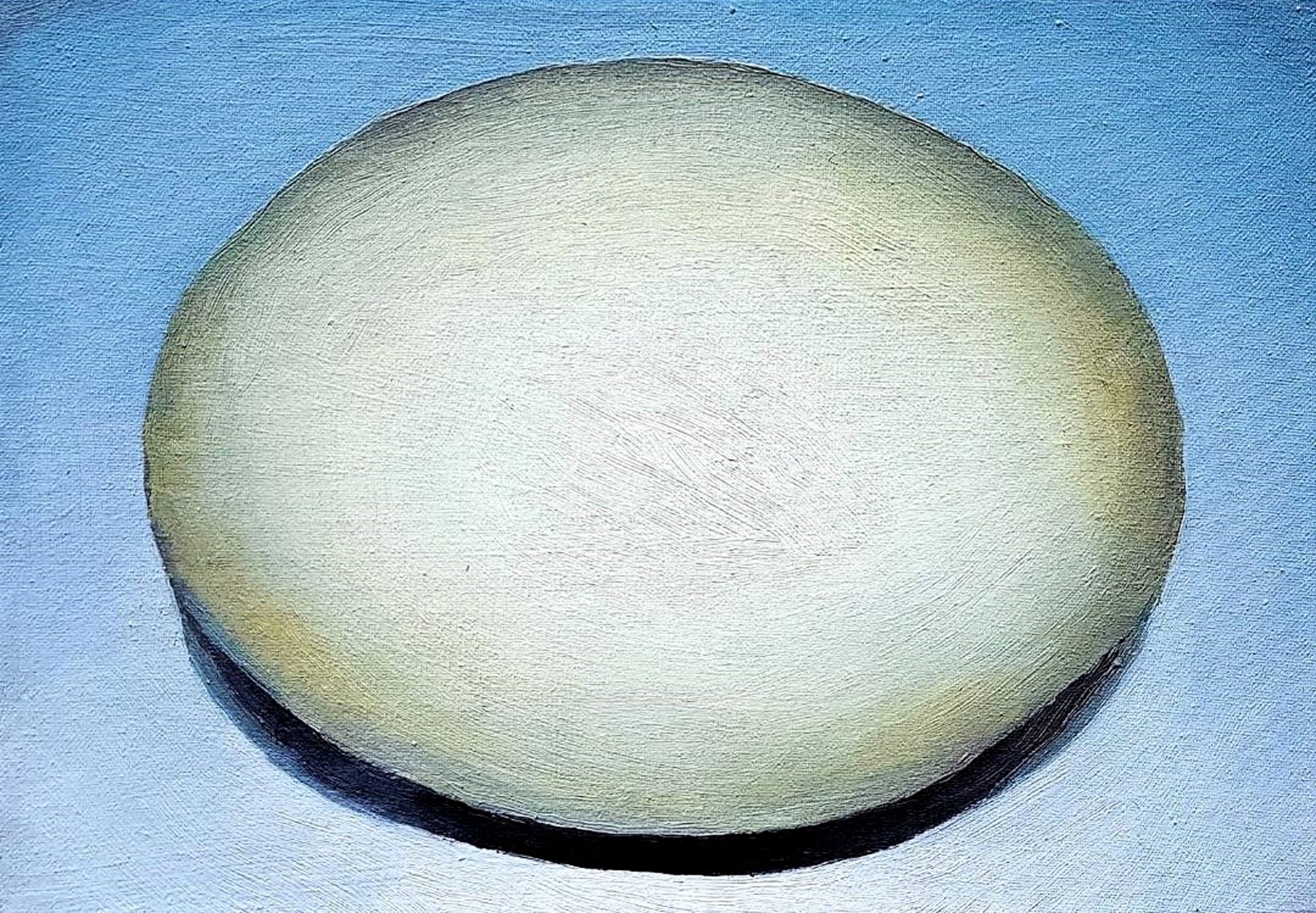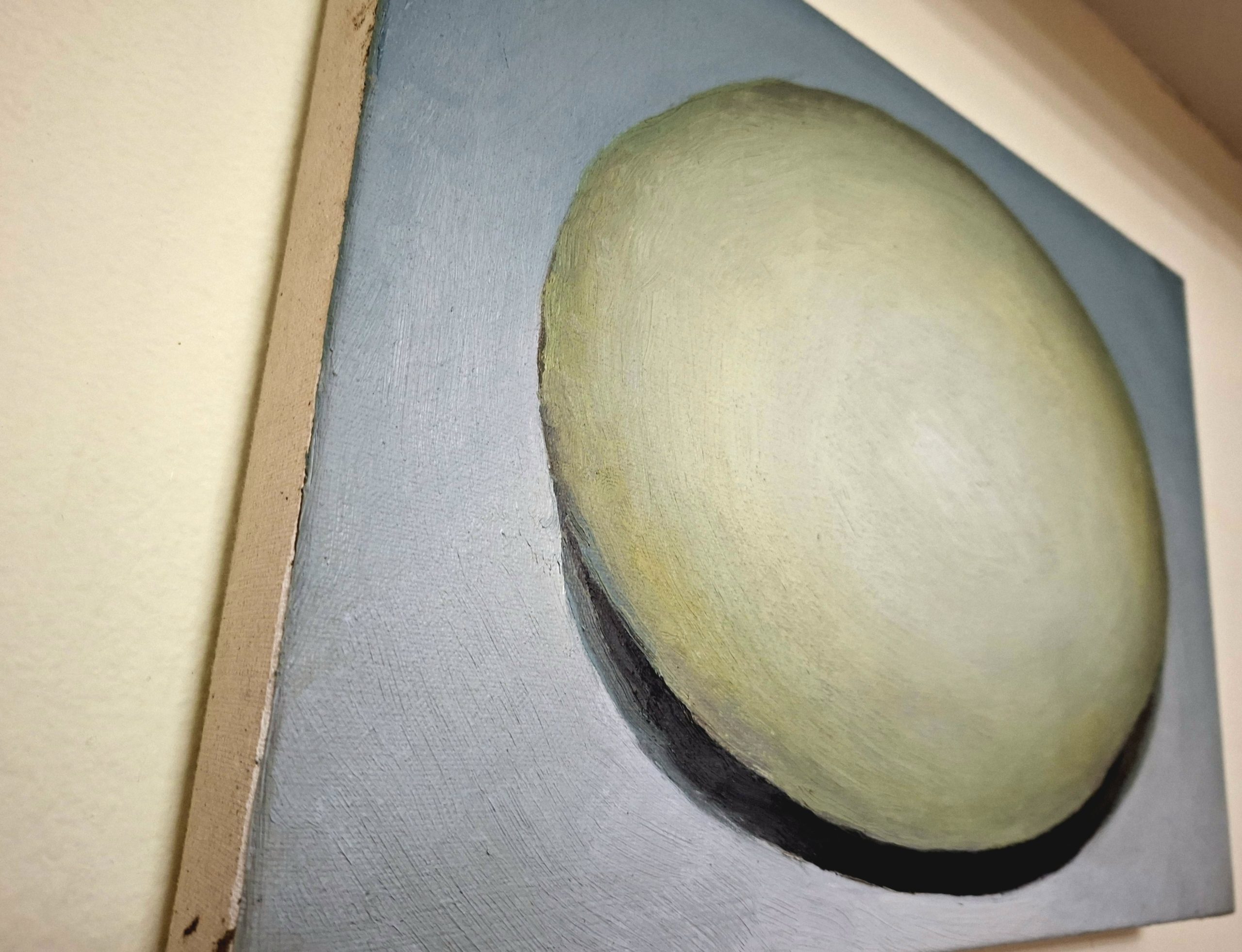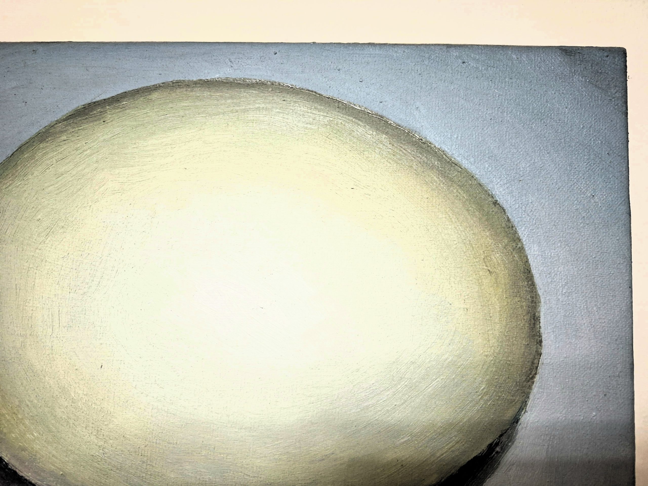 A serene and minimalist original oil painting (25x36x3 cm) capturing the perfect, organic form of an egg. This horizontal composition features soft, luminous textures and subtle shading, set against a calming sky-blue background that emphasizes the timeless simplicity of the subject.