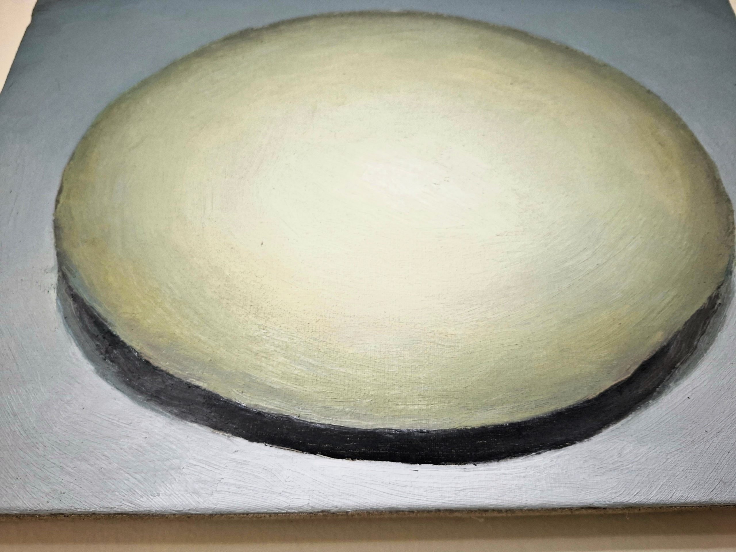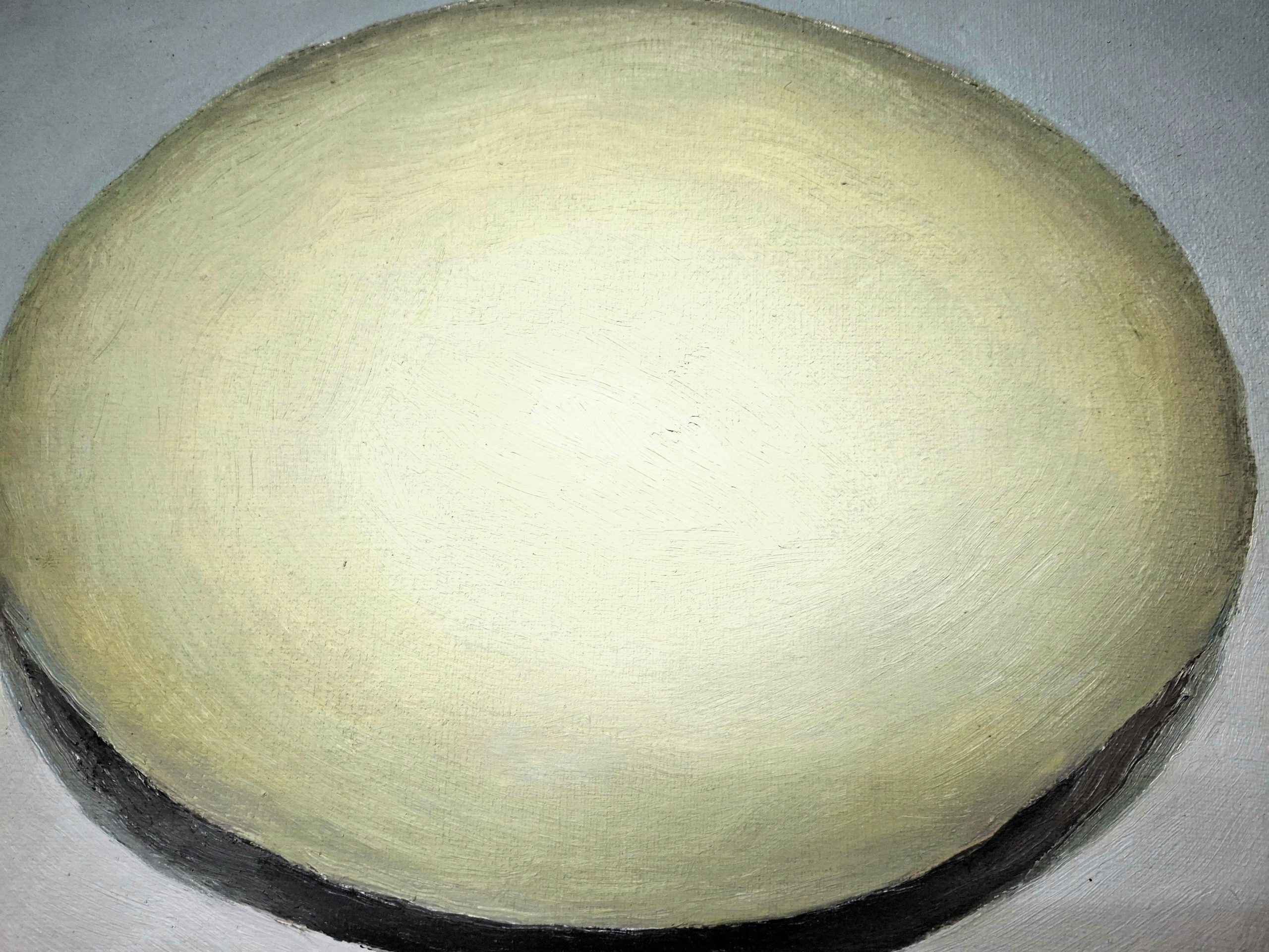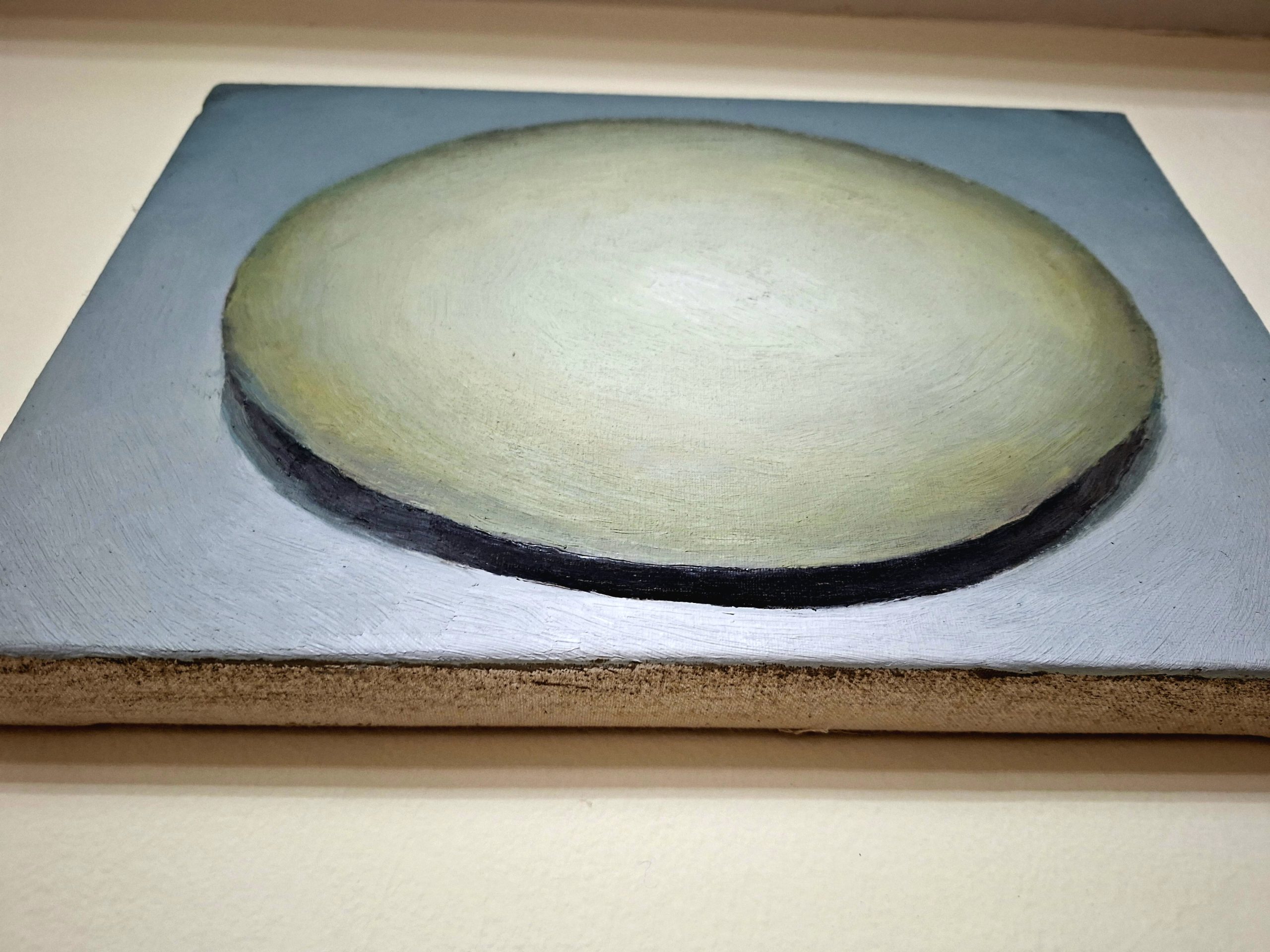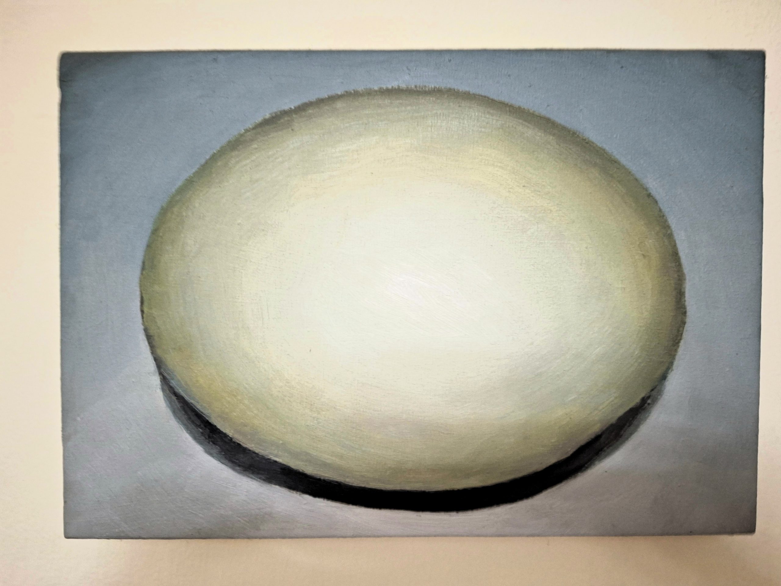 A serene and minimalist original oil painting (25x36x3 cm) capturing the perfect, organic form of an egg. This horizontal composition features soft, luminous textures and subtle shading, set against a calming sky-blue background that emphasizes the timeless simplicity of the subject.
