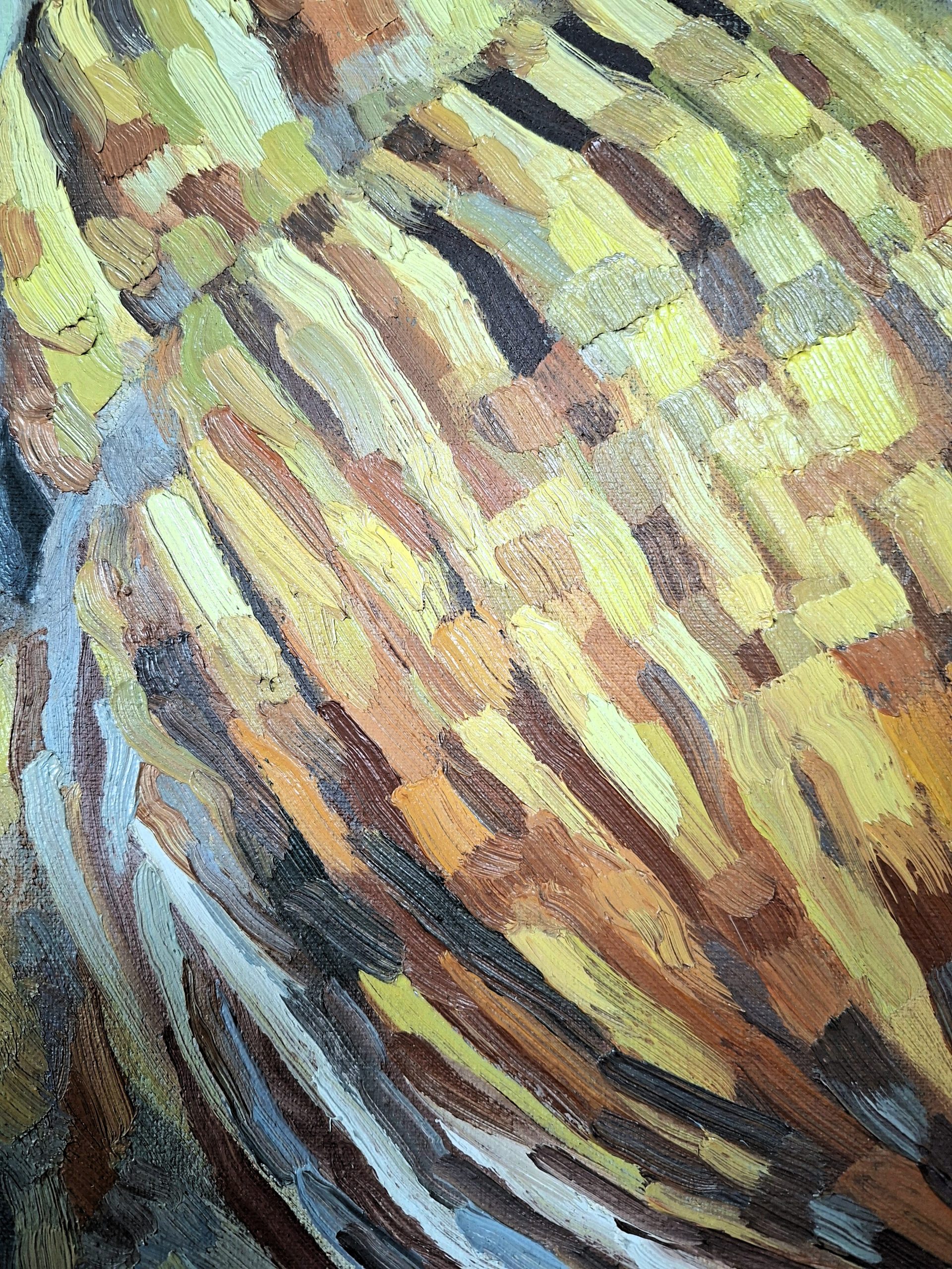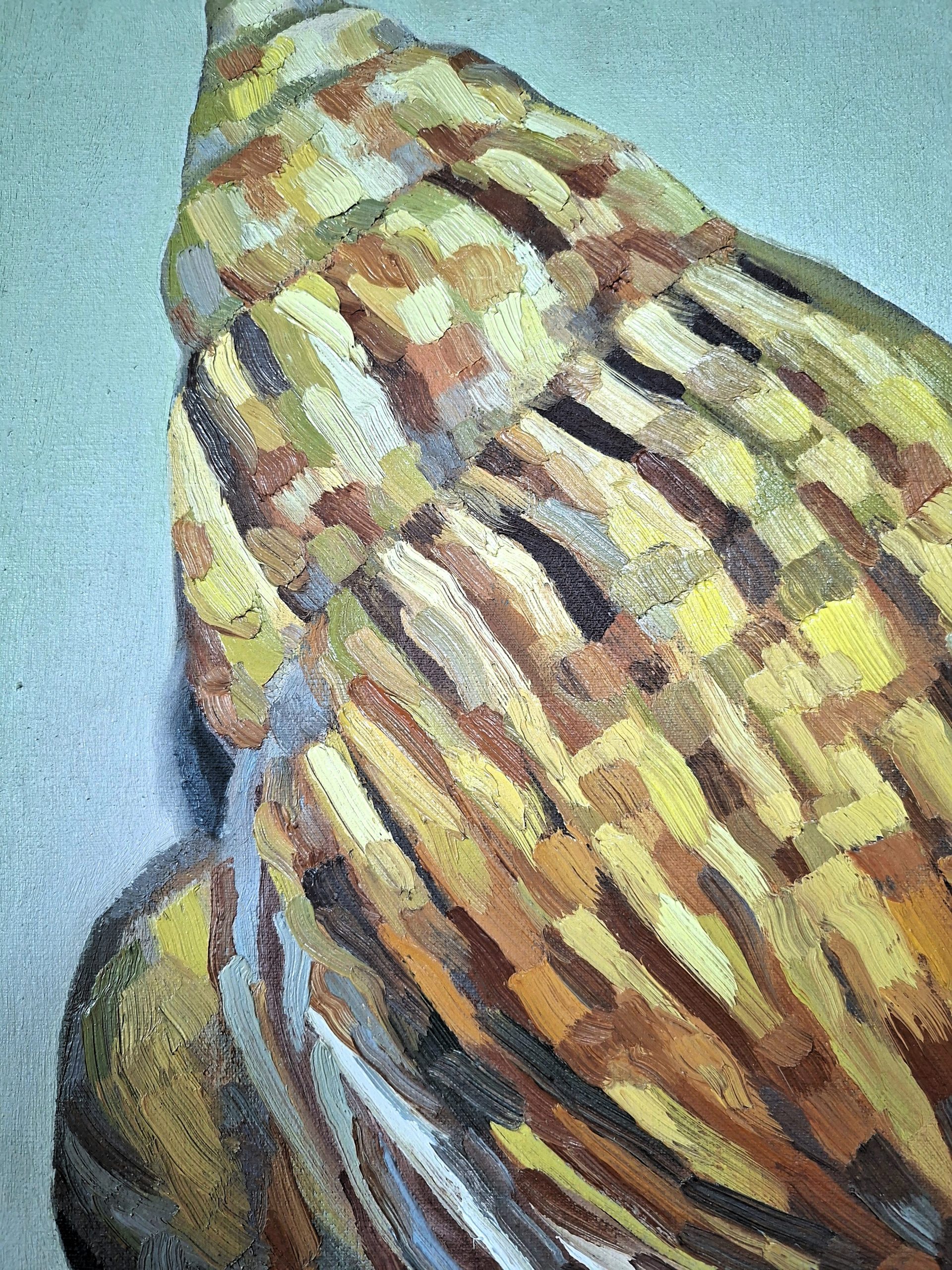 A textured and luminous original oil painting (47x35x3 cm) capturing the intricate patterns of a sea shell. Rendered with rhythmic, mosaic-like brushwork in a palette of warm ochre, sienna, and soft sand tones against a serene mint-green background.