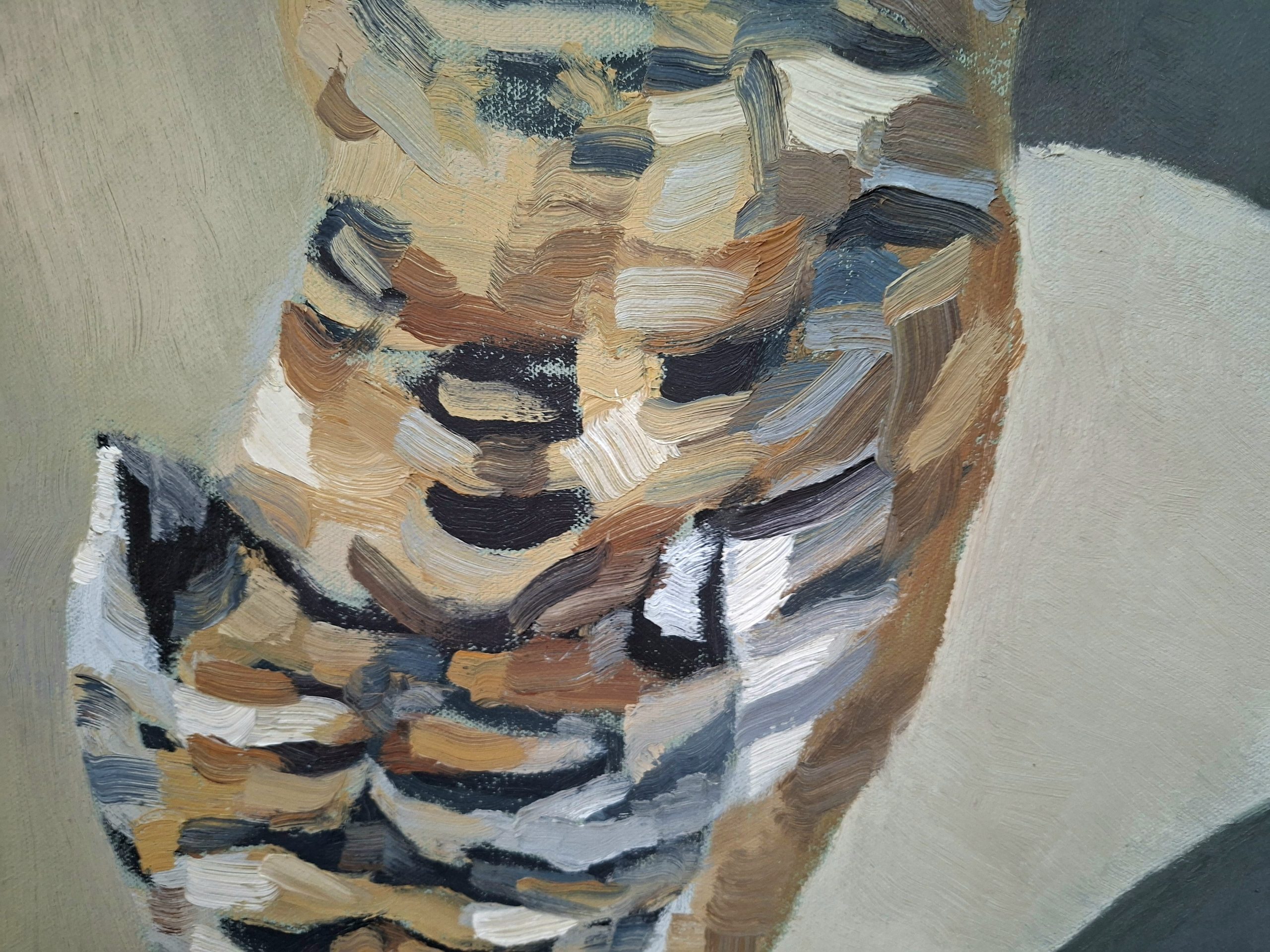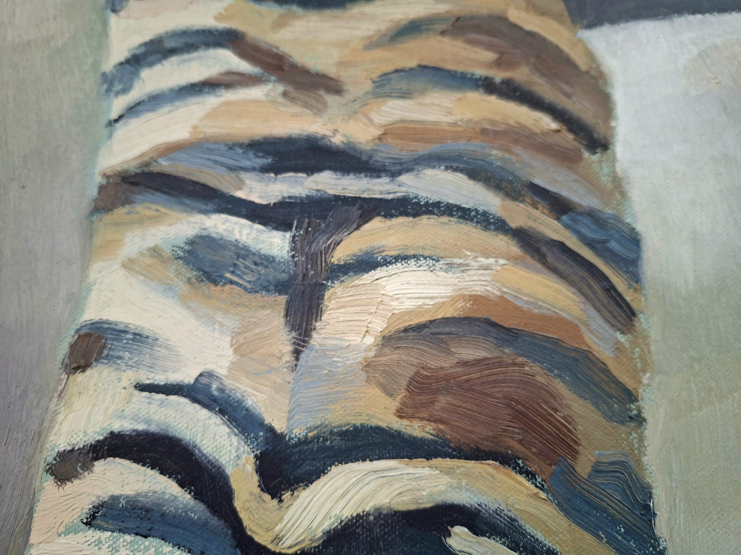 A captivating and thought-provoking original oil painting (108.5x90x3 cm) that explores duality and form. Featuring a vibrant, detailed tiger contrasted with its large, ethereal shadow, this large-scale canvas is rendered with expressive brushwork and a sophisticated, neutral color palette.
