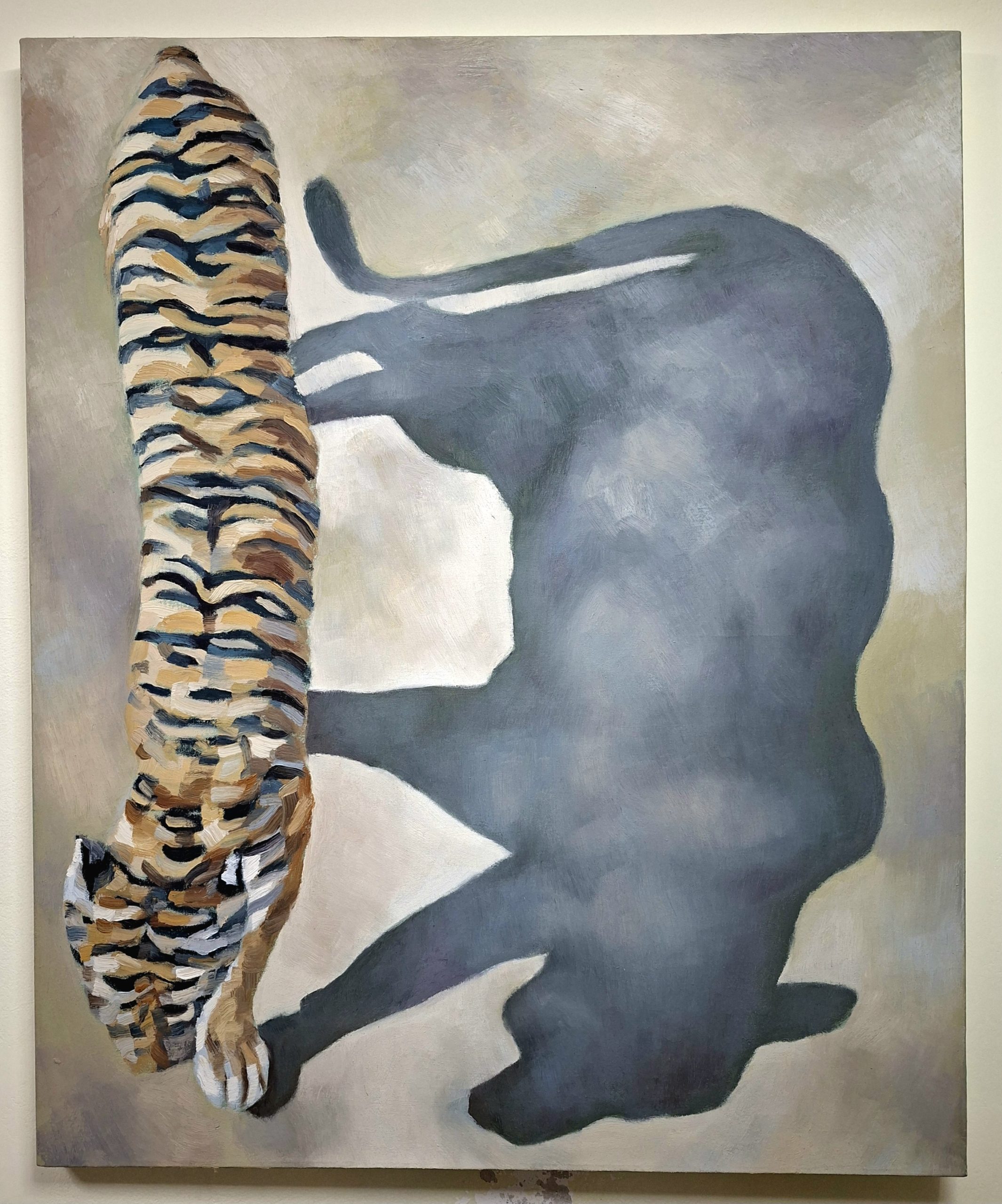 The true focus of the piece is the expansive, blue-grey shadow cast by the tiger, which takes on a simplified, almost abstract form. This juxtaposition between the intricate detail of the animal and the broad, flat shape of its shadow creates a surreal and contemplative narrative. The generous scale of the canvas allows the viewer to fully immerse themselves in the rhythmic application of paint and the striking contrast of the subject.
