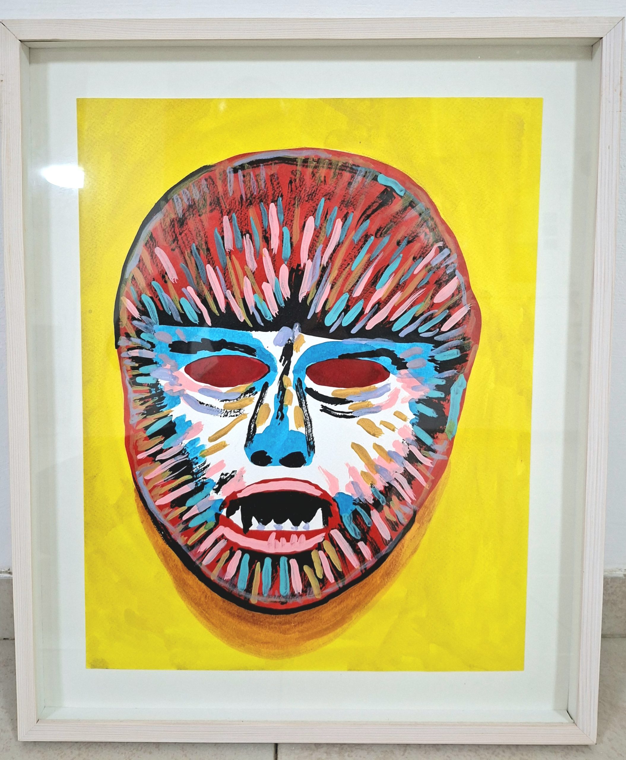 An intricate and thought-provoking original ink painting (45×55.5×3 cm) exploring the vibrant depths of tribal and surreal expression. Created with a unique combination of detailed stippled ink linework and bold yellow, red, and cyan washes on archival paper, this piece comes professionally framed in a white wooden frame, ready to add a sophisticated artistic touch to your collection.