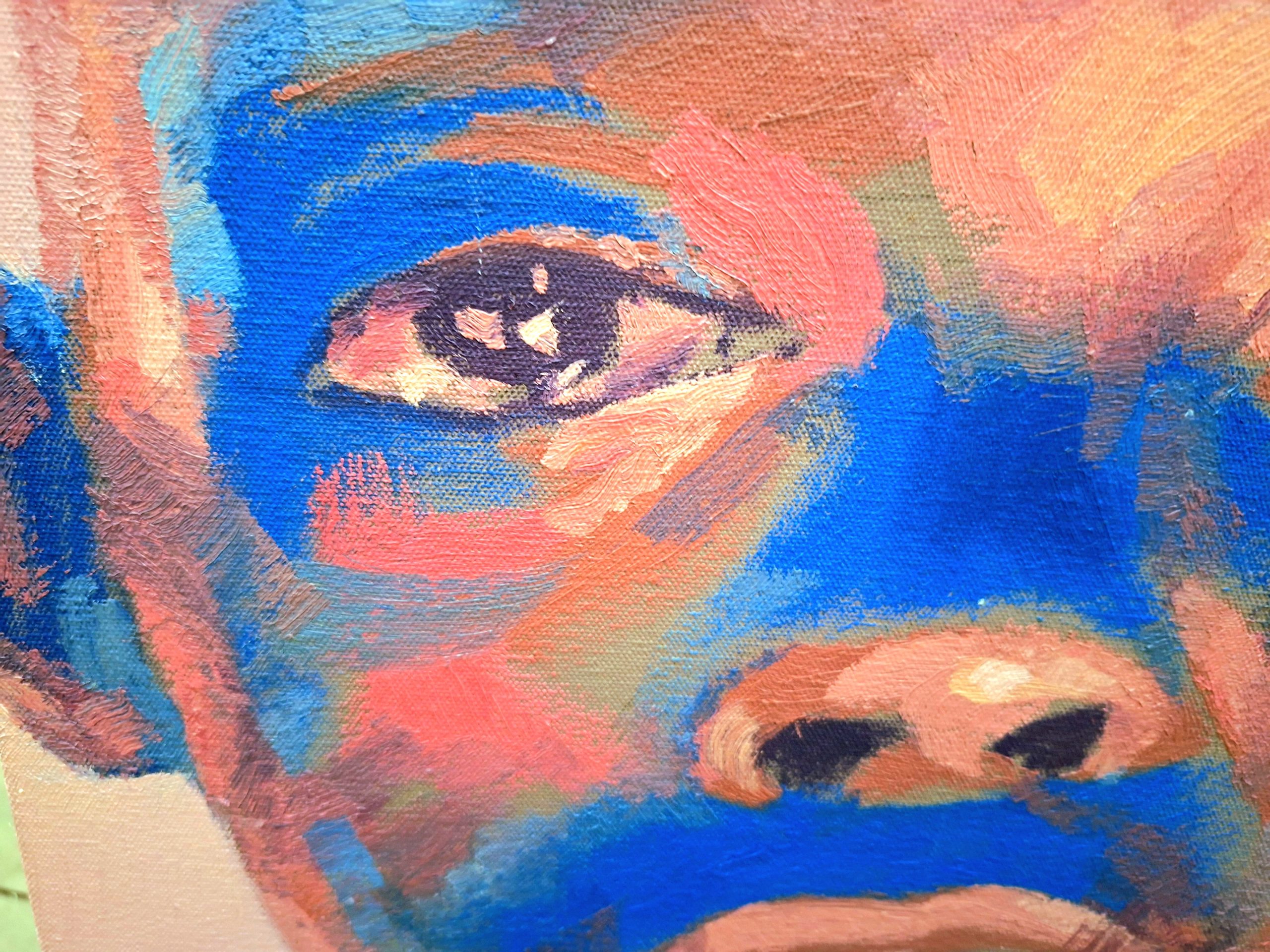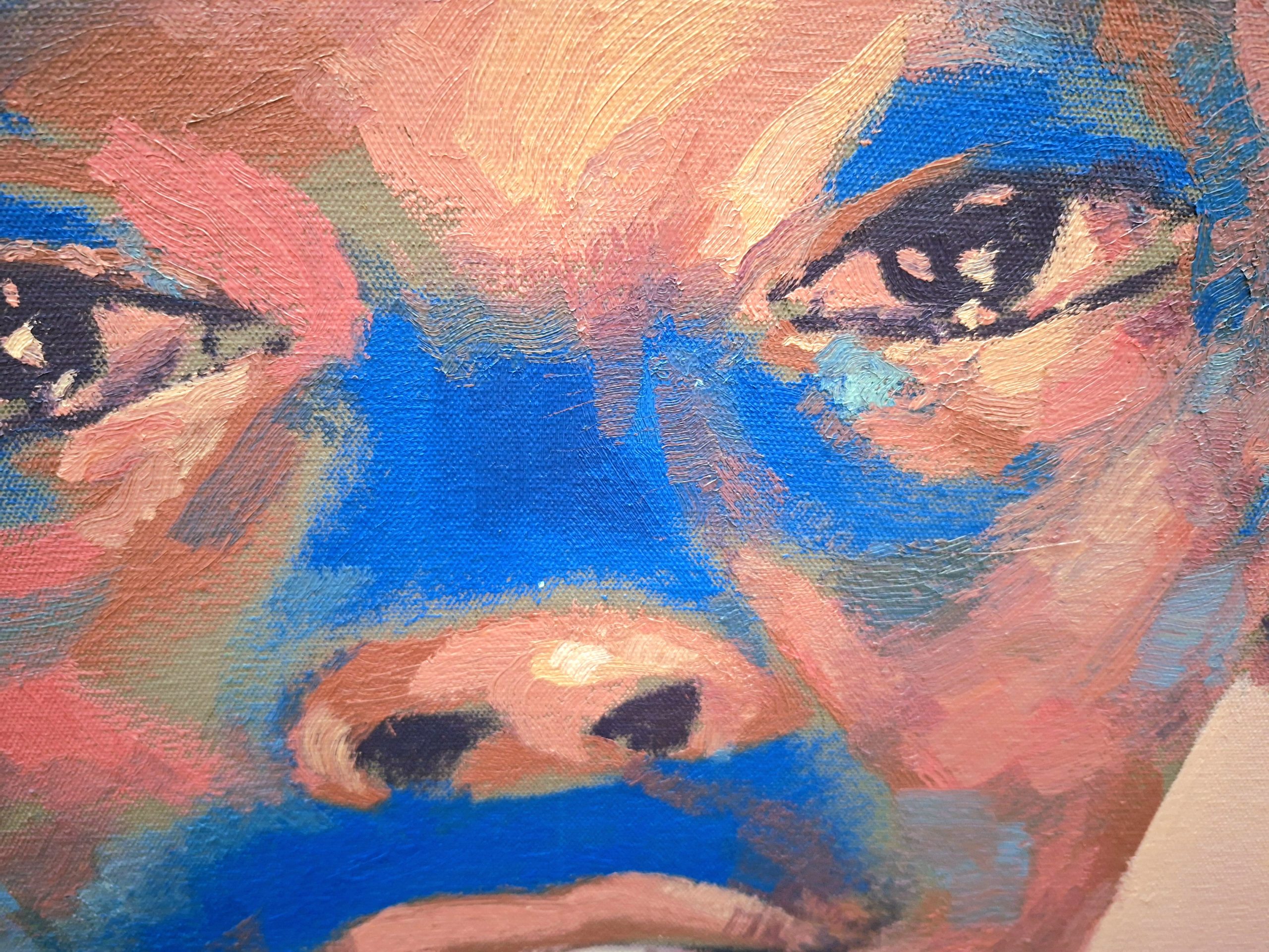 The portrait is defined by a masterly use of contrast, where cool blue tones dominate the central features, set against a warm, vibrant pink environment.