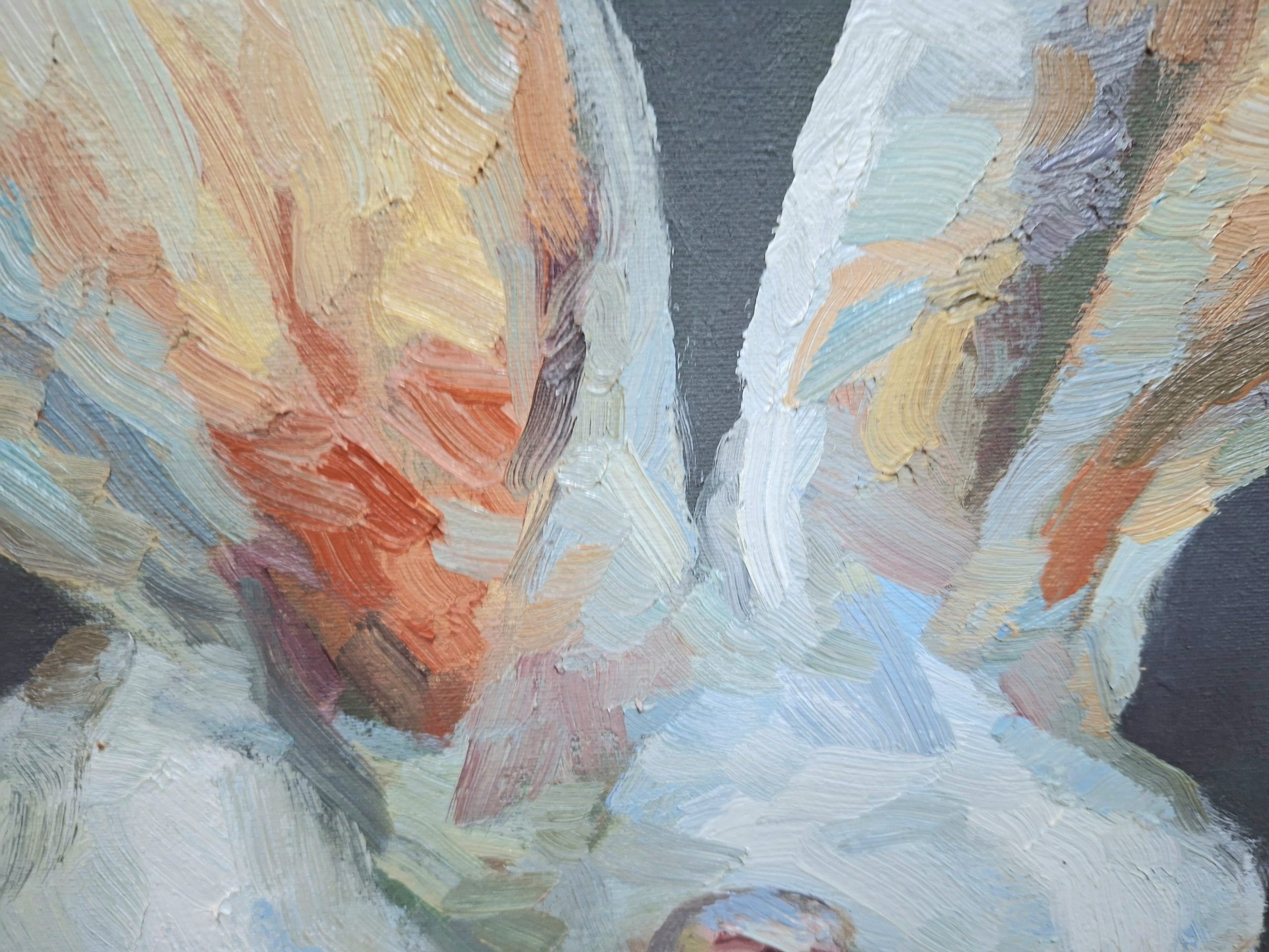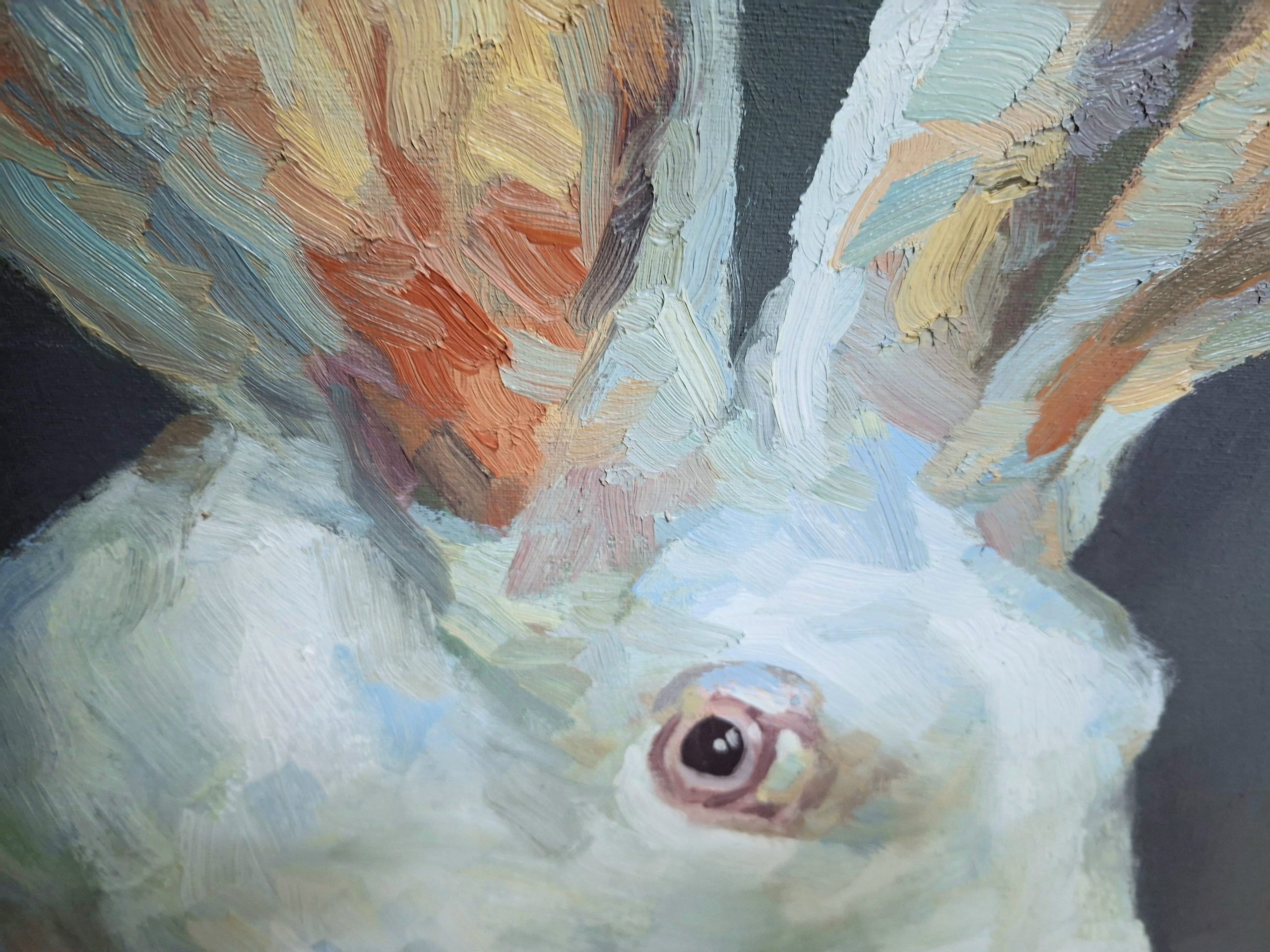 The piece is characterized by its rich, tactile surface, where layers of oil paint create a sculptural quality. The contrast between the rabbit’s bright, luminous fur and the deep, atmospheric background highlights the artist’s focus on light and shadow.