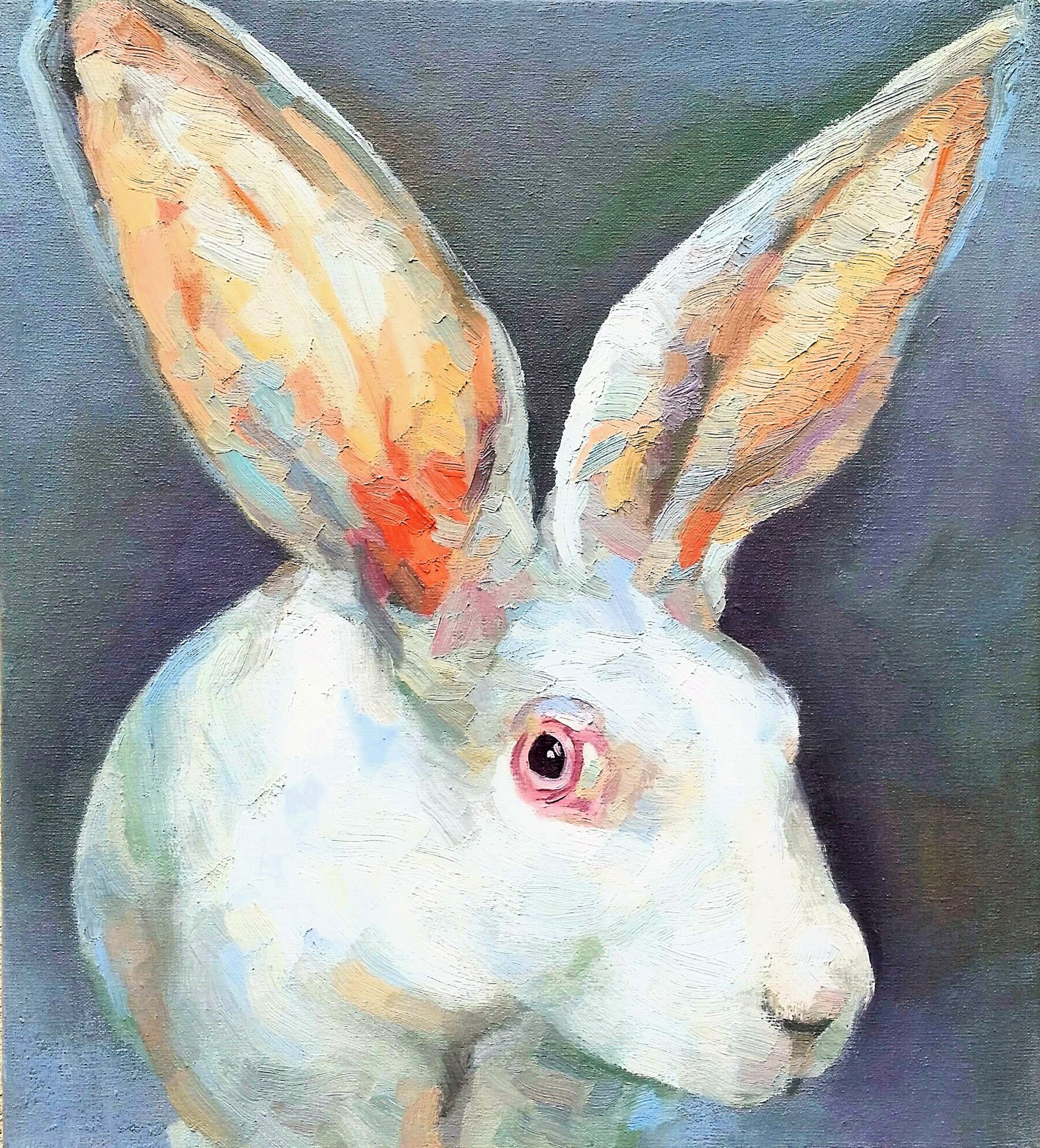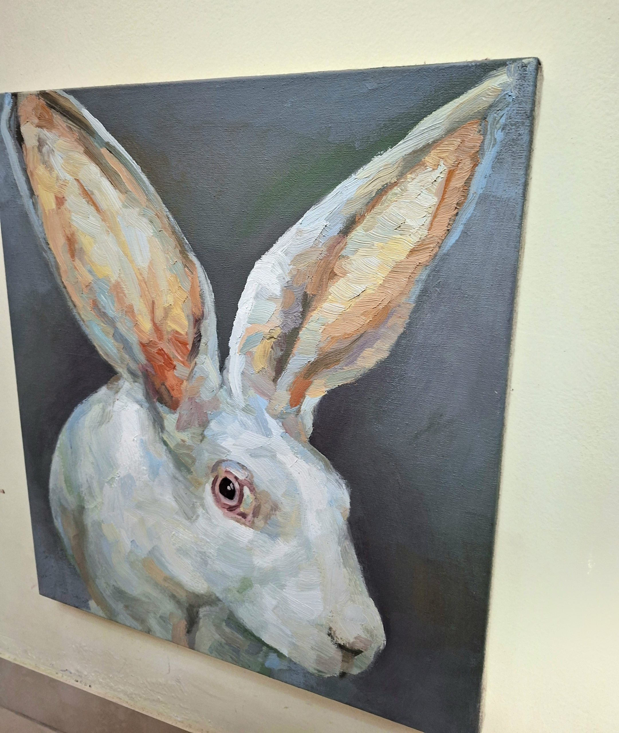A vibrant and textured original oil painting (47.5×43.5×3 cm) on canvas. This captivating piece features a white rabbit in profile, rendered with bold, thick brushstrokes. The play of light on its ears and the soulful gaze of its eye bring a dynamic sense of life and character to this modern wildlife study.